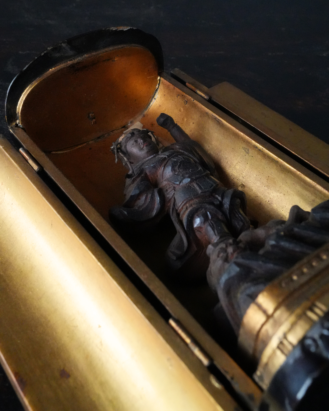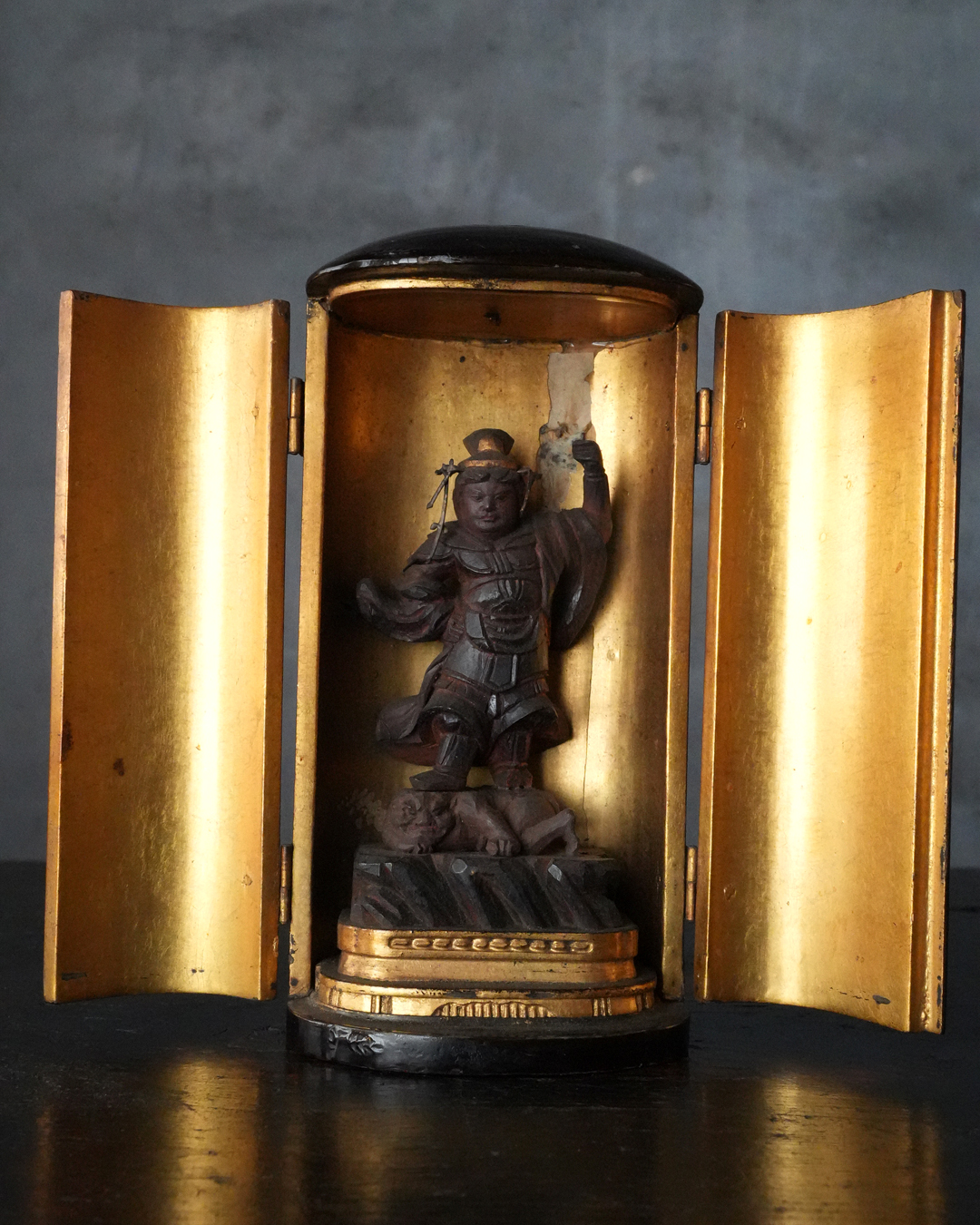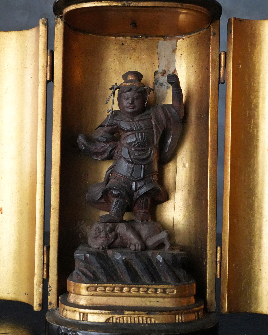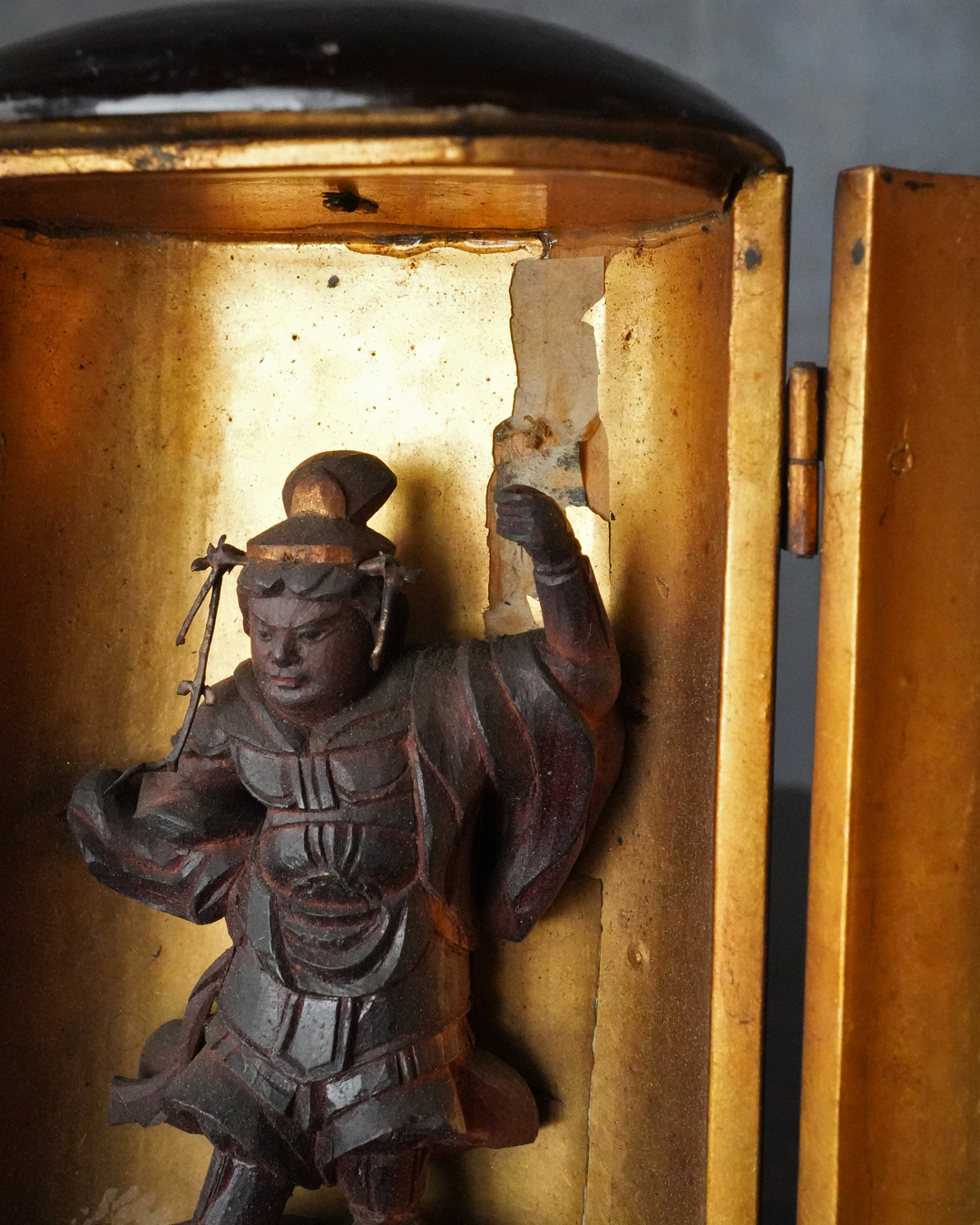 厨子の天井部には過去に破損があったようで接着修理が施されていますが、鑑賞上さほど気になるものではありません。江戸時代。