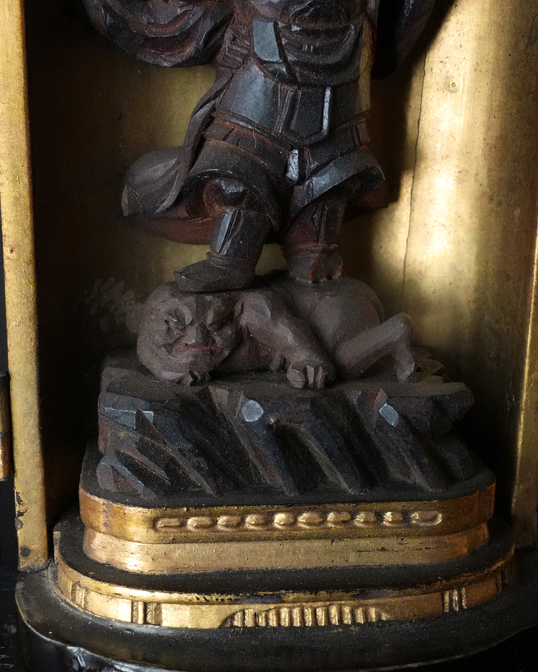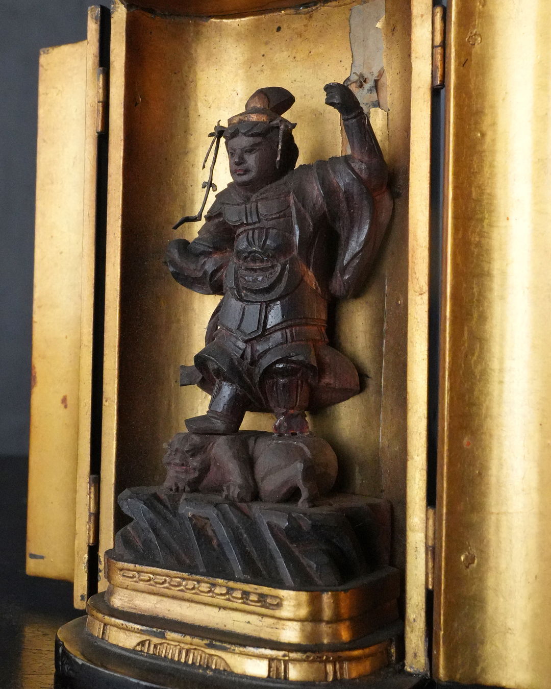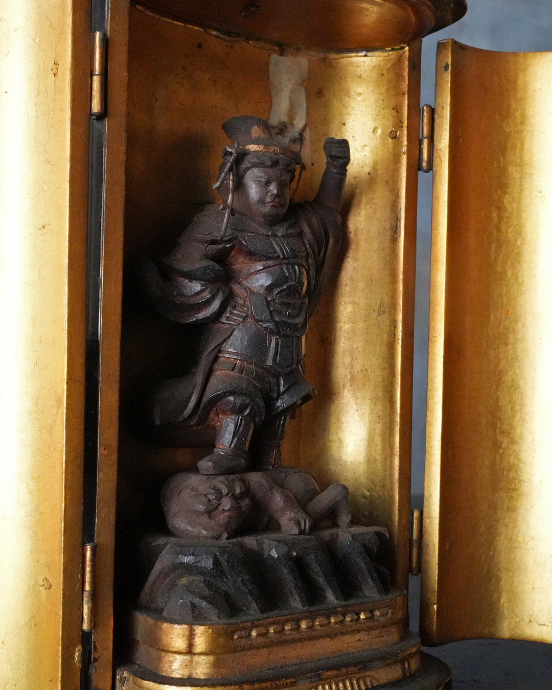 厨子に納められた、小ぶりながら魅力ある毘沙門天立像。持物の欠損が見られ、また経年によるわずかな傷みはございますが、全体として彫りは非常に丁寧で、躍動感のある造形が印象的です。端正で落ち着いた表情、細やかに表された唐風の甲冑、足元に表された餓鬼の姿など、見どころの多い作といえるでしょう。なかでも顔立ちはとりわけ整っており、凛々しく美しい面相は本像の大きな魅力となっています。