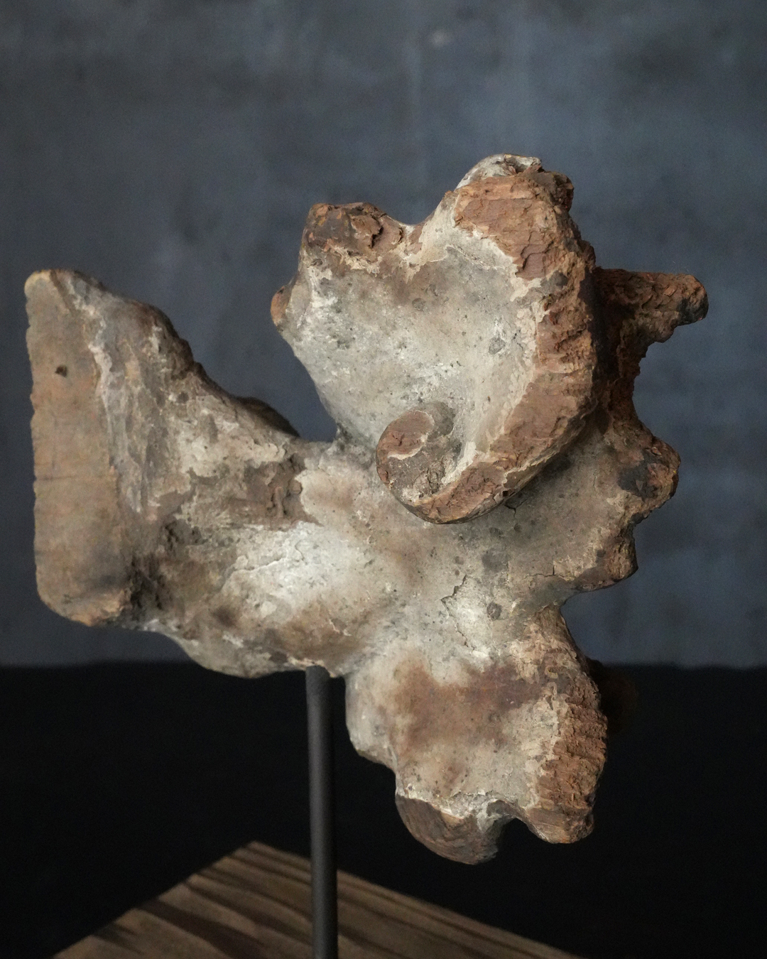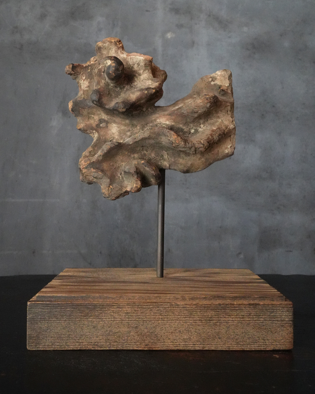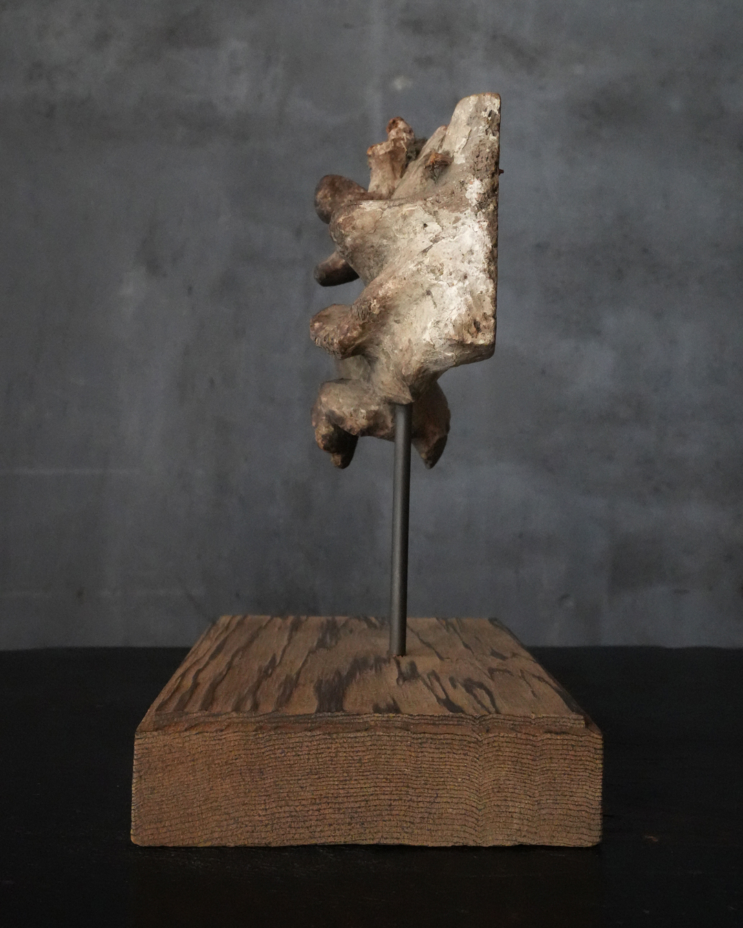 断片ながら造形には古格があり、時代を十分に遡るものと見てよいでしょう。中世期の作と考えられ、個人的には鎌倉時代頃まで上がる可能性も感じられます。台座は前所有者によって後補されたものですが、春日杉を思わせる美しい木目が選ばれており、全体としてよく調和しています。古い仏教美術の一部でありながら、現代の空間においても違和感なく、静かな存在感をもってお楽しみいただける品。