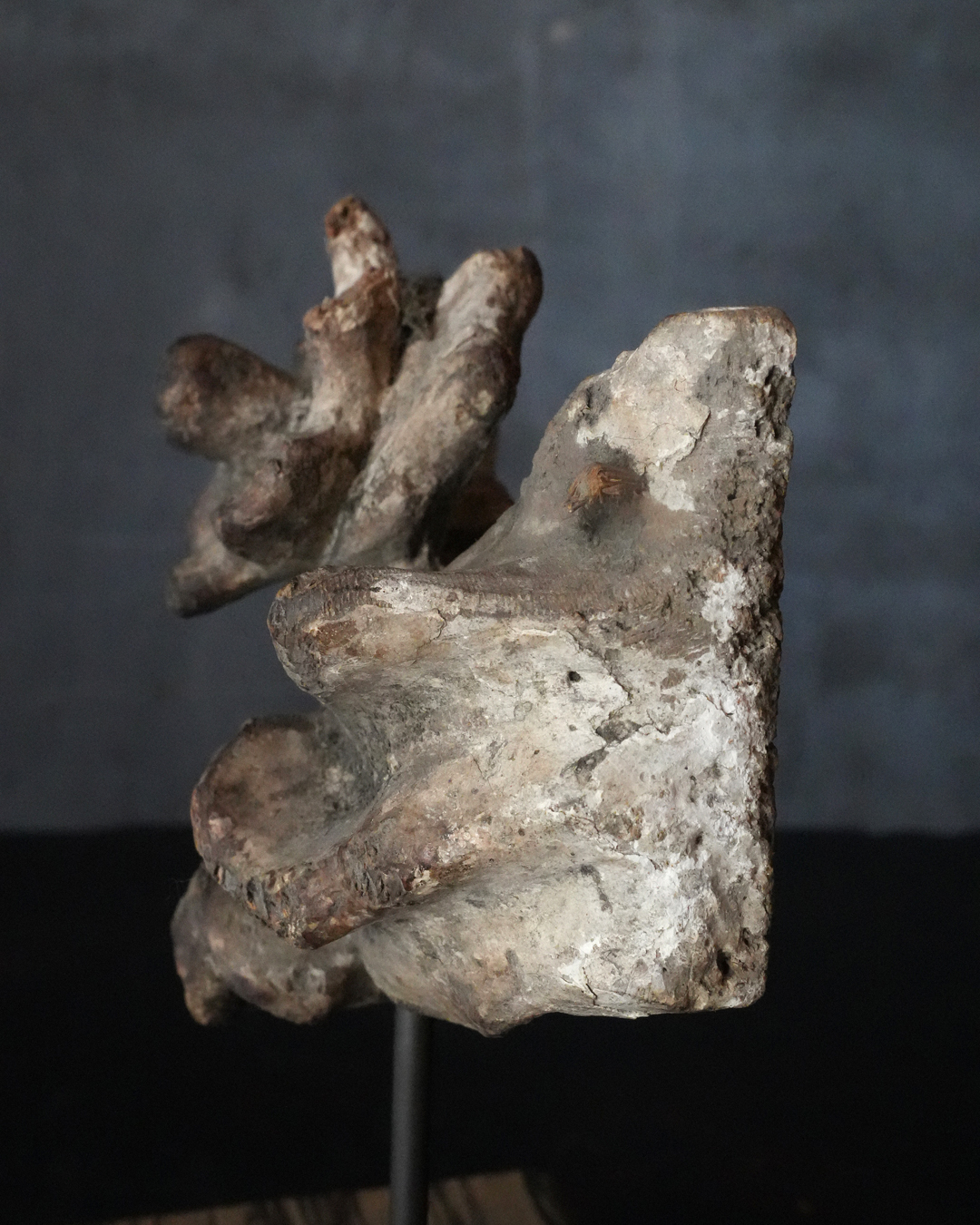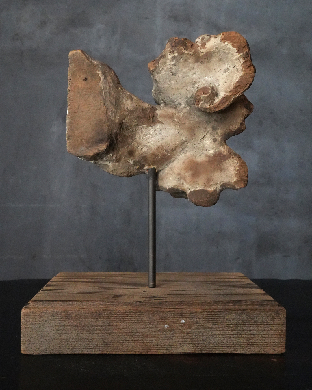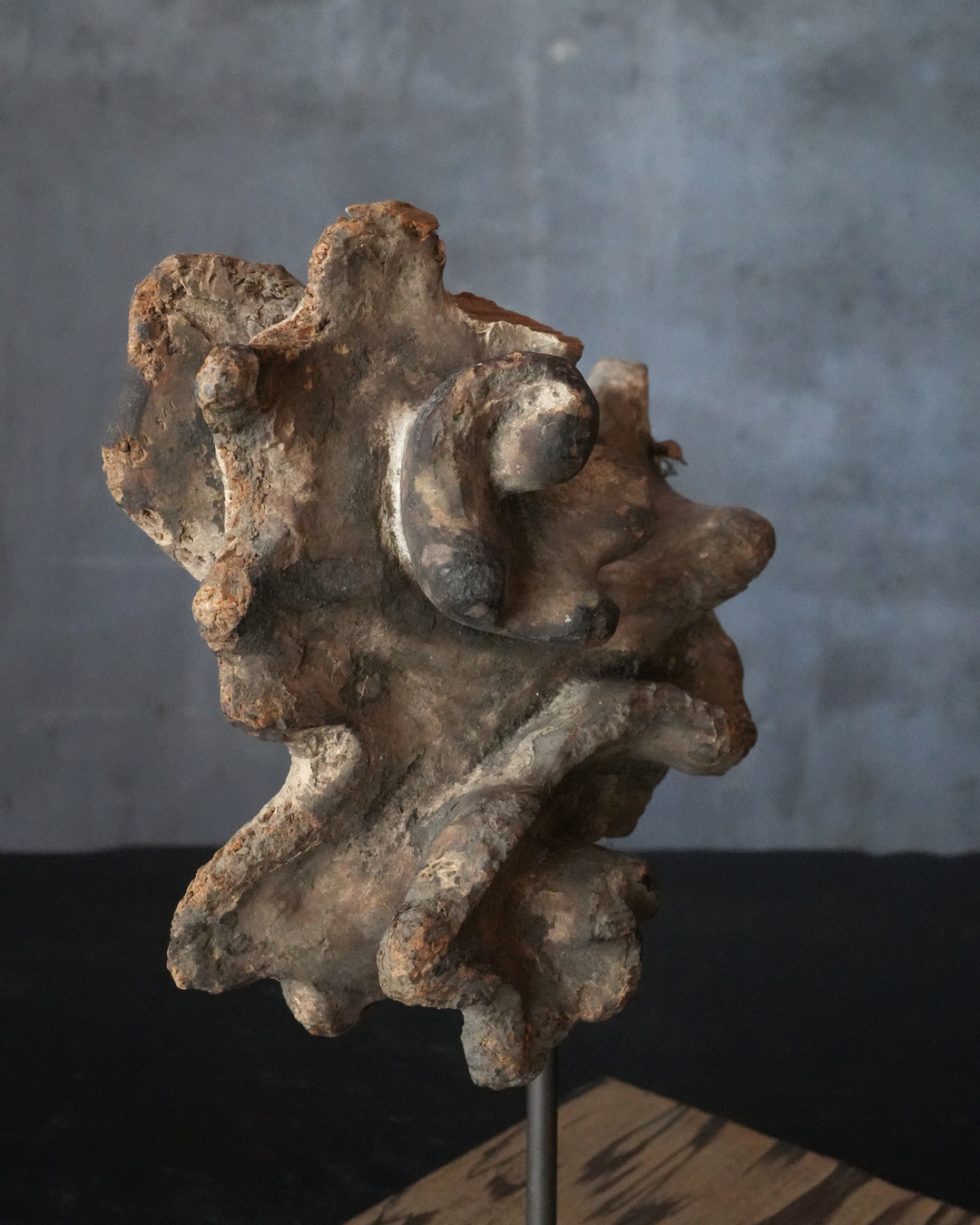 断片ながら造形には古格があり、時代を十分に遡るものと見てよいでしょう。中世期の作と考えられ、個人的には鎌倉時代頃まで上がる可能性も感じられます。台座は前所有者によって後補されたものですが、春日杉を思わせる美しい木目が選ばれており、全体としてよく調和しています。古い仏教美術の一部でありながら、現代の空間においても違和感なく、静かな存在感をもってお楽しみいただける品。