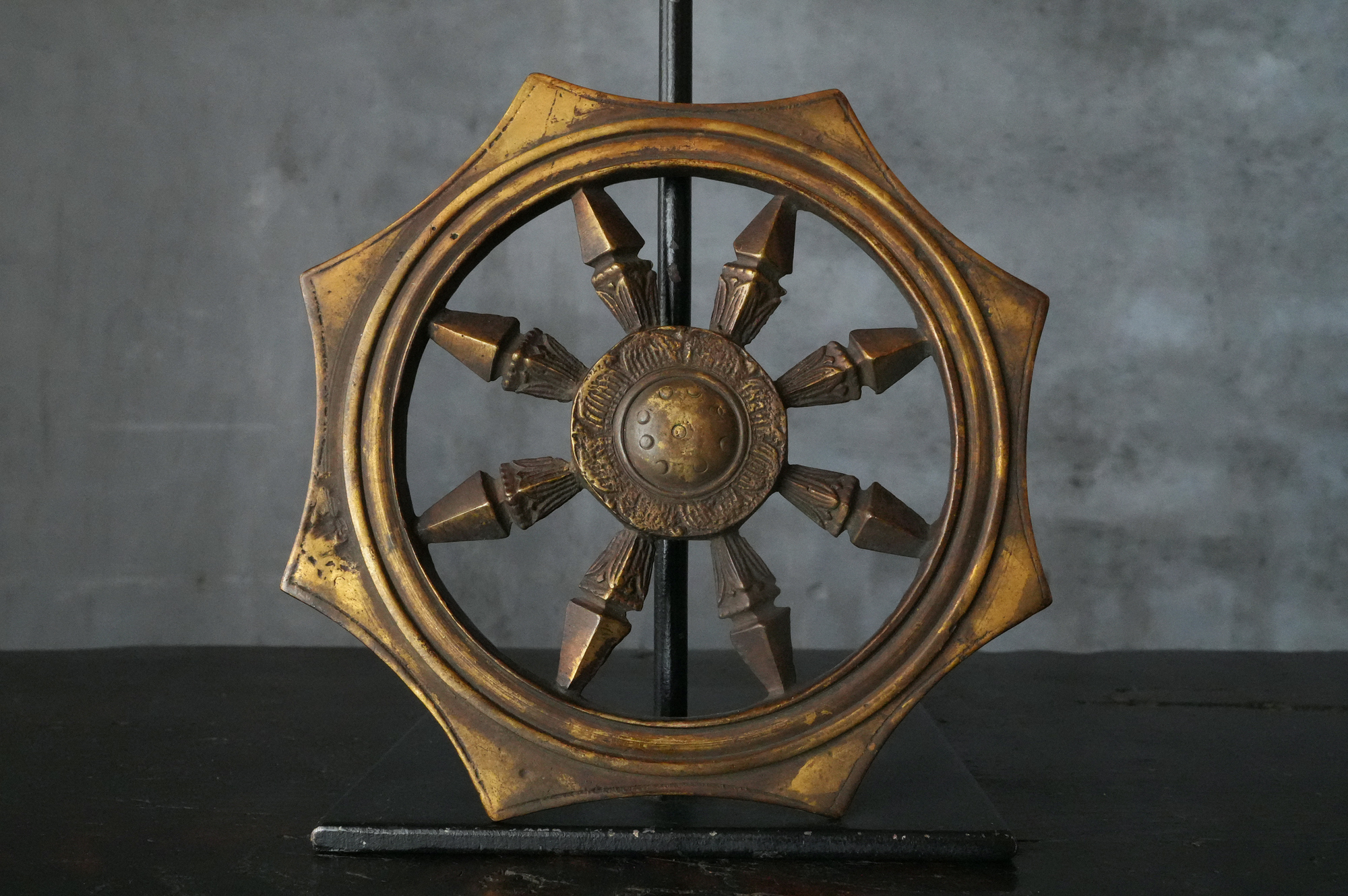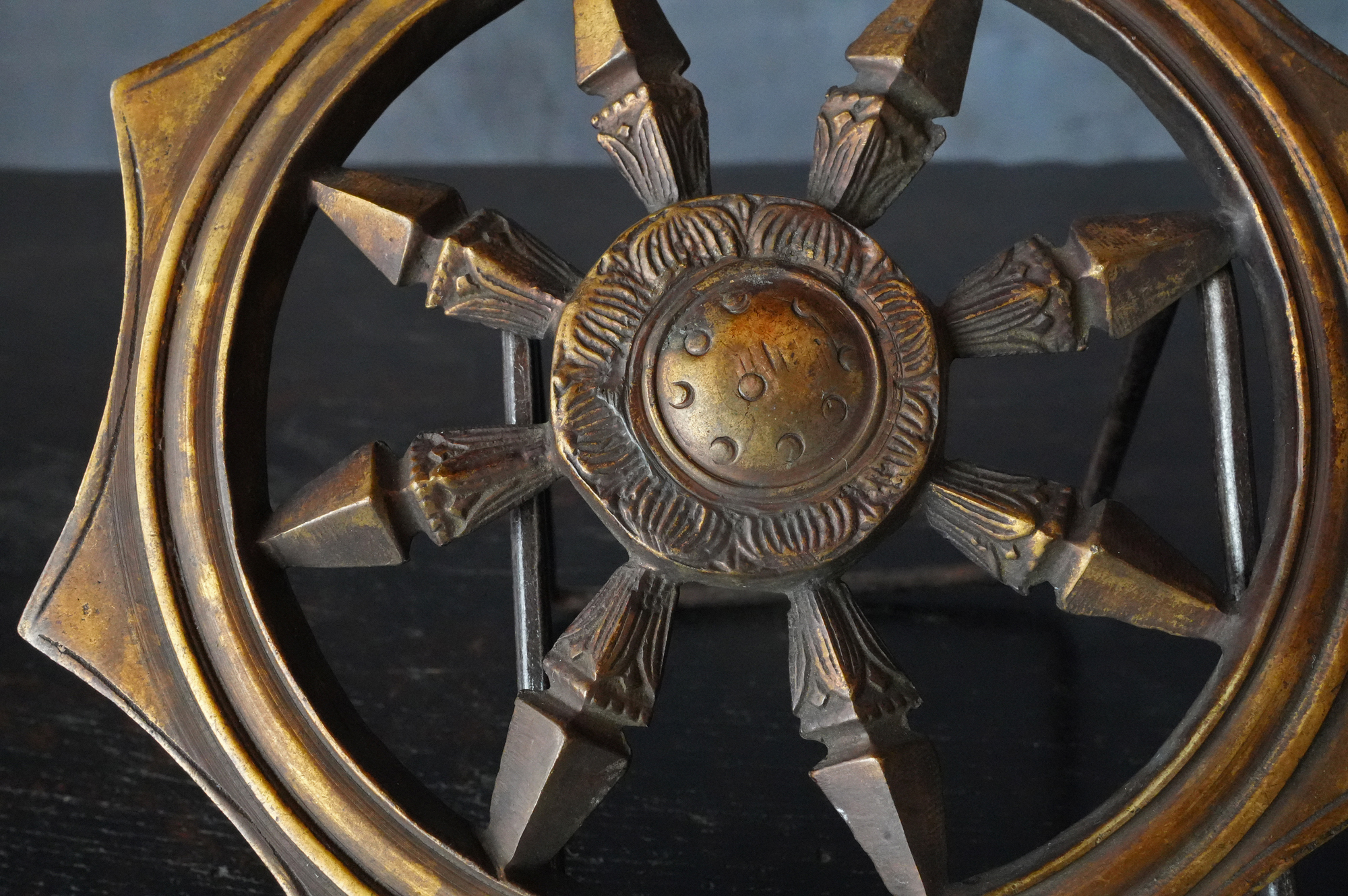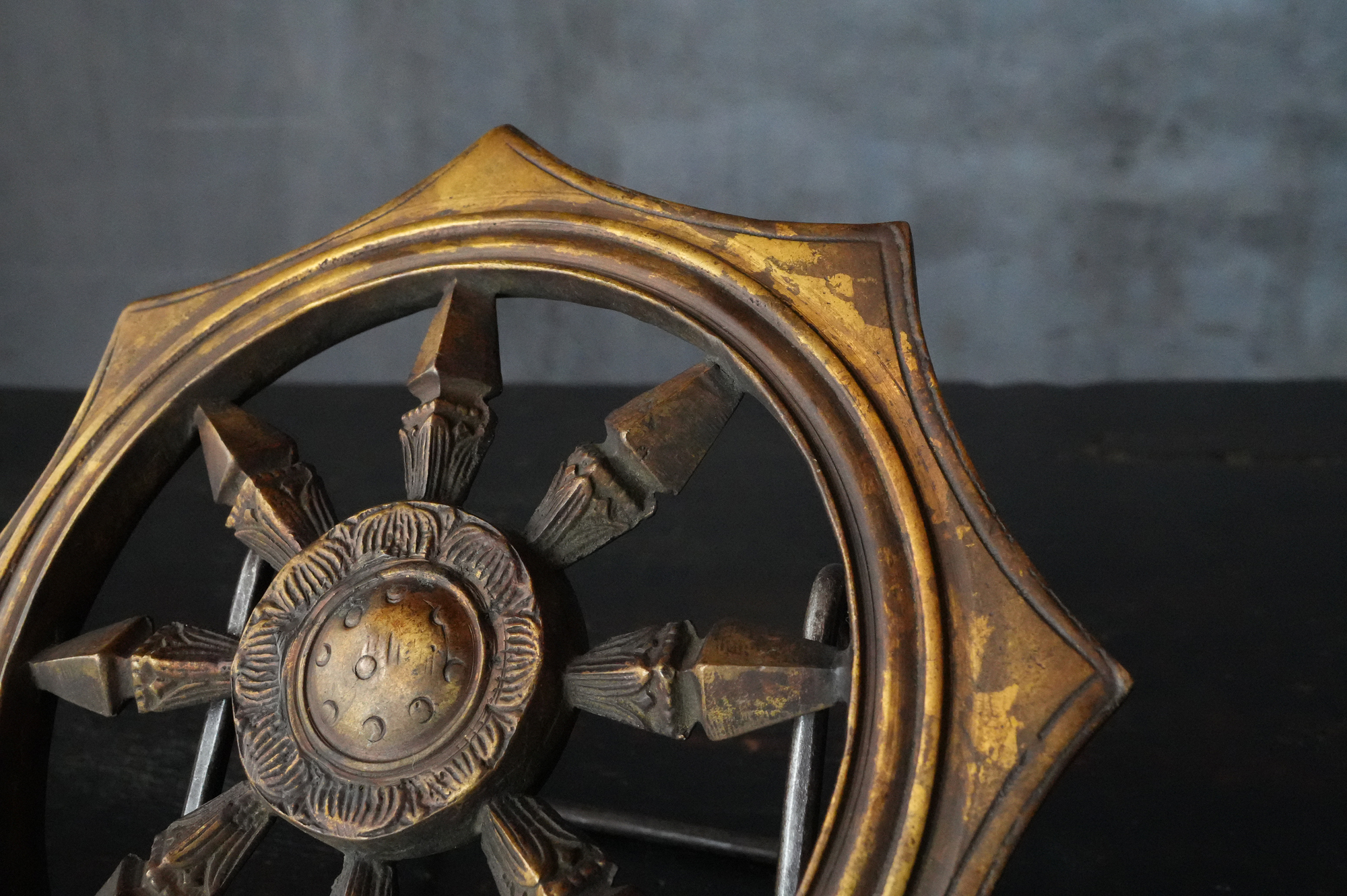 ずしりと手に伝わる確かな重みを感じる密教法具の一つである輪宝。場の空気を引き締めるような存在感を備えています。細部に目を凝らせば、鋳造にはやや大らかな揺らぎが見られ、材もどこか硬質で、精緻さ一辺倒ではない素朴な味わいが感じられ、こうした点から、制作は江戸から明治期にかけてのものと思います。
