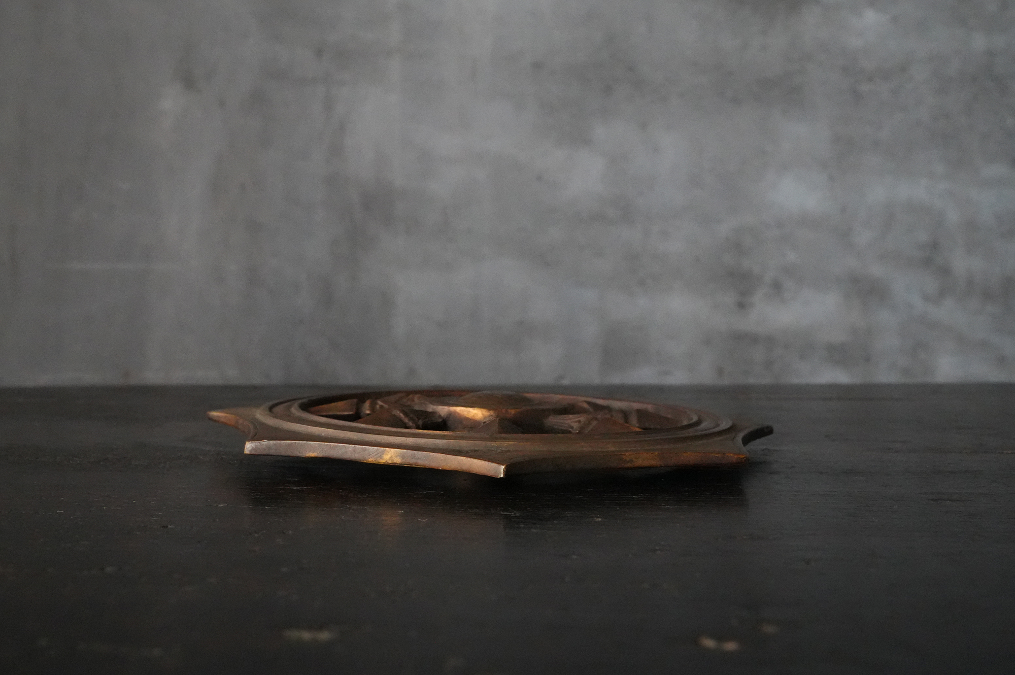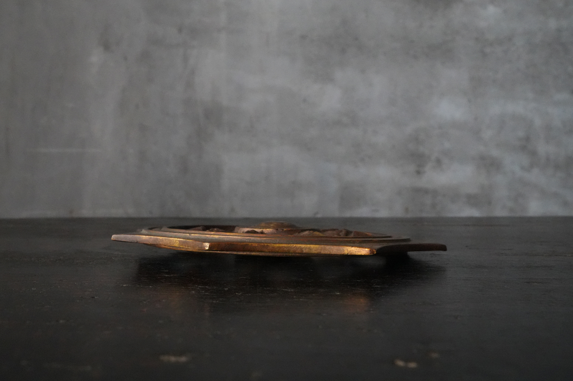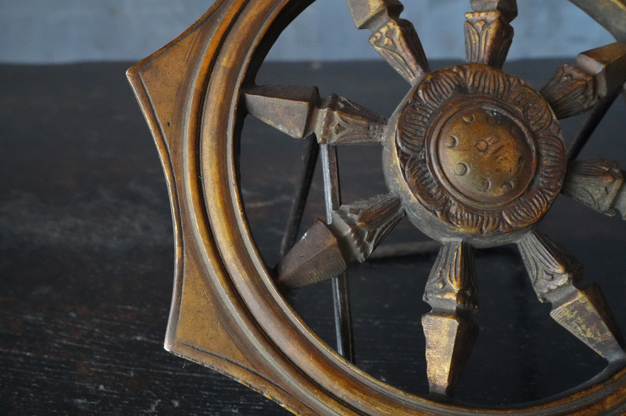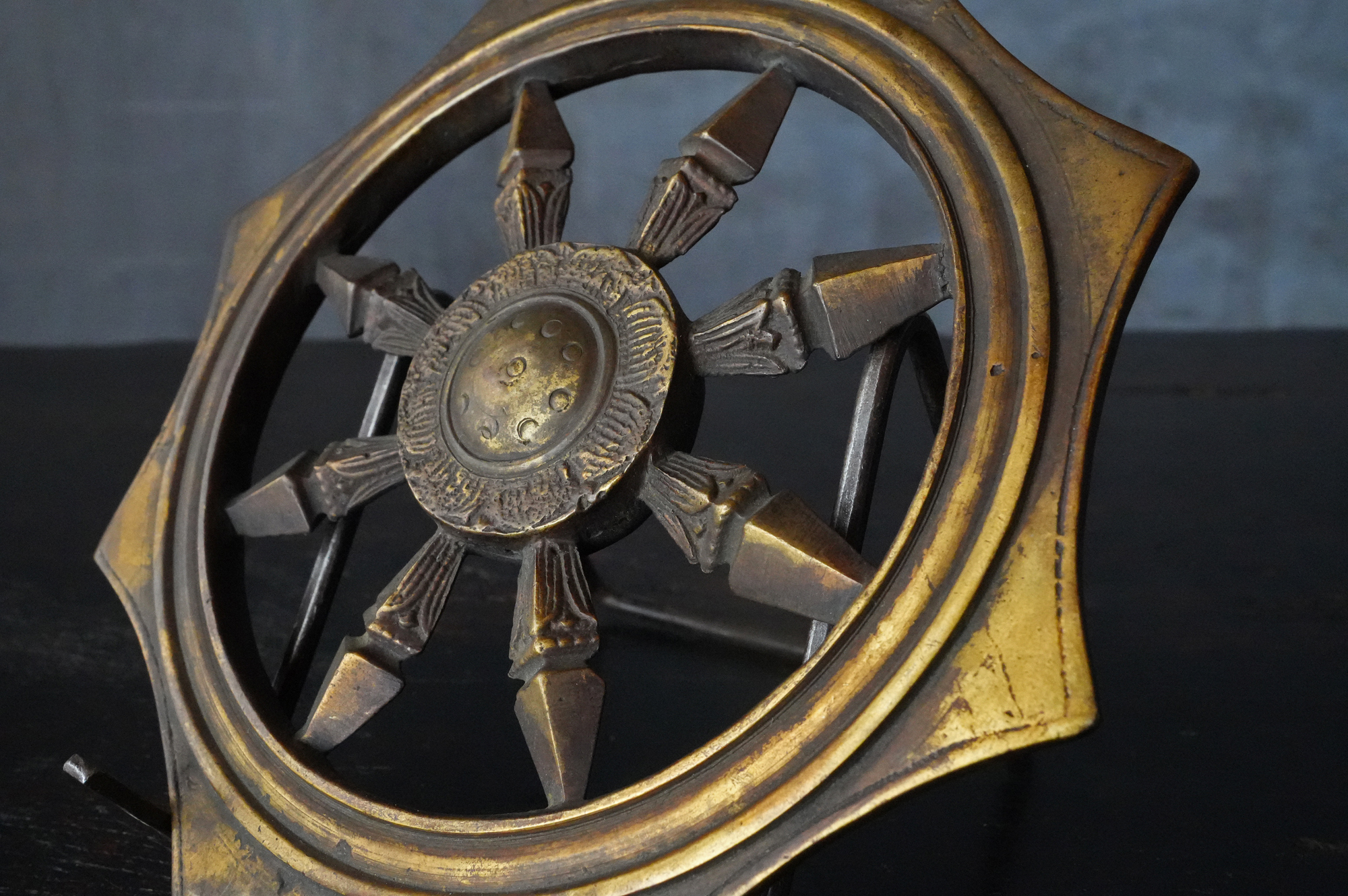 ずしりと手に伝わる確かな重みを感じる密教法具の一つである輪宝。場の空気を引き締めるような存在感を備えています。細部に目を凝らせば、鋳造にはやや大らかな揺らぎが見られ、材もどこか硬質で、精緻さ一辺倒ではない素朴な味わいが感じられ、こうした点から、制作は江戸から明治期にかけてのものと思います。