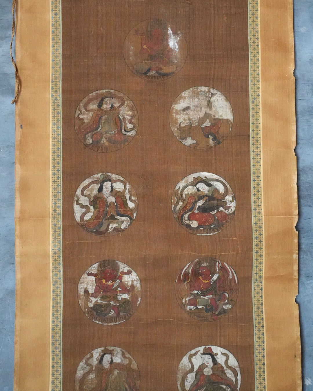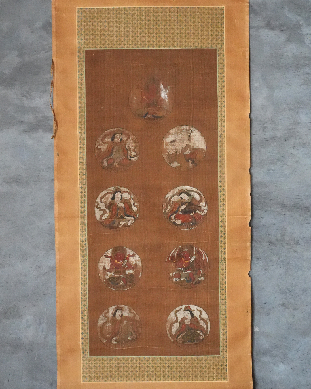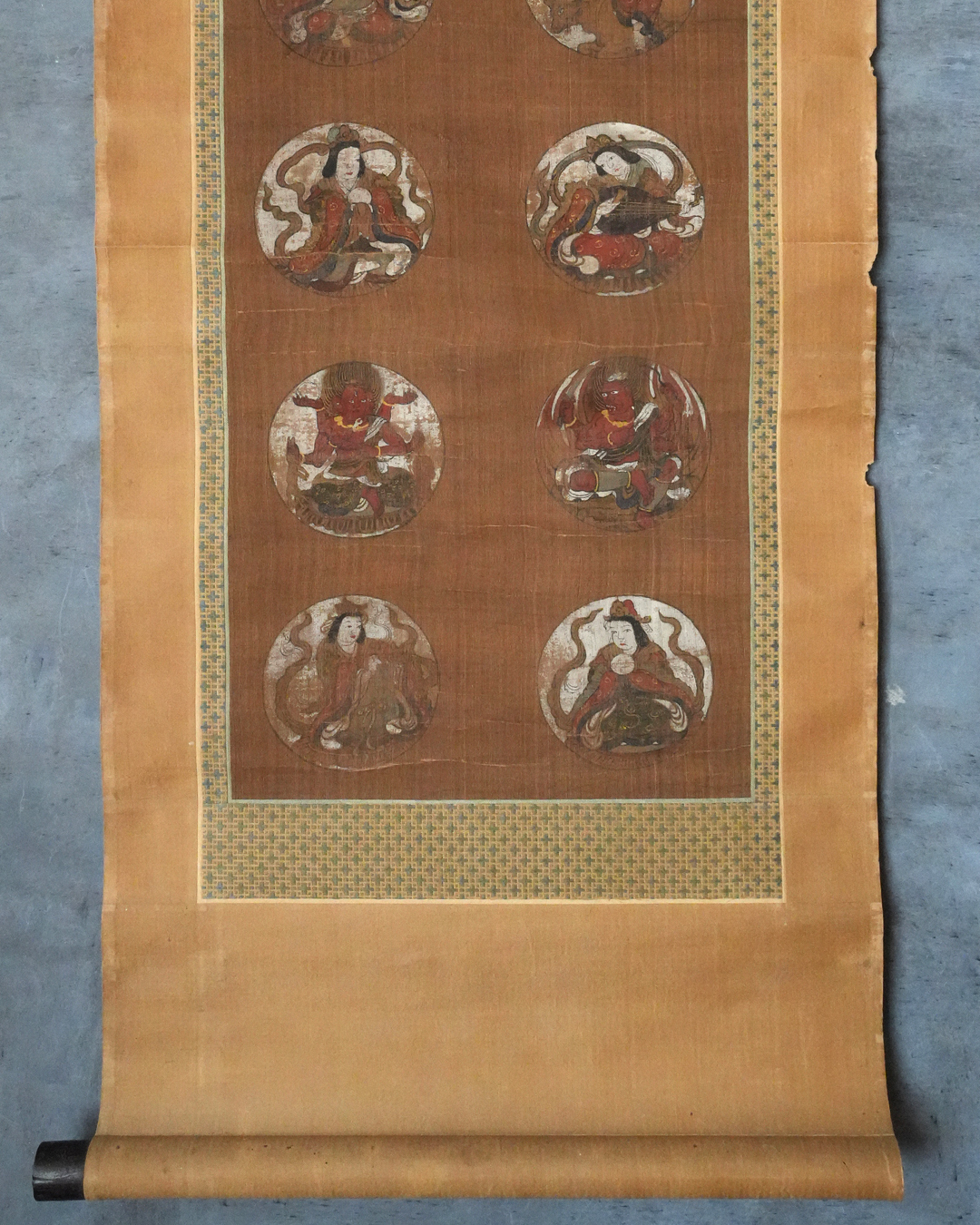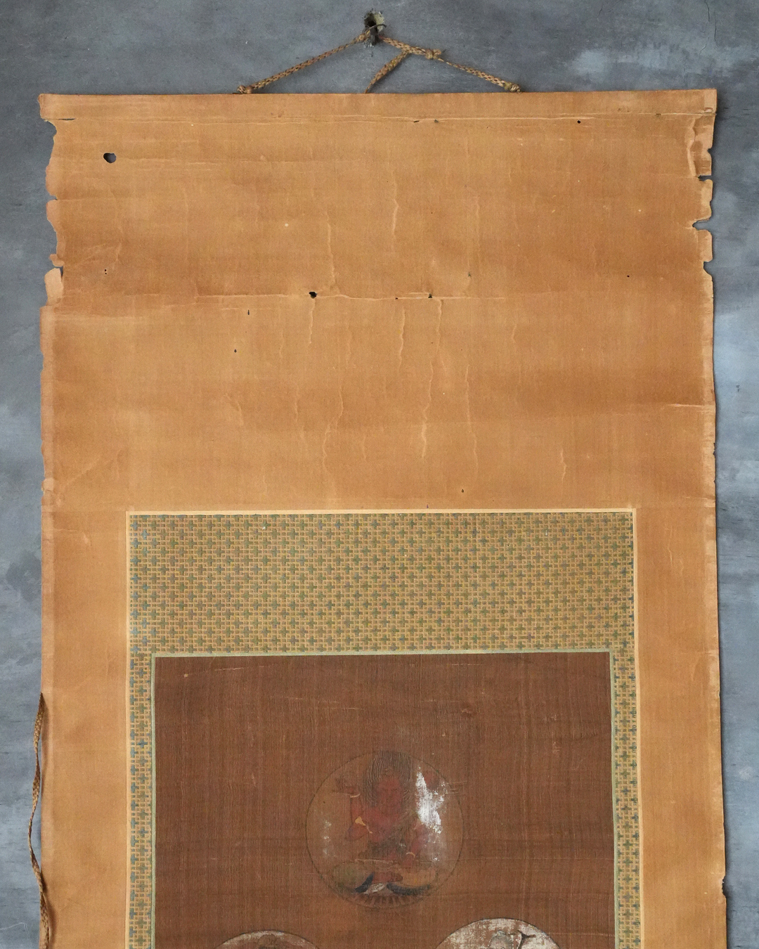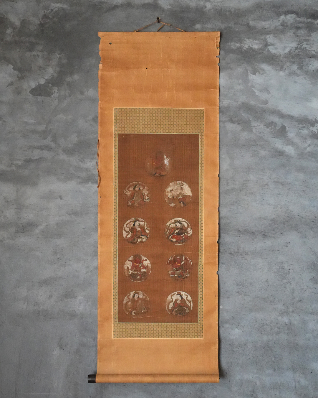彩色の剥落や絹地の傷み、表具の小穴、軸先の一部欠損など、経年による変化は見受けられますが、いずれも時代を経た作品として無理のない範囲であり、鑑賞の妨げとなるものではございません。