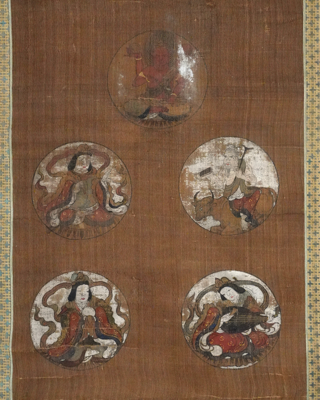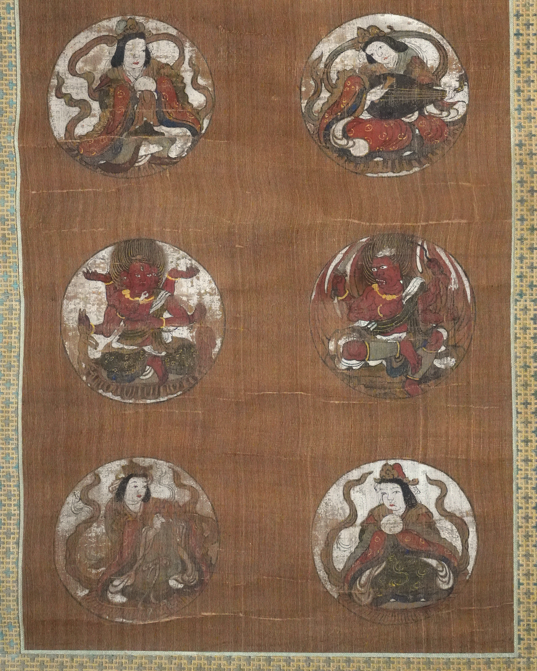 星曼荼羅は、天の諸星と仏教の諸尊とを結びつけて表したもので、本品はそのうち九尊を配した九曜星曼荼羅の一幅。小ぶりの画面ながら、絹本着色による穏やかな彩りがよく残り、静かな趣を感じさせます。