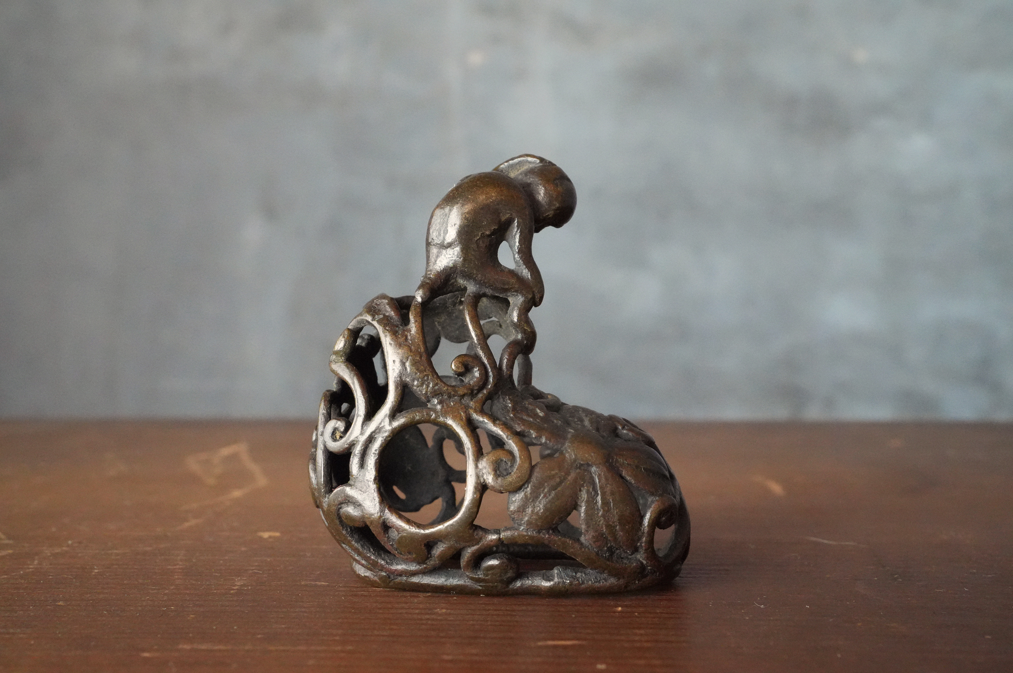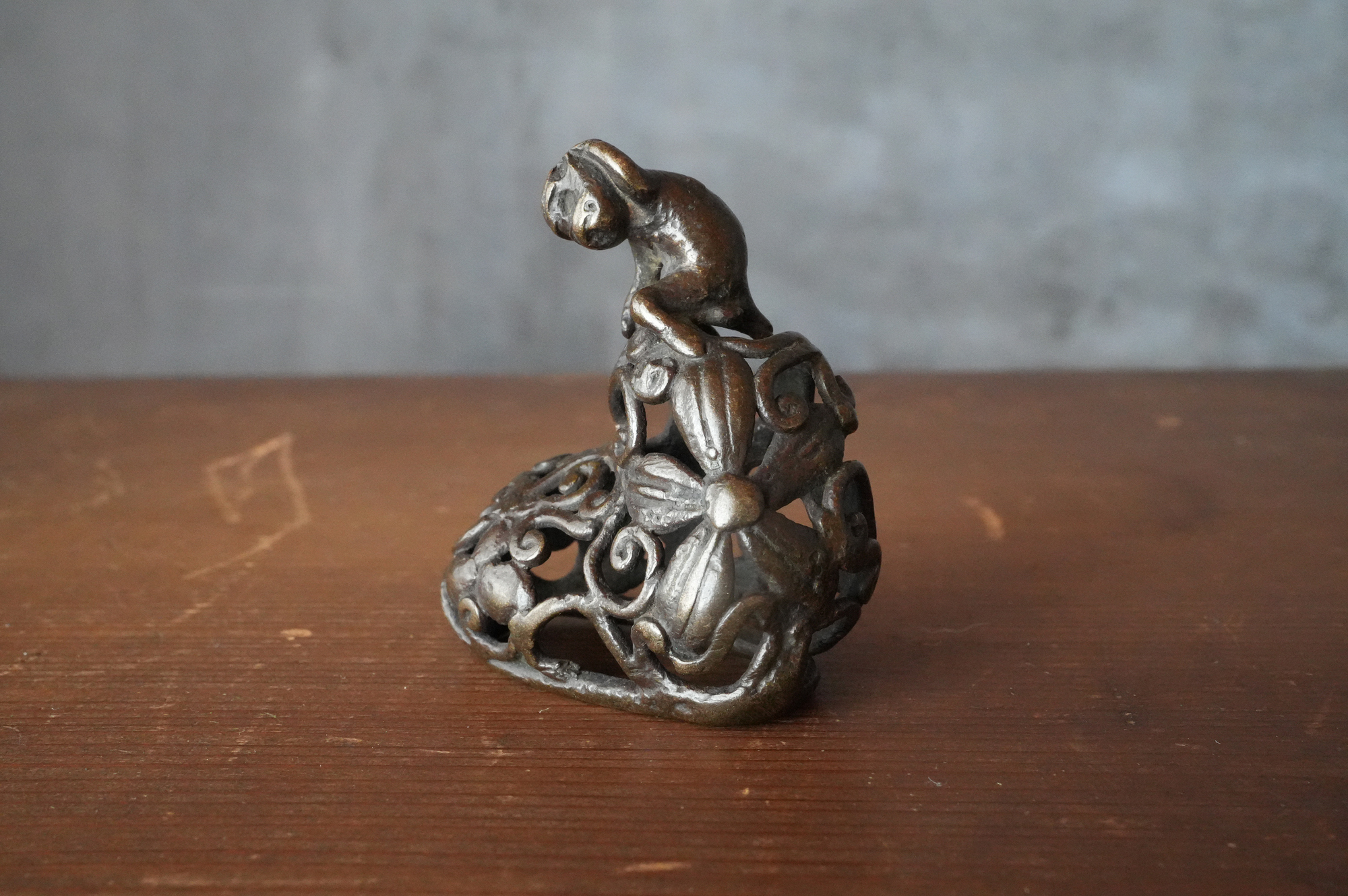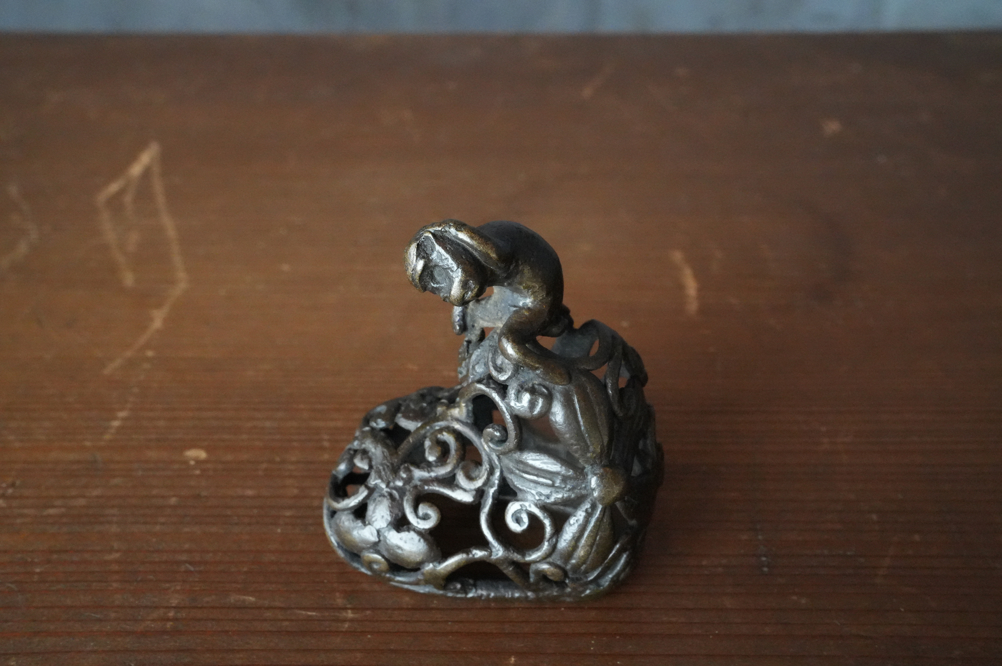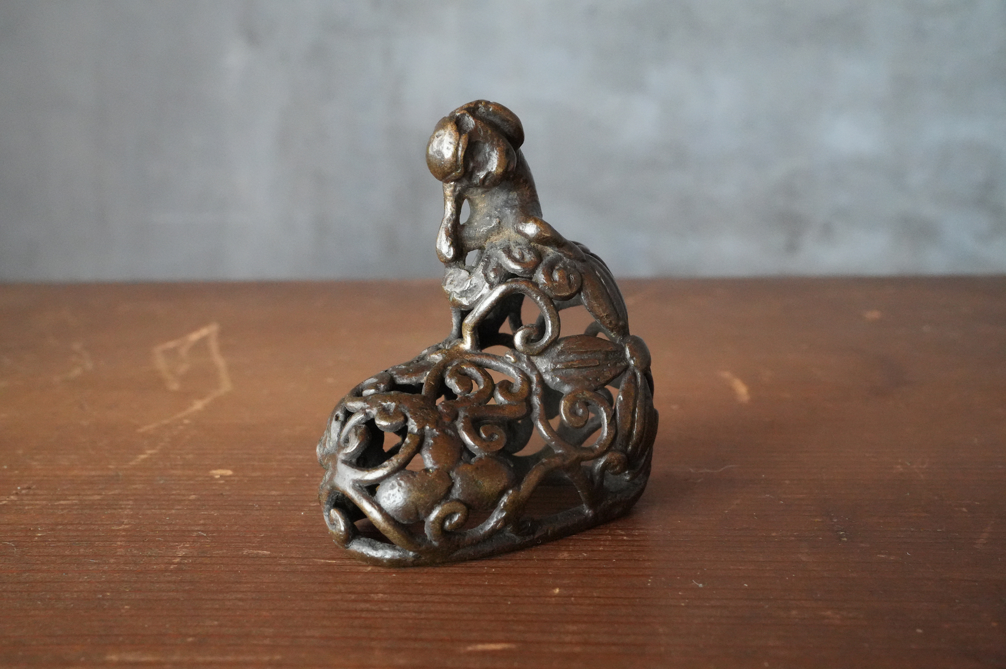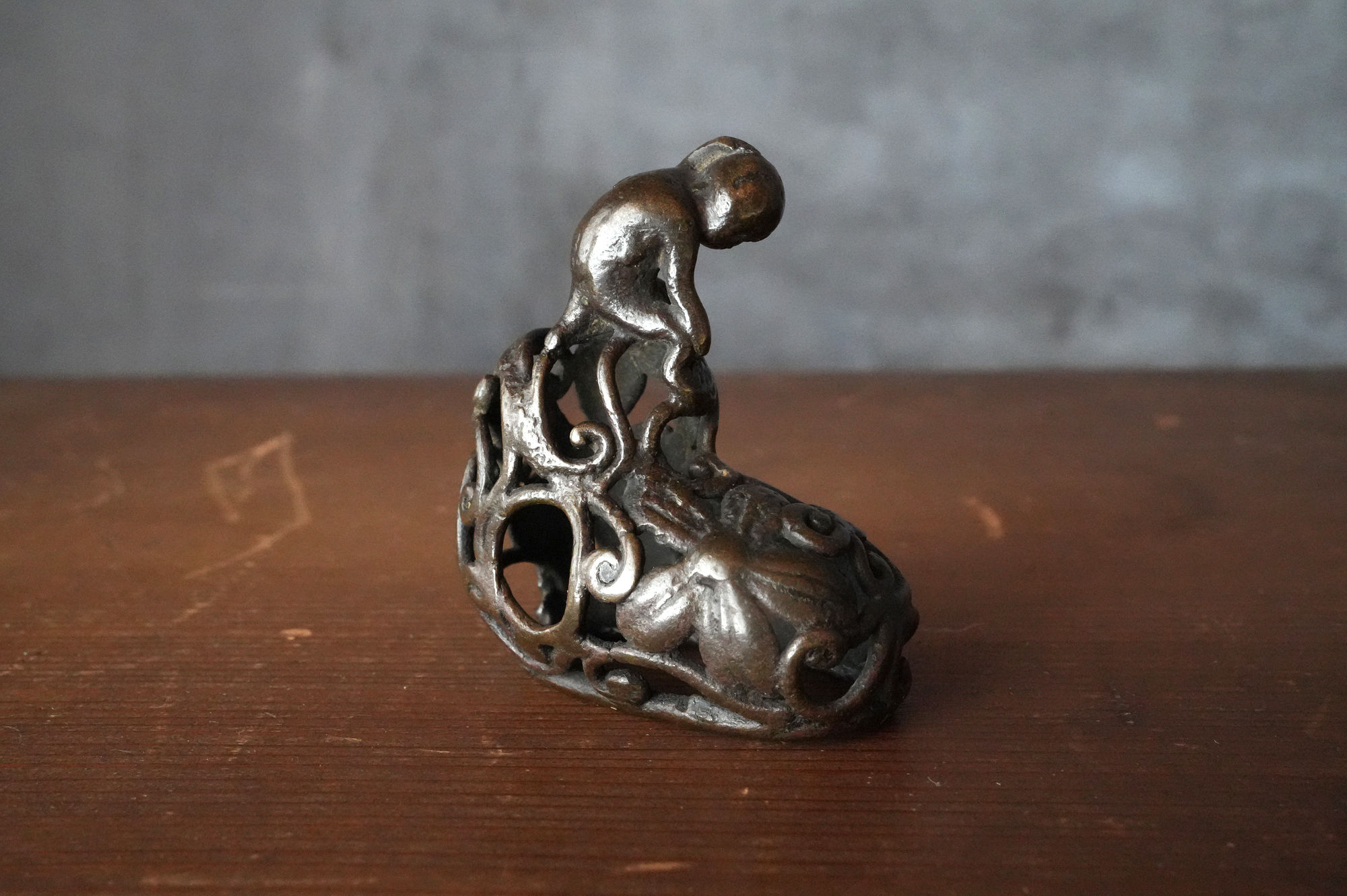 唐草の透かし風の台の上に、猿が腰掛けて左手で頭を掻いている姿が表されていますが、仕草が実に素朴で、どこか親しみを感じさせます。作り手が日常の中で見た動きを、そのまま写し取ったような親しみやすさがあります。