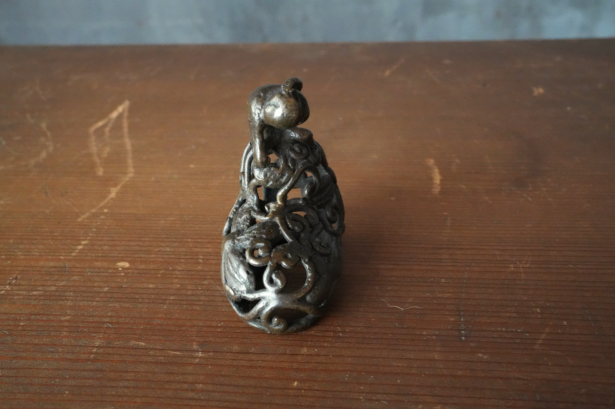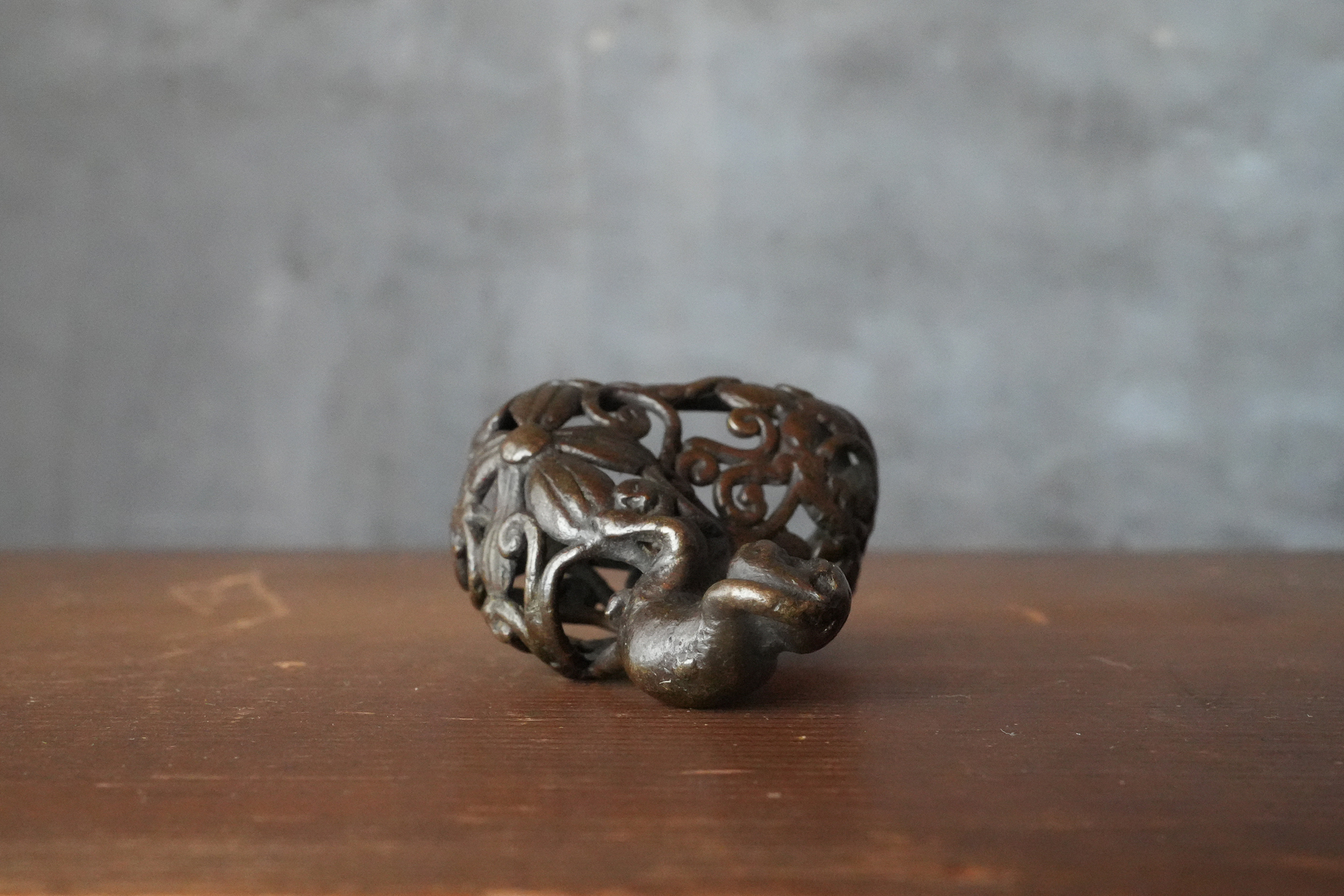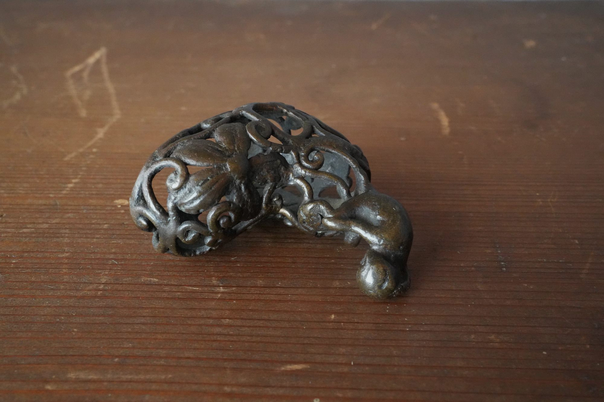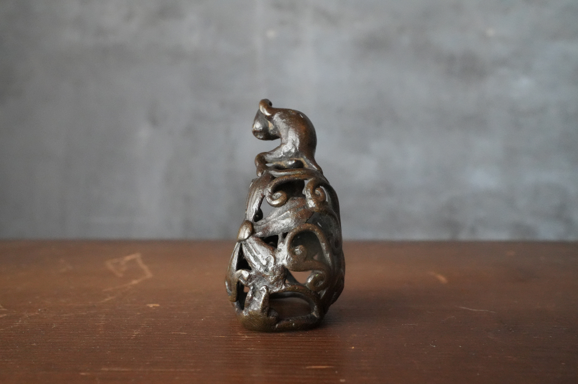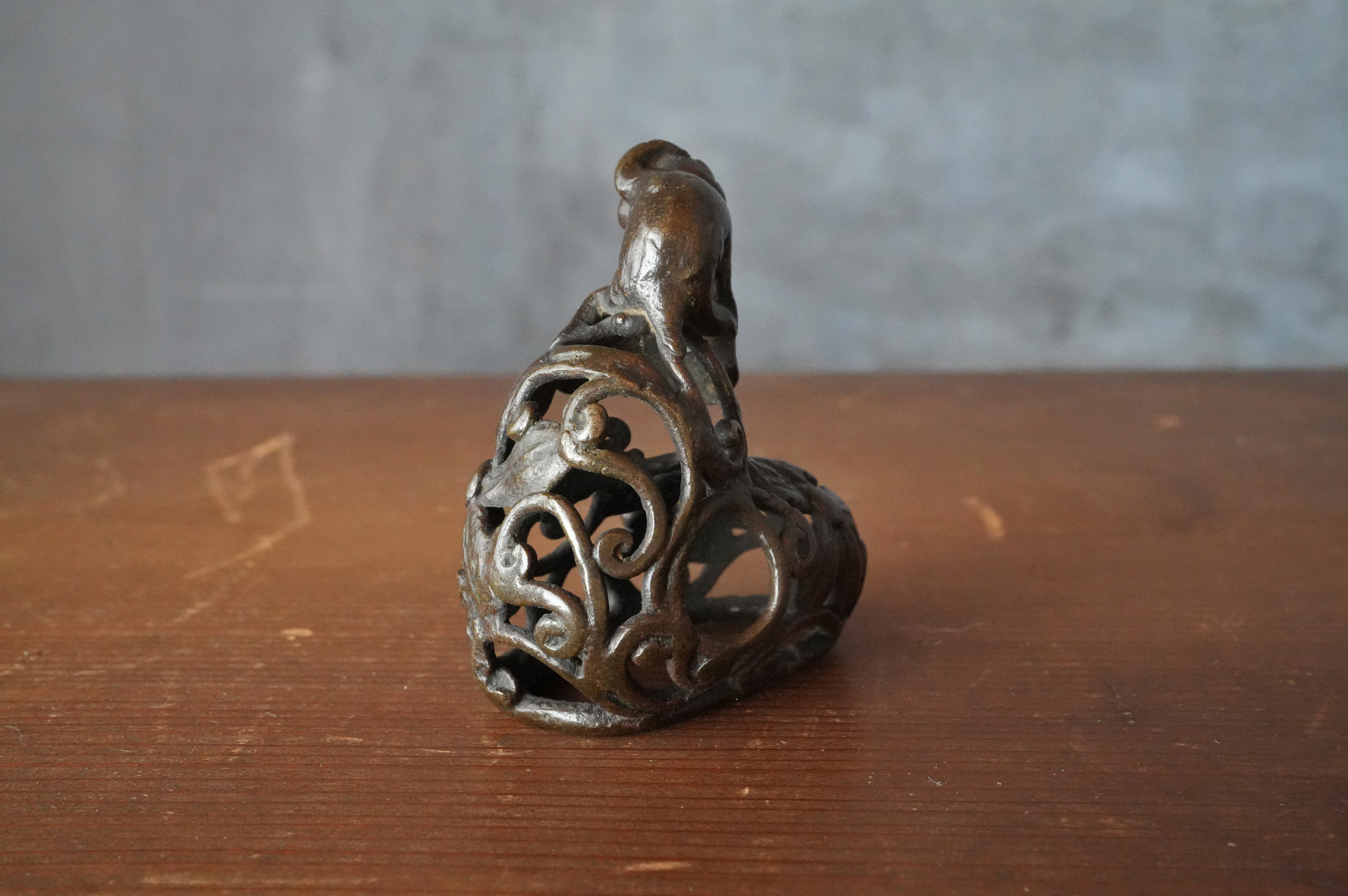 唐草の透かし風の台の上に、猿が腰掛けて左手で頭を掻いている姿が表されていますが、仕草が実に素朴で、どこか親しみを感じさせます。作り手が日常の中で見た動きを、そのまま写し取ったような親しみやすさがあります。