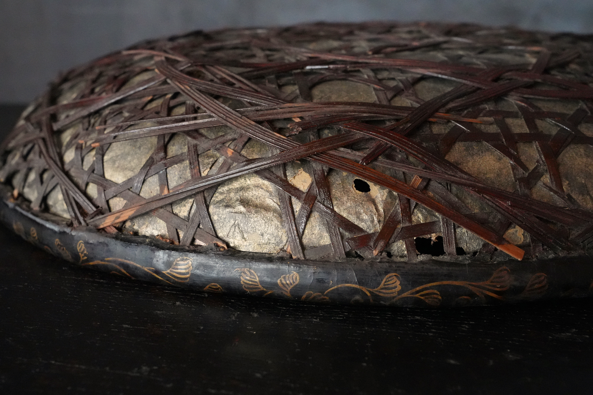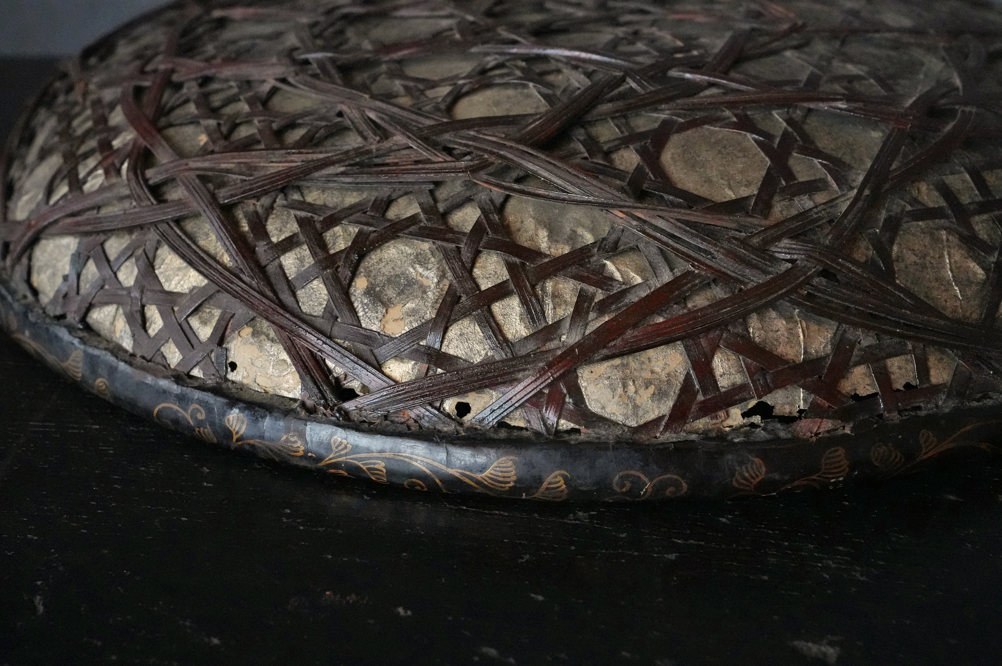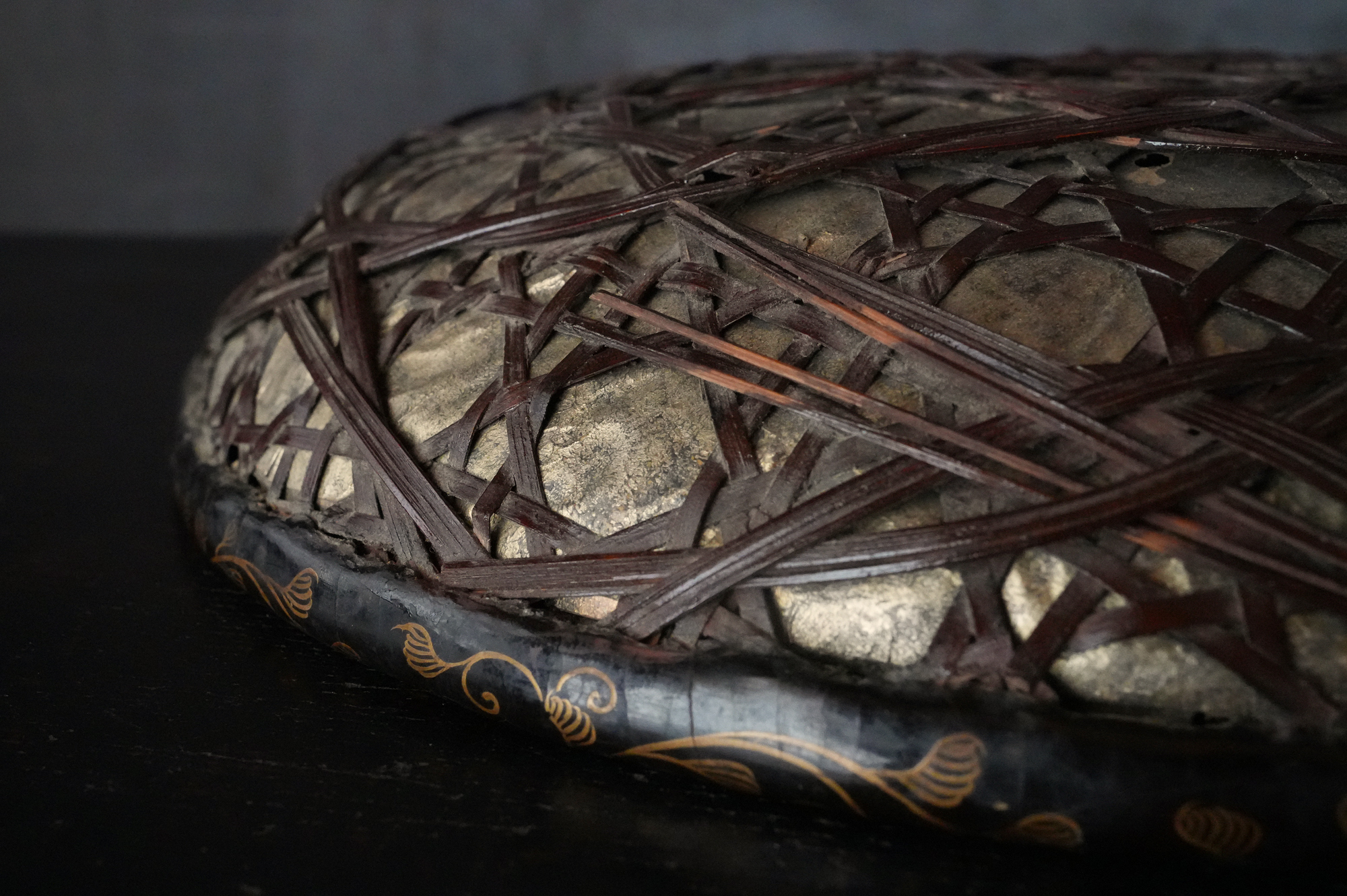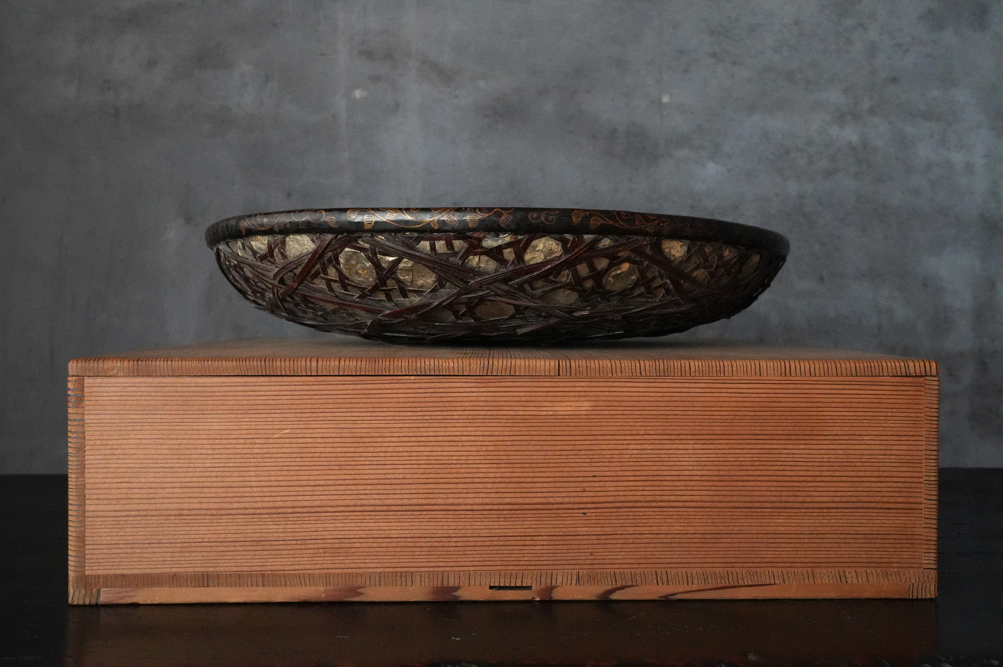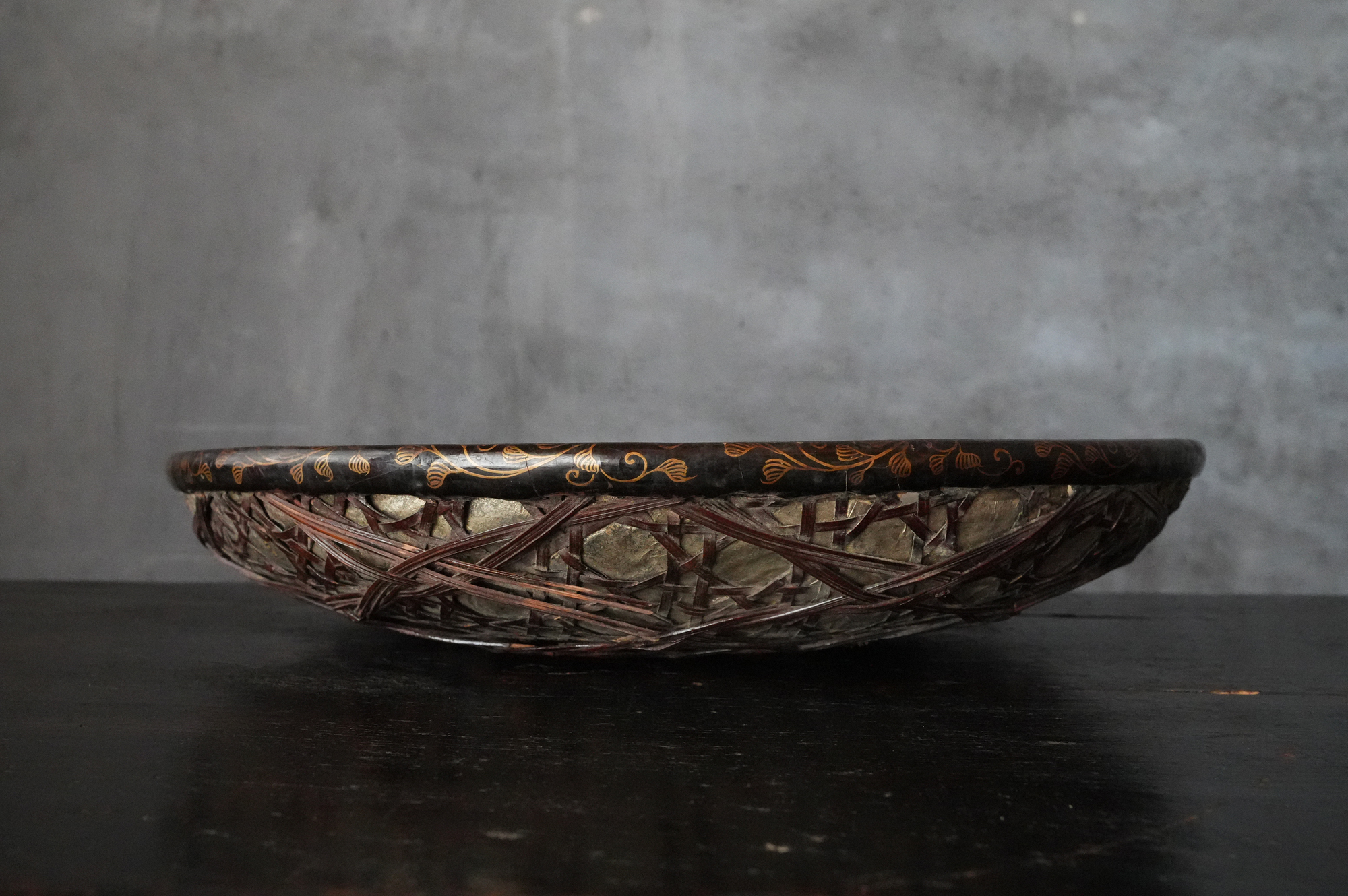 本品は、細く割いた竹を蘇芳でやわらかく染め、丹念に編み上げたもの。縁には黒漆を施し、控えめながらも気品ある唐草の蒔絵が添えられています。編み地には拭き漆がかけられ、見込みには銀紙を貼るなど、細部にまで心配りが感じられます。全体に漂う繊細さと端正な趣からは、由緒ある寺院で用いられていた可能性もうかがえるでしょう。