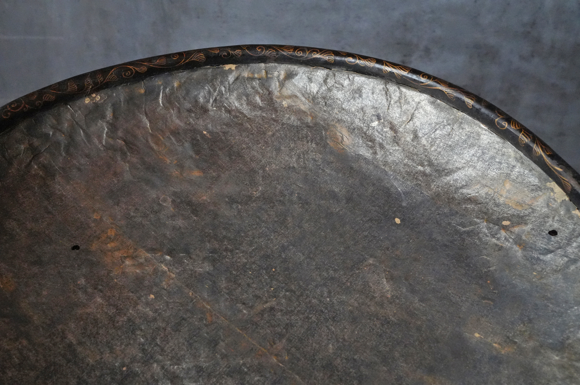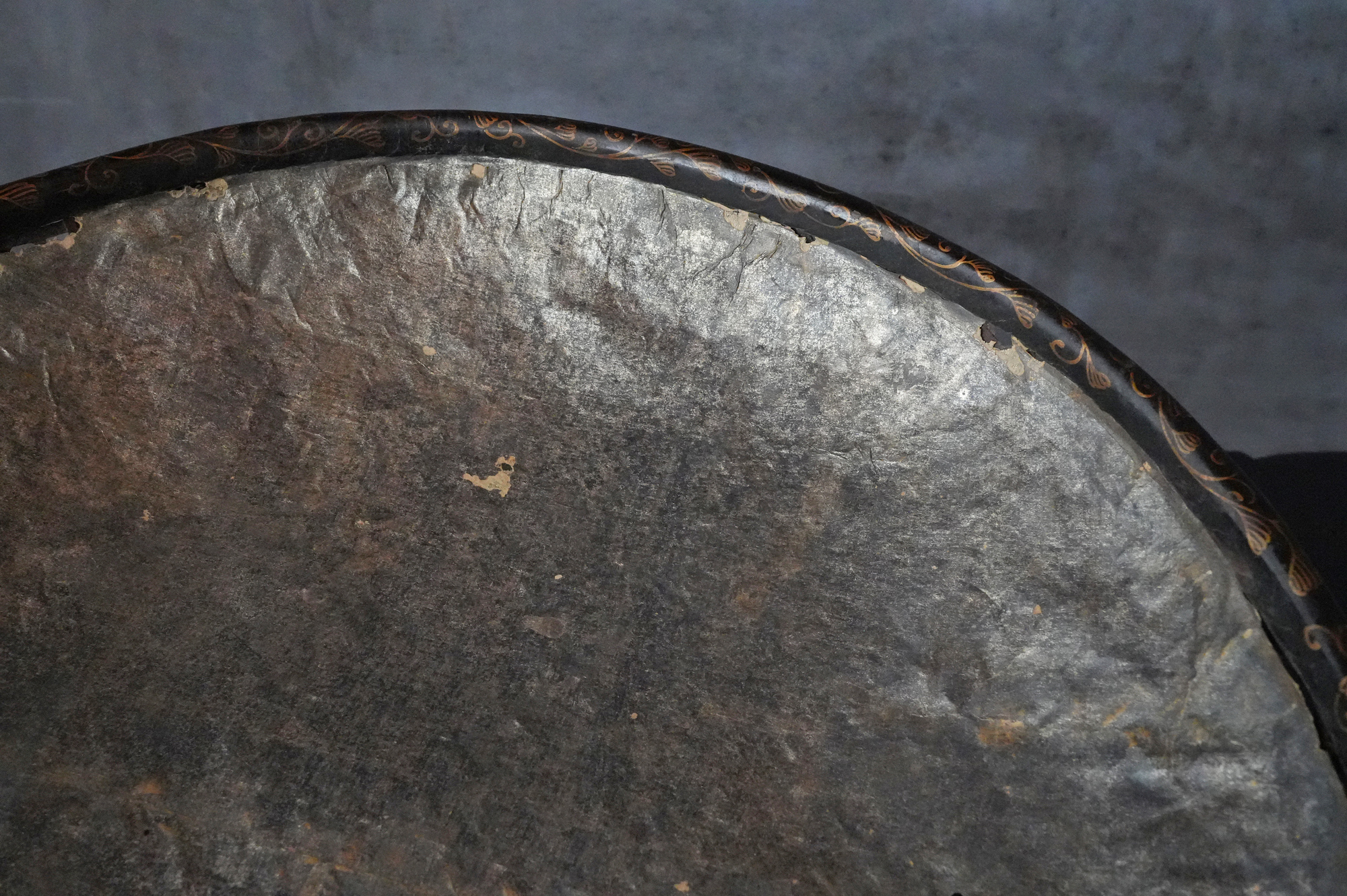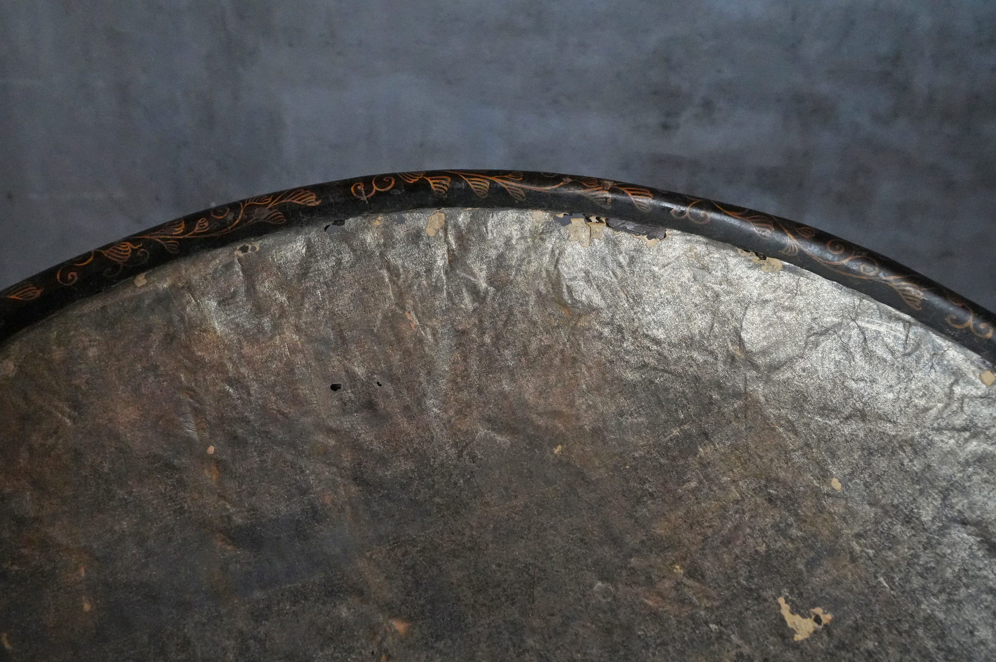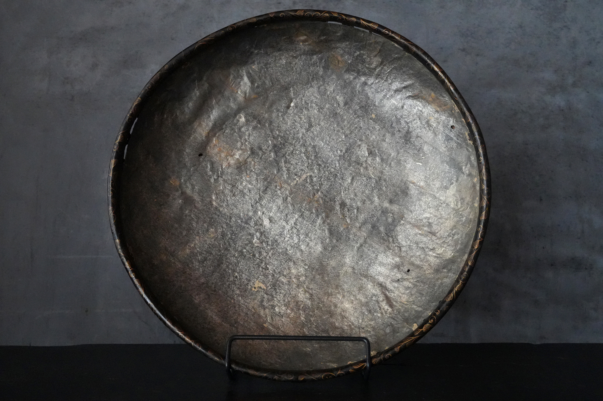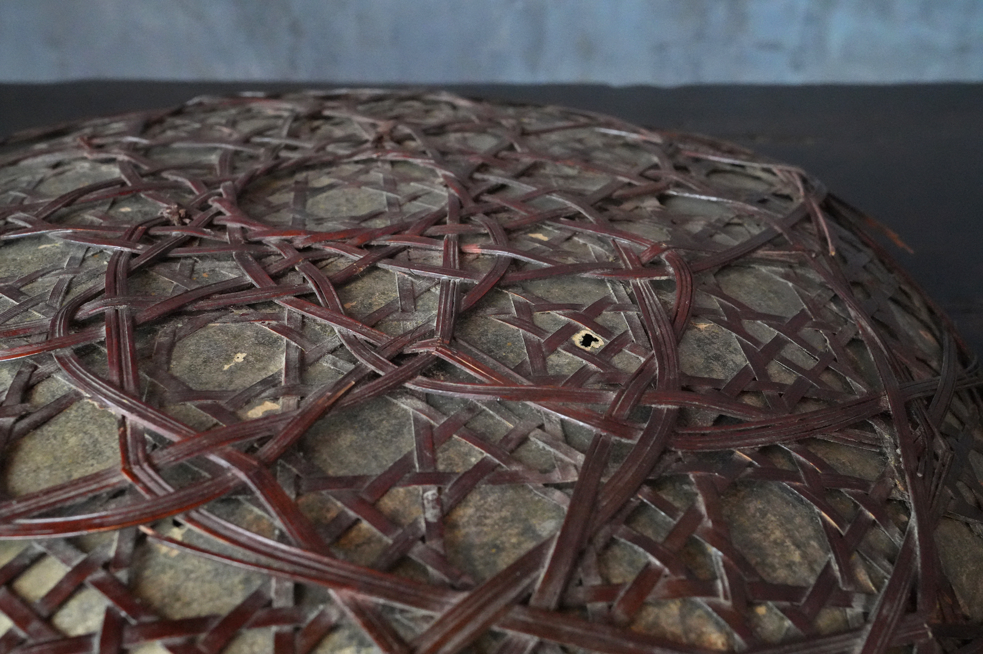 本品は、細く割いた竹を蘇芳でやわらかく染め、丹念に編み上げたもの。縁には黒漆を施し、控えめながらも気品ある唐草の蒔絵が添えられています。編み地には拭き漆がかけられ、見込みには銀紙を貼るなど、細部にまで心配りが感じられます。全体に漂う繊細さと端正な趣からは、由緒ある寺院で用いられていた可能性もうかがえるでしょう。
