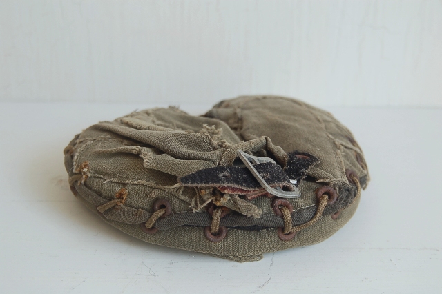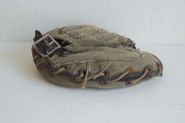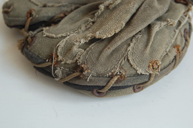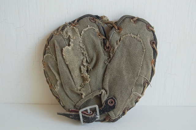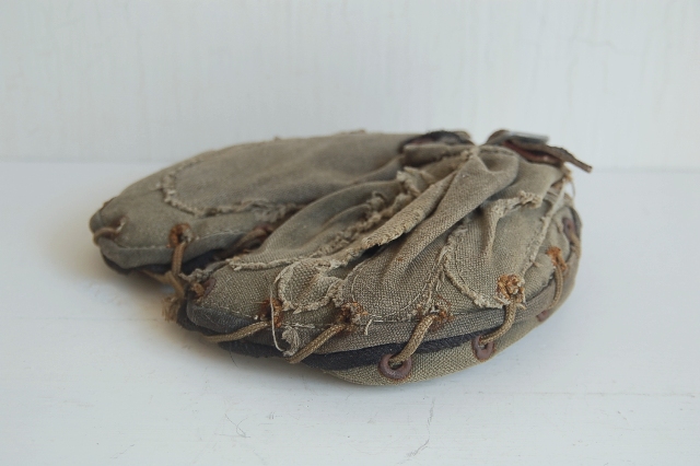 布製の使い込まれたボロボロの子供用グローブ。戦後間もなくの頃のもの。物資不足で皮のグローブは高嶺の花だった頃の時代ですが、当時はこの布製のグローブでさえ一部の裕福な家ではないと持っていなかったことでしょう。しかも、幼児用なのでかわいいサイズ。実物はイメージよりも小さいと思います。お分かりとは思いますが、ご使用は難しいです・・。カシメが取れている部分や擦り切れている箇所などもございますが、それらも魅力の一部になっております。