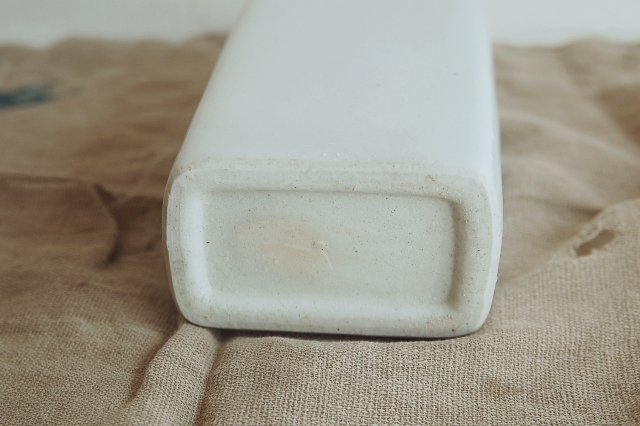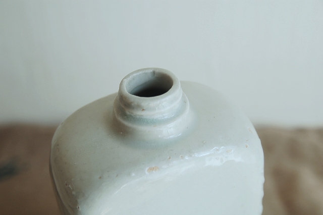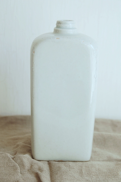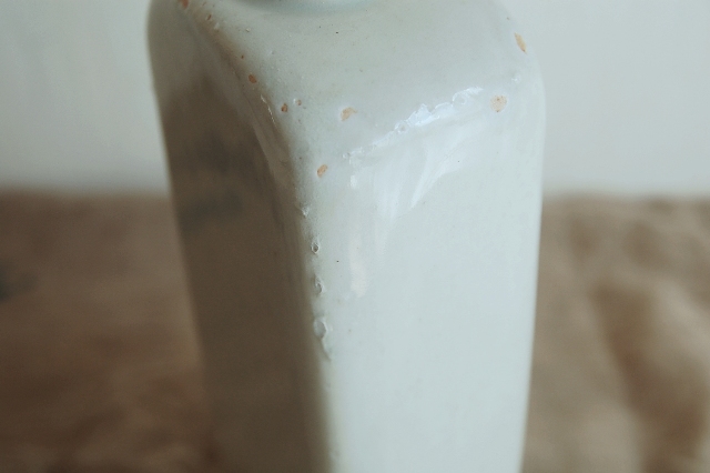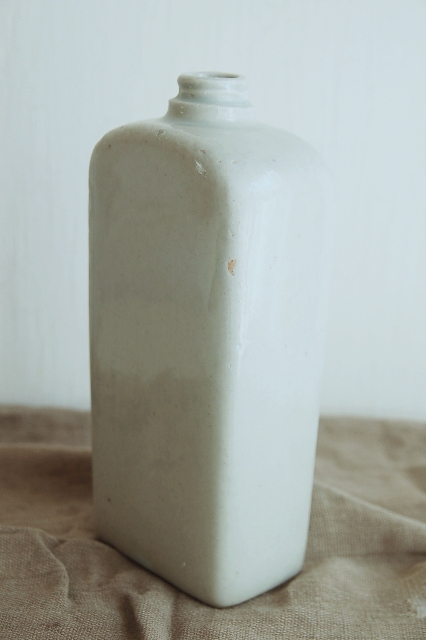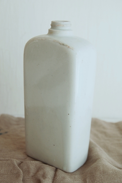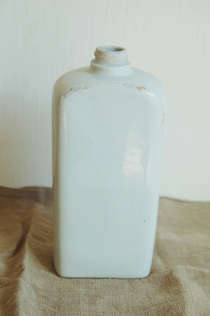 磁器の水筒(瀬戸)。おそらく第二次世界大戦中の物資不足の際、製造された代用品。デットストックですが栓はありません 。磁器ですが焼きは甘めで、角の釉薬がかかっていない部もあり、虫食いのような雰囲気になっているところが又魅力的です。大きな欠損は無く、ニュウもございません。在庫は二つありますが、1番は若干艶があり青みがかっている感じ、2番は白っぽくマッドな感じです。そのまま飾るもよし、花を生けるのも良し。口が小さいので一輪挿しとして重宝するでしょう。シンプルな形、余計な装飾の無いデザインは現代の空間にも違和感無くご使用いただけます。モダンな造形と古い陶磁器の雰囲気を併せ持っております。