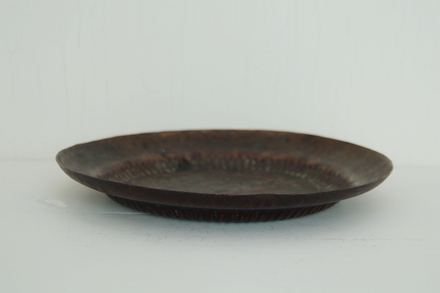 手打ちで形成された味のある銅製の皿。菓子皿に使われていたもの。経年の変化により深い味わいで落ち着きのある風合いが渋さを感じます。ヨーロッパの皿を感じるリムが無国籍な雰囲気。もちろん菓子皿としても良いですし、 そのまま飾って空間演出に、小物いれとしても良いですし、太目のキャンドル用の皿にしても良さそうです。