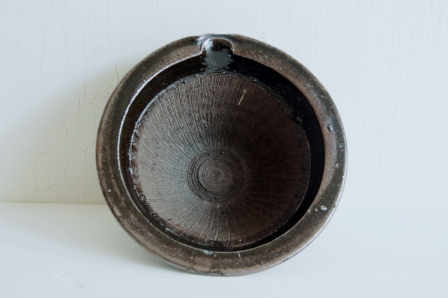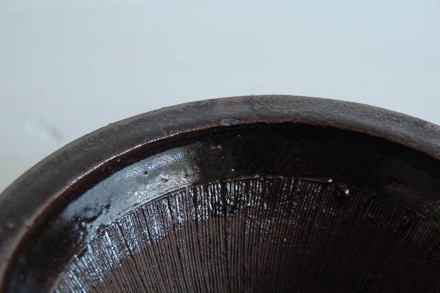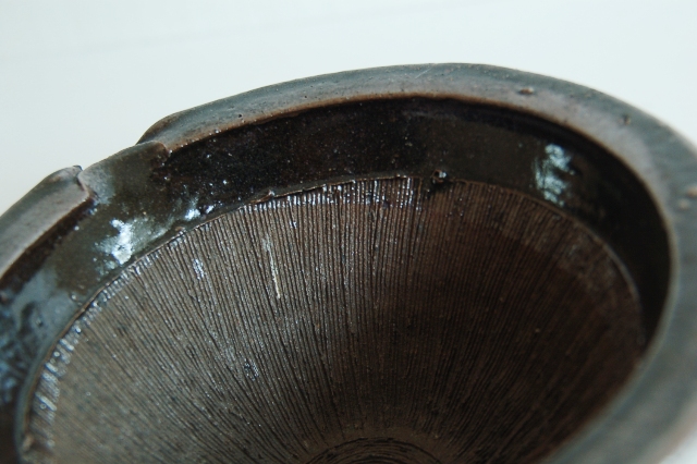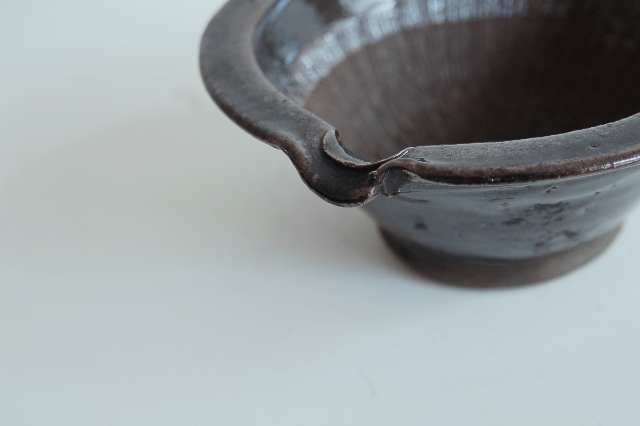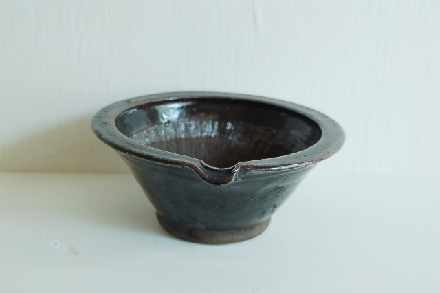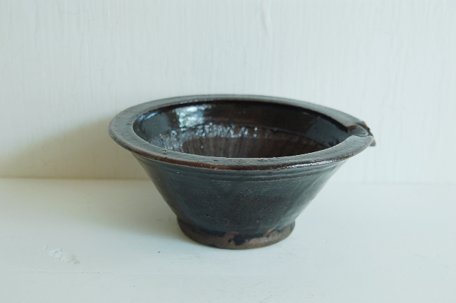 直径が5寸(約15cm)の現代の生活には理想的なサイズの擂鉢。大ぶりなものは良く見かけますが、このサイズで、この味わい、状態の良さは滅多に見つかりません。実際に使えて、古いものの味を併せ持っています。擂鉢にはもちろん、晩酌にも使えます。飴釉で土は赤く、粗めの土、焼き上がりは良いです。縁廻りに一箇所釉薬のチップのような小ソゲがありますが、この手の道具では状態は極めて良好。理想の擂鉢と言っても過言ではないでしょう。