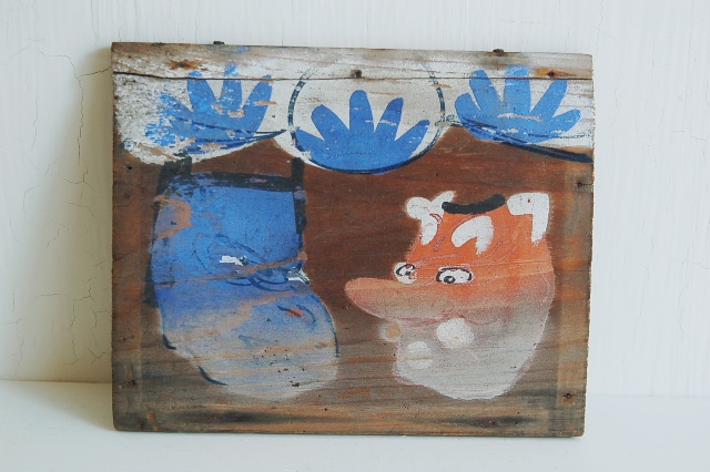 細い枠が額縁のように貼ってあったようですが、釘が錆び外れてしまったようです。板に直接描かれた絵はなんともいえない懐かしさを感じさせてくれます。