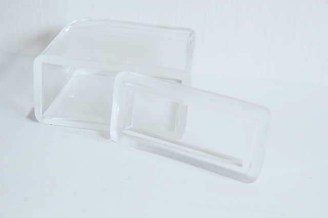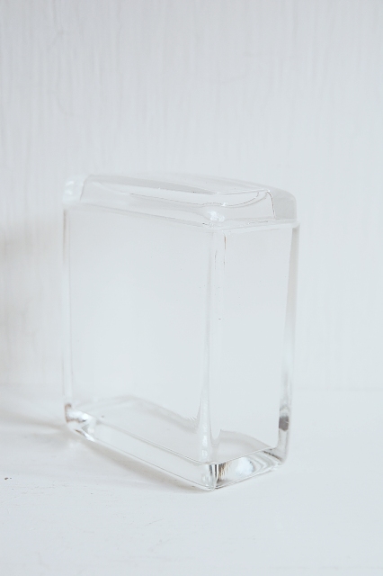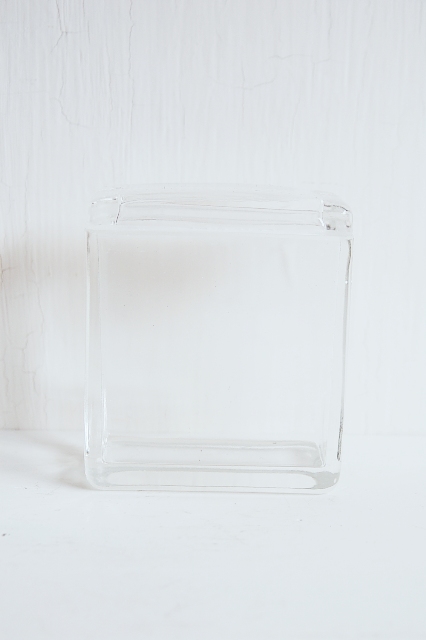 シンプルなガラスの容器。厚手のガラスで蓋付。キッチンなどで、調味料やティーバッグなどなど入れるのに良いサイズ。蓋を取ってフラワーベースにしても使えます。つくりは大雑把な感じで、蓋が容器より若干小さめだったり、縁の部分の仕上げも各々異なったりもしますが気にはならない程度です。余計な装飾のないシンプルなデザインなのでどんな場所でも違和感なくお使いいただけます。