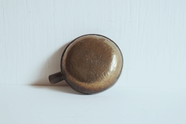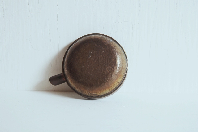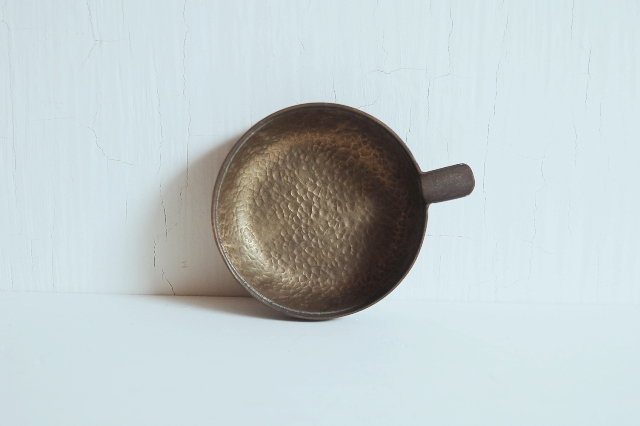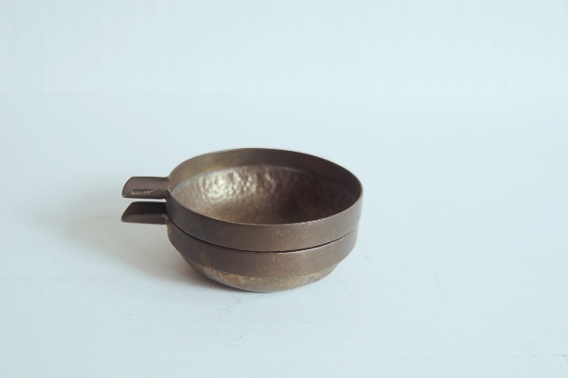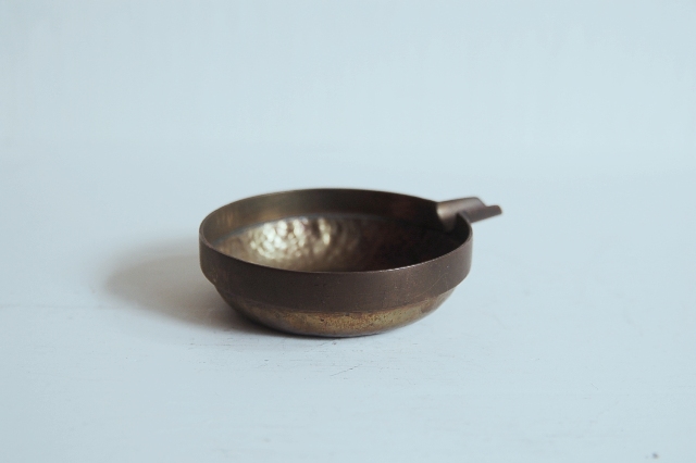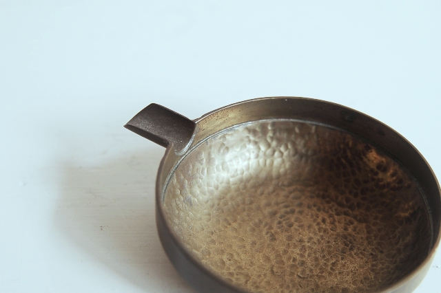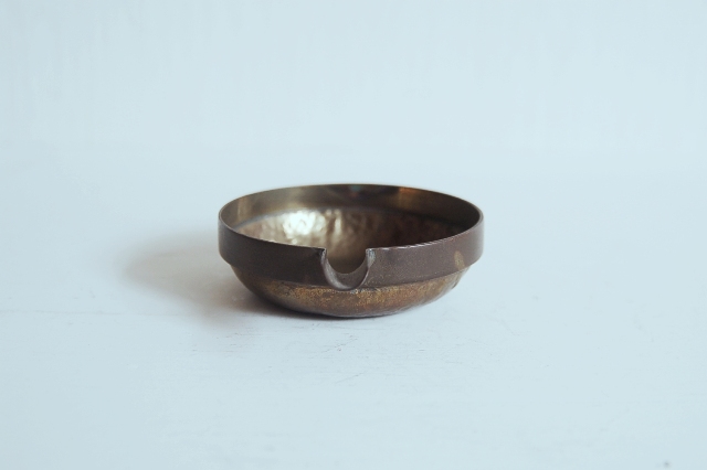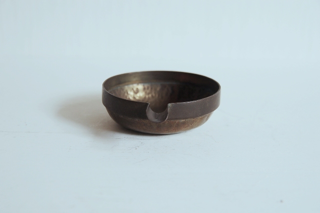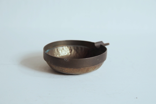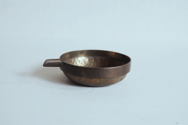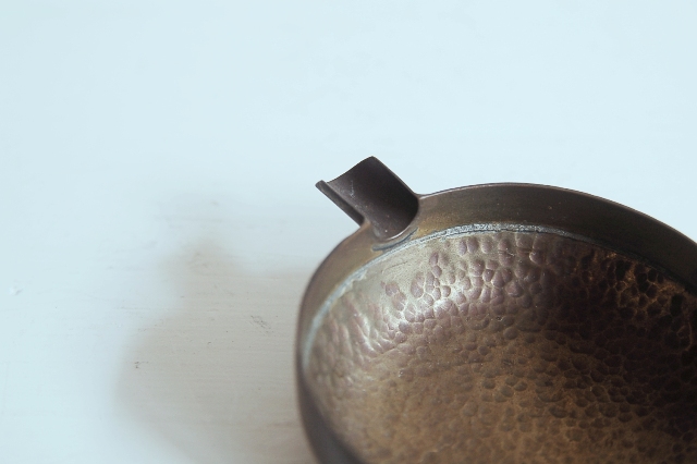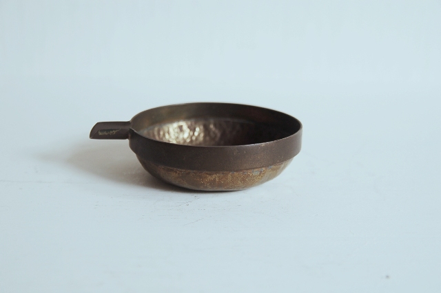 真鍮製の小さな片口かもしくは灰皿?もしくは実験用?細かな用途は不明です。意外と丁寧 なつくりで、本体は打ち出しの叩いた跡があり、小さいながらも存在感があります。変色し経年変化も見られますが未使用のようです。日本のものか、海外のものか詳細はわかりません。スタッキング(重ねること)が可能です。