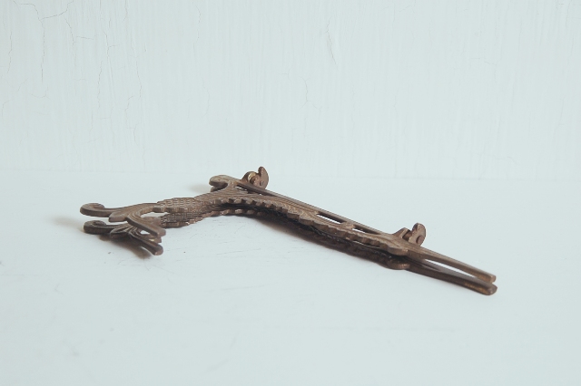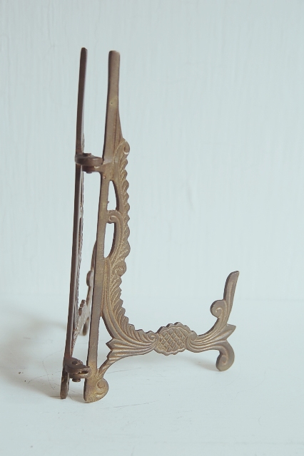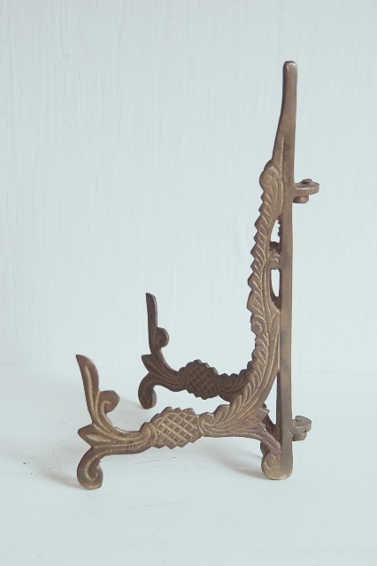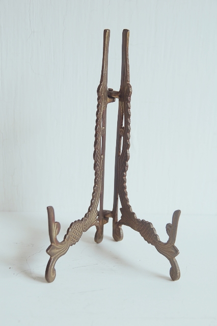 真鍮製の皿立て。皿立てとしてももちろん、お気に入りの絵や写真入りの額、鏡などを飾るのにいかがでしょうか? 皿立てって、意外と選択肢も少ないので、真鍮の質感、装飾が個性的で良い感じ。ヨーロッパを感じさせる装飾が小さい物ながらも主張を感じます。経年により落ち着いた表面の色合いも良い感じです。