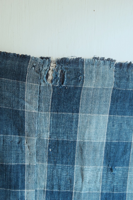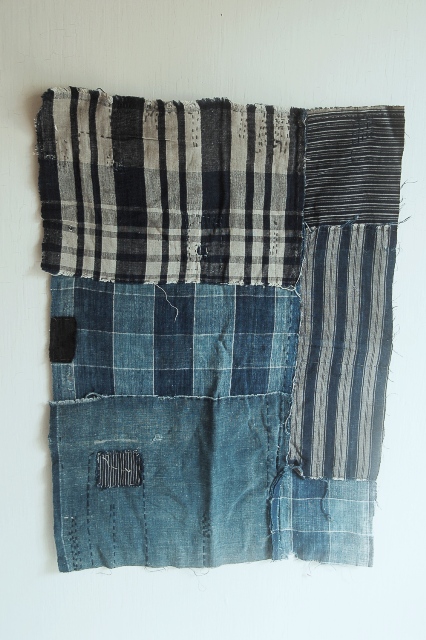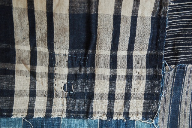 継接ぎだらけの襤褸。継接ぎされている面は裏面で布団か敷物の断片になります。補強の為に裏側に不要となった布を当てていますが、それがパッチワークのような補強の跡が面白いです。布は高価なものだったので特に農家や田舎のほうではとことんまで使用されました。