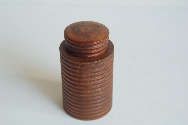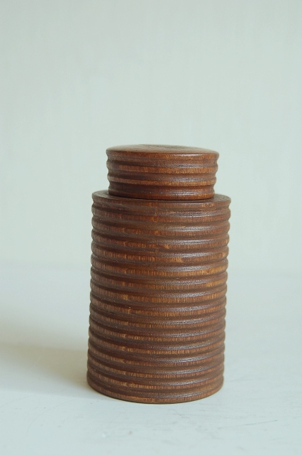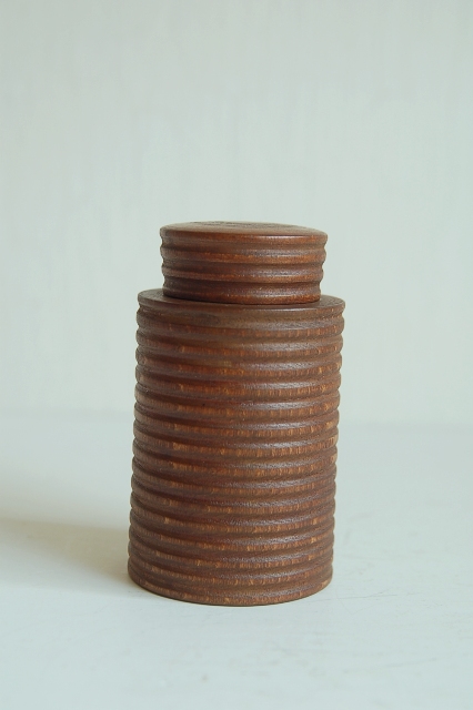 小ぶりの木製の茶筒。素材を生かした拭き漆で丁寧な仕上げり、筋目が軽快で現代の生活にも合うモダンなデザイン。元来は茶籠(外でお茶をたてる為の小ぶりな茶道具)に入れていたものでしょう。茶葉を入れるも良し、コーヒー豆を入れるも良し、ハーブやスパイスを入れても良いでしょう。お気に入りの道具を揃えて自分なりの茶籠を作ってアウトドアで飲んでみるのもなかなかオツなものですよ。