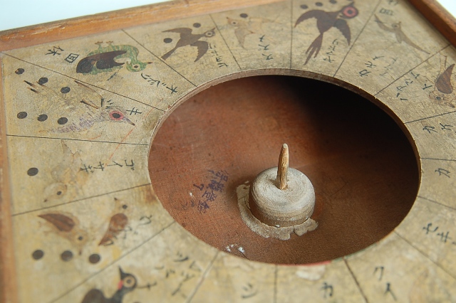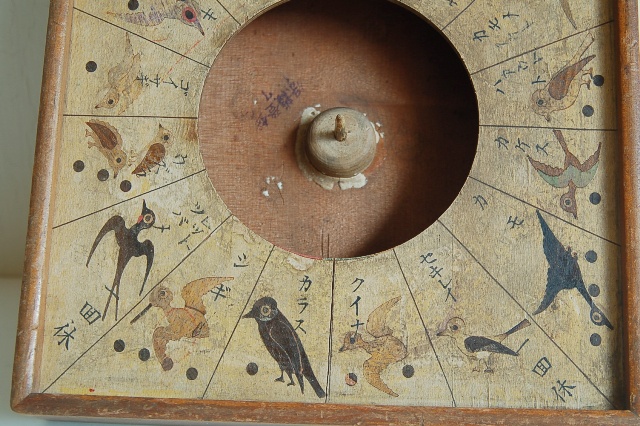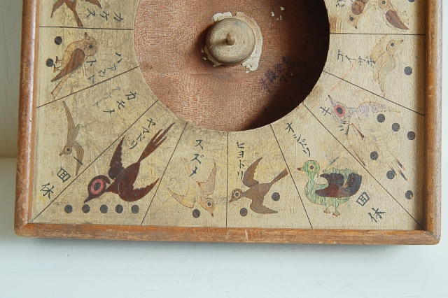 たくさんの種類の鳥が描かれているルーレット。中央の部品は欠品しておりますが、使い込まれた表情、鳥の絵、文字がアーティスティックな作品のような佇まいは魅力を感じます。このような感じの盤型の玩具は何度か扱いましたがこの雰囲気は日本のものではなかなかありません。個性的な空間演出におすすめです。
