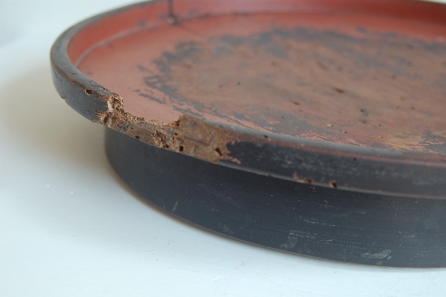この盆は朽木特有の図柄ではなく、漆黒と朱塗のごくごく一般的なもの。使い込まれ、又長い歳月蔵の中に仕舞われていたもので一種独特の雰囲気を持っています。塗りが磨り減り素地が露わになり、虫食いも至る所にあります。一部塗りの部分だけを残し空洞化している部分もございます。興味のない人にとったらボロボロのお盆ですが、好きな方にはこの表情は長年探してもなかなか出会うことの出来ない 表情を持っている品。擦り切れ具合は根来の折敷を彷彿させる容貌、高台は低め、縁周りも低めで、ごくありそうな盆ですが細かな部分にバランスの良さを感じます。これぞ下手の良品といった感じです。そのままでも存在感を感じますが、物を置いて時の印象はかなりのポテンシャルを持っています。
