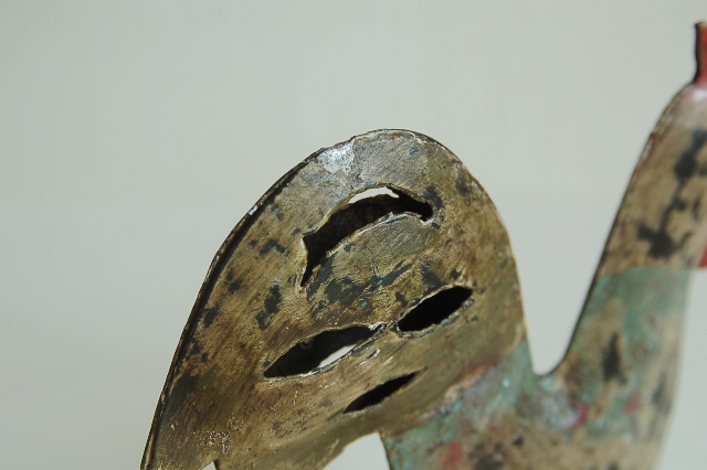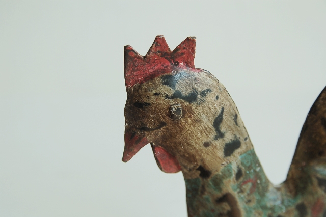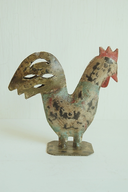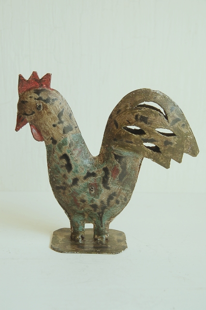 厚めのブリキ板でで作られペイントされたにわとりのオーナメント。さほど古いものではありませんが、素朴な感じで妙に惹かれます。ホーローのようにも見えますが厚めにペイントされている所もチープ感漂い、抜けたような感じに更に拍車をかけています。空間の演出にいかがでしょうか?