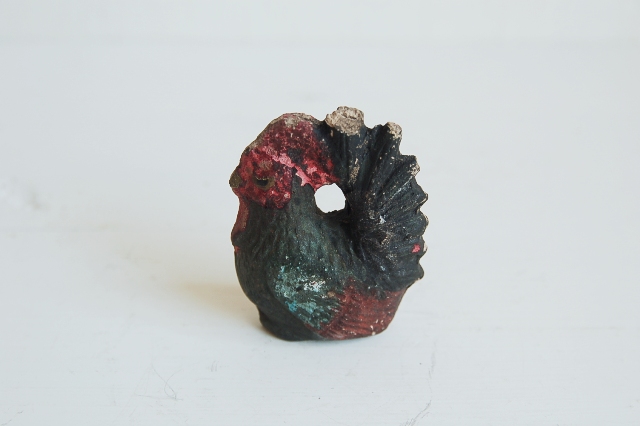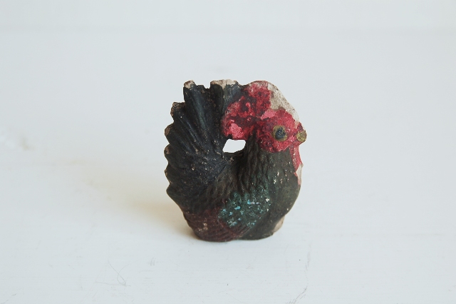 小ぶりの伏見人形。酉(鶏)は古くから人類との関わり合いが深く、時を知らせてくれたり、鳴き声で魔物を払ってくれるなど民間信仰的な言い伝えもあり、各地で様々な郷土玩具で作られています。伏見人形は土人形の発祥と言われており、型も多く、洗練されたもの、味わい深いものなど色々なものがございますが、こちらは、どこか無国籍な雰囲気が感じられる品。