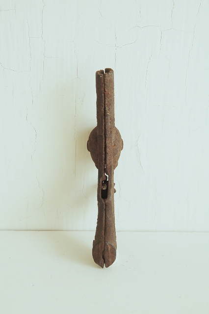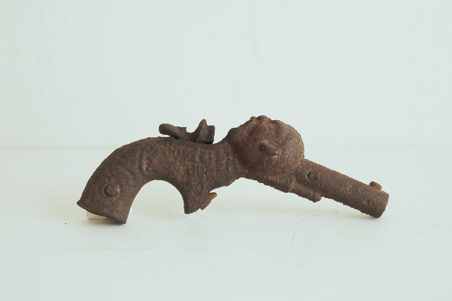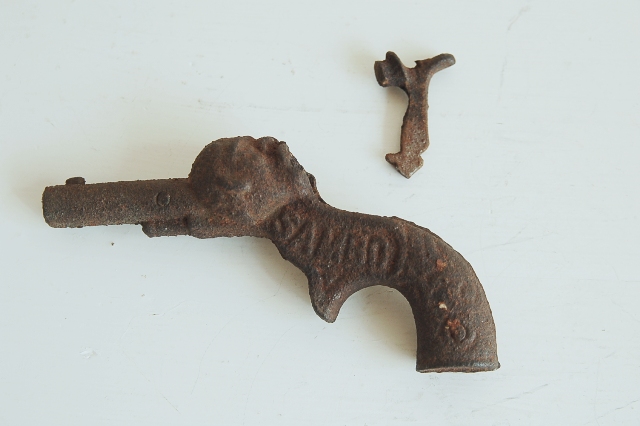 錆び錆びの拳銃の玩具。檄鉄の部分に火薬を置き引き金を引いて「パン!」と音を出して遊んだ玩具。引き金の部分(檄鉄を含む)部分は接合部が外れてしまっています。そのため、引き金は引けず、遊ぶことは出来ない状態です。