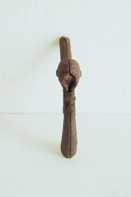 ブリキではなく鉄なので肉厚で質感は良く(錆び錆びですが・・・)、デザインも人面(インディオ?)の部分が、おどろおどろしくもあり、ユーモラスでもあり日本的なものではありません。「SAMBO」と文字が残っているのでどこのものかは不明ですが海外のものでしょう(ロシアでしょうか?格闘技のサンボ?)。ちょっと表情は厳しいですが顔の雰囲気からして今は表現できないちび○○サンボ関連のものかもしれません。大きさのわりにずっしりとした感じは見た目にも伝わっていると思います。