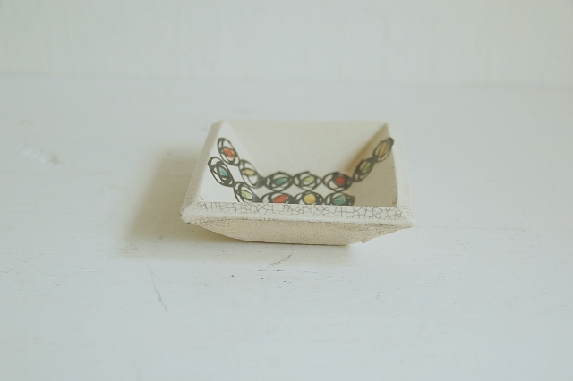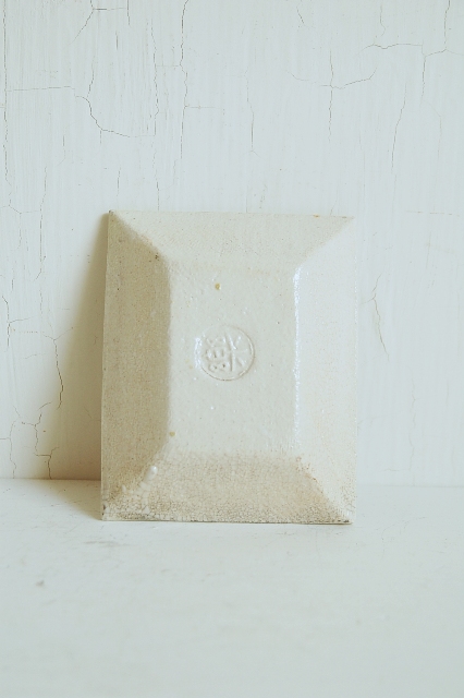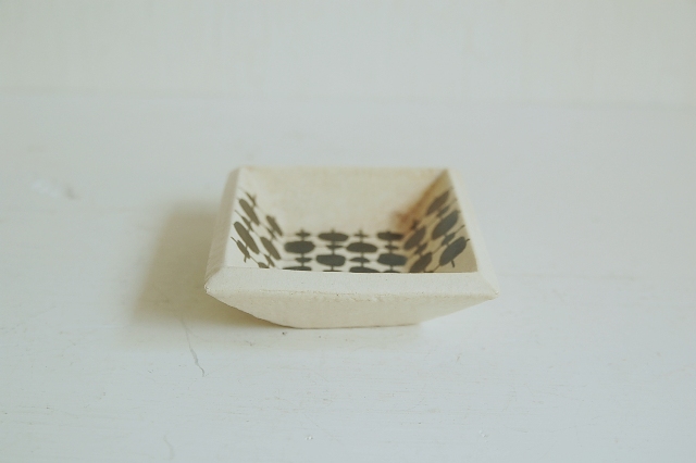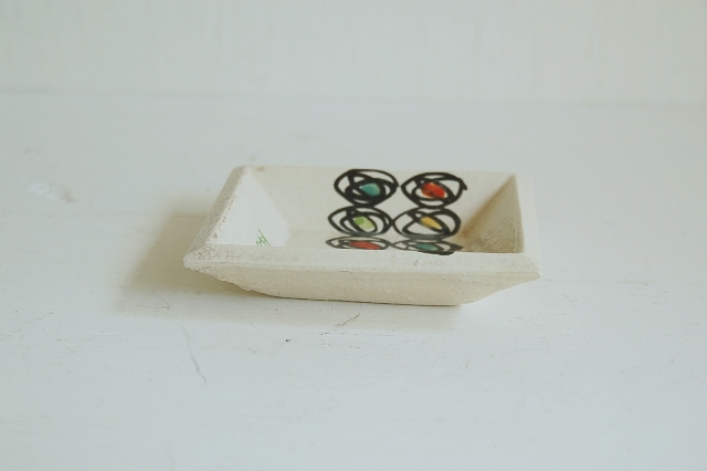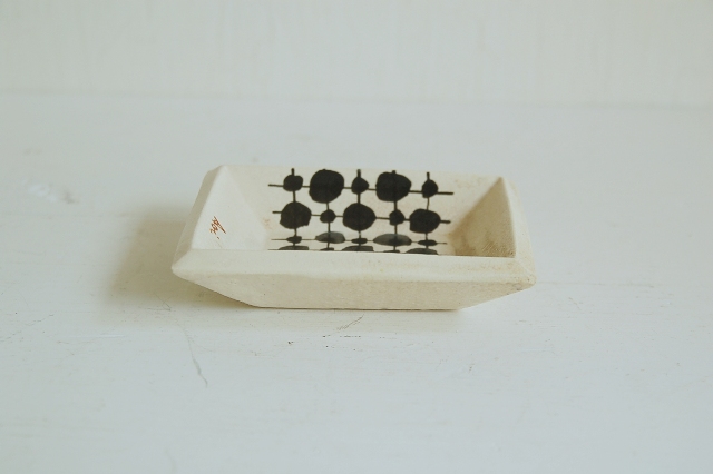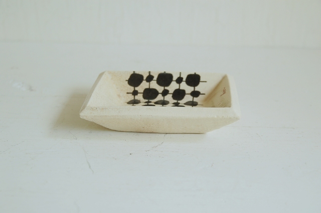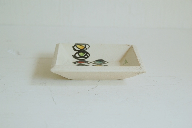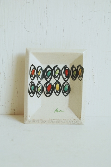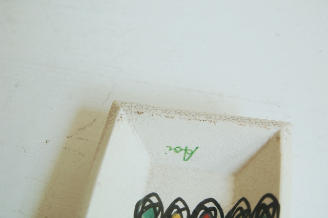 樂焼のモダンな図柄の小皿。「樂」らしくない珍しい品です。柔らかな樂特有の白い肌にモダンデザインを彷彿させる図柄です。絵付けの図柄には「Aoi」とローマ字でサインがあり、裏には「樂」の銘がはいっています。絵付けは誰なのかわかりませんがバランスやデザイン、発色も美しく古さを感じさせません。普段使いでも良いですし、飾り皿としても良いでしょう。