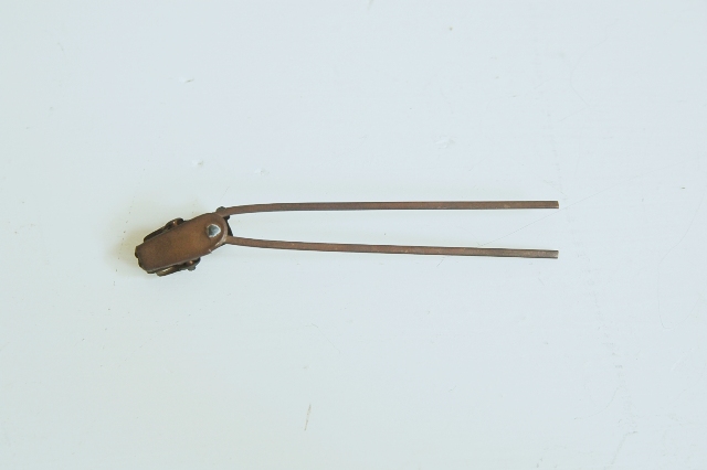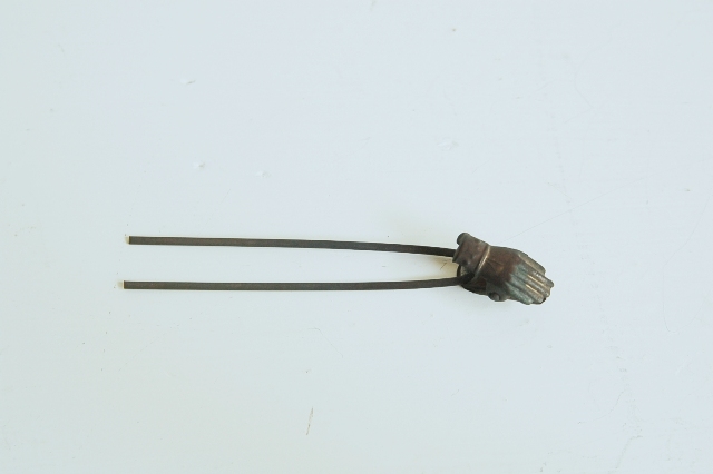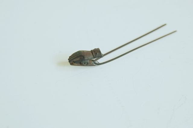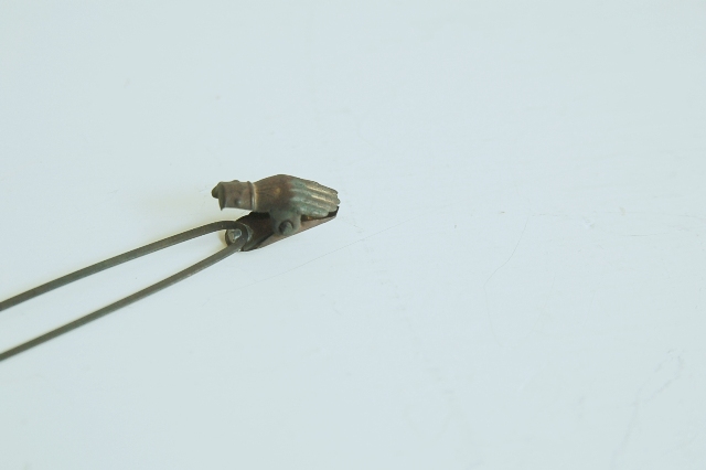 小さな手の形をしたクリップがついた簪(かんざし)。真鍮製で経年により味わいのある表情です。二本の細い棒状の部分で簪にしていたのことと聞いたことがありますが定かではございません。小さな手の部分は魅力的でどこか宗教的な美に通ずるものがあります。以前海外のものでこれと同様の大き目のクリップを見たことがあるので外国のものかもしれませんが、簪であればそれを模して作られた日本製のものとなりますが詳細はわかりません・・。とはいえ魅力的なクリップであることには変りません。