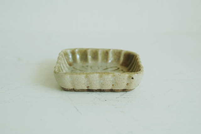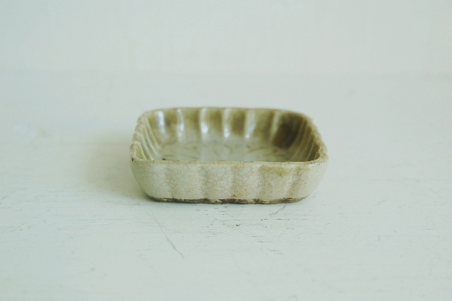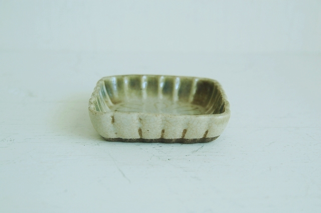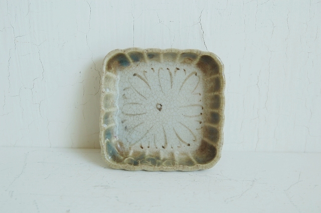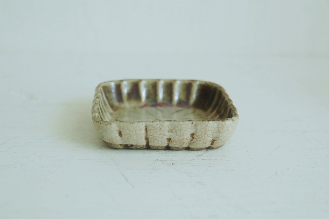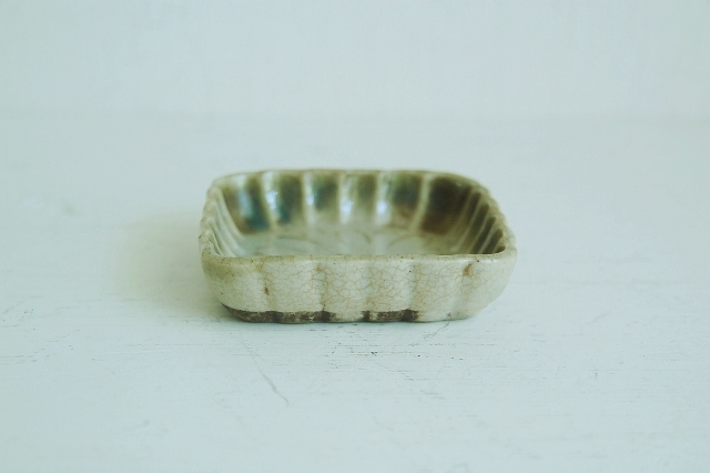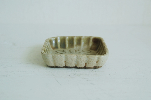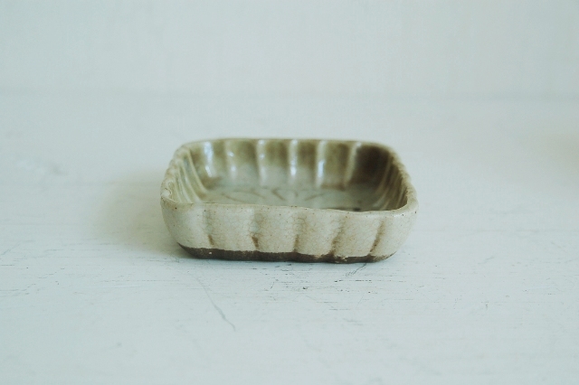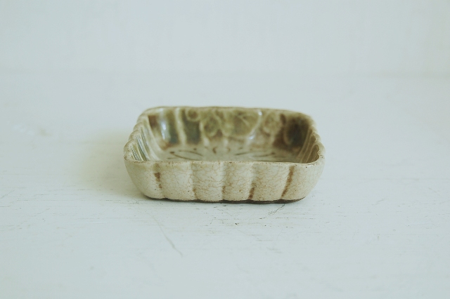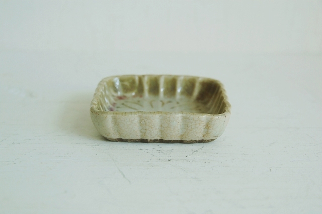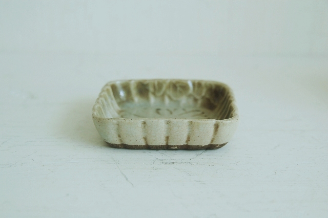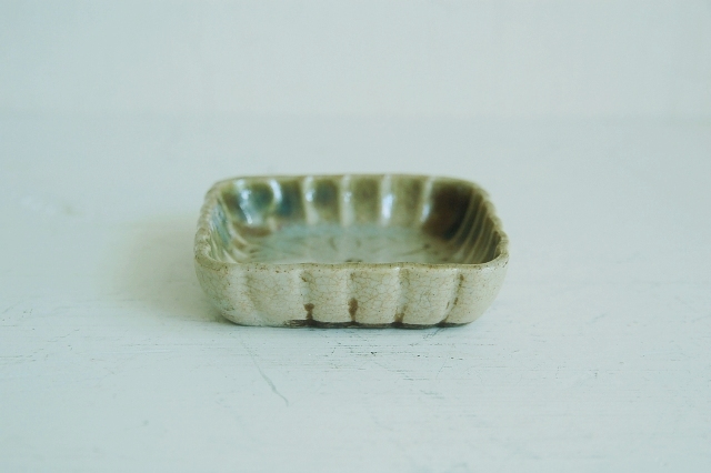織部の小皿五客。醤油皿、取り皿にも使える丁度良いサイズに四角形で収納もしやすく、程好い味わいもあります。状態も良いものが丁度5枚取れますのでセットでの販売です。織部の青の発色は渋めで控えめ。内側の釉薬の厚めの部分には窯変により赤の部分もあり個性的ですが、かといって主張も強くないので使いやすい小皿です。絵付けもサッと書きあげた軽やかな印象です。型で形成されたもののようで縁周りに葉のレリーフ(陽刻)が控えめな感じにございます。
