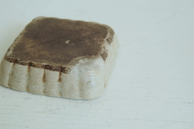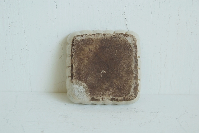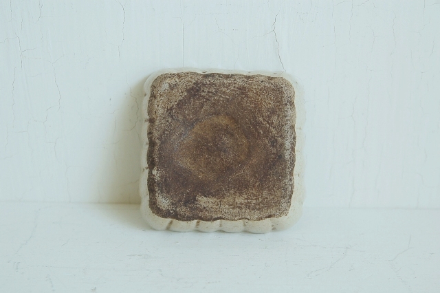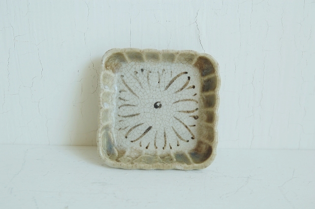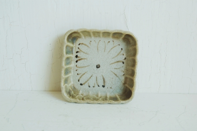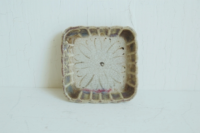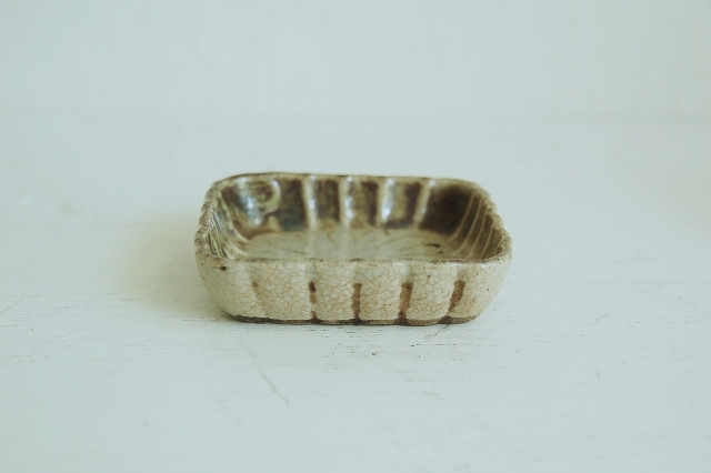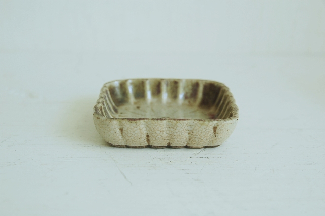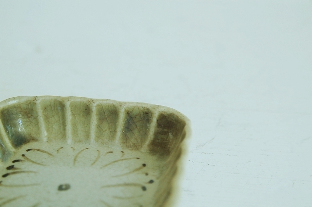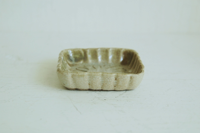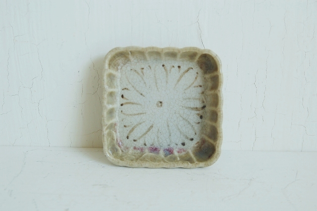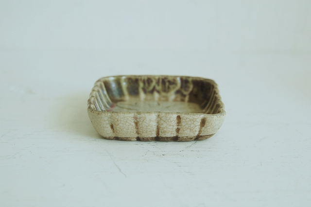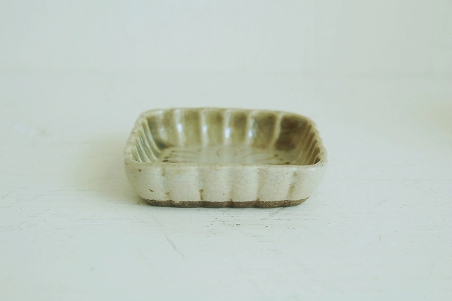 織部の小皿五客。醤油皿、取り皿にも使える丁度良いサイズに四角形で収納もしやすく、程好い味わいもあります。状態も良いものが丁度5枚取れますのでセットでの販売です。織部の青の発色は渋めで控えめ。内側の釉薬の厚めの部分には窯変により赤の部分もあり個性的ですが、かといって主張も強くないので使いやすい小皿です。絵付けもサッと書きあげた軽やかな印象です。型で形成されたもののようで縁周りに葉のレリーフ(陽刻)が控えめな感じにございます。