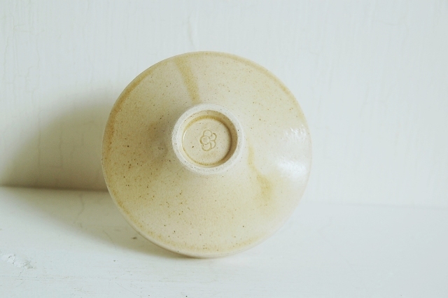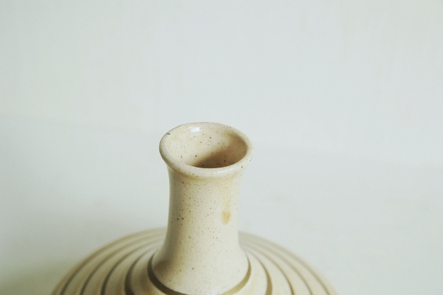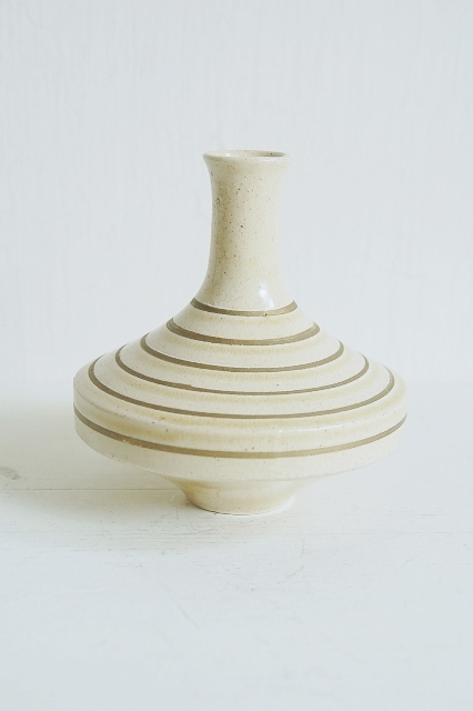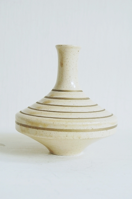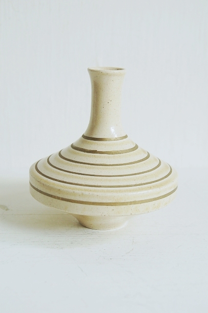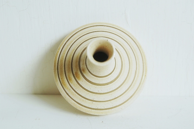 モダンな造形の一輪挿し。瀬戸特有黄色っぽい肌に金彩独楽目が日本のものではないような印象を感じさせてくれます。サイズも良く、そのまま飾るも良し、花を生けても良いでしょう。酒好きの方には徳利でも面白いかと思います。ミニマルな空間にもしっくりと収まりそうです。大きな欠点はなく極めて良好なコンディションです。底に梅の花のような刻印有。