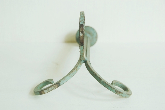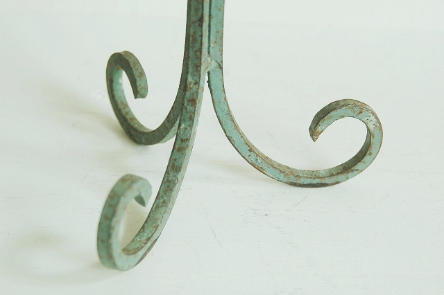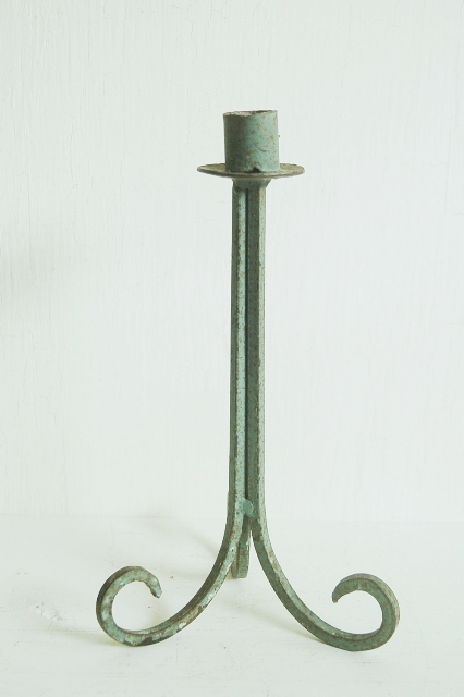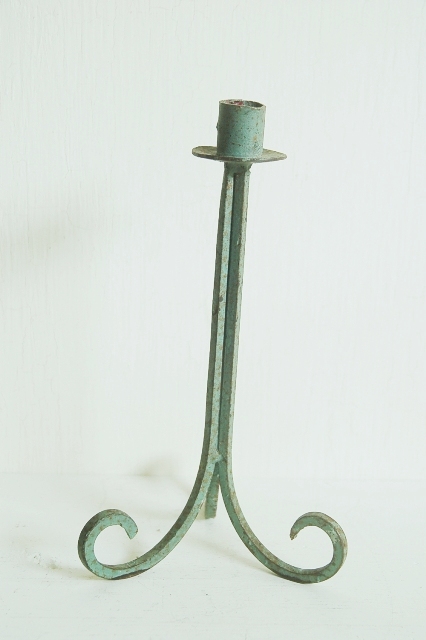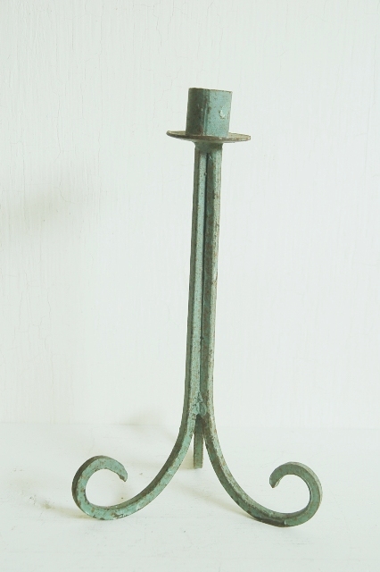 鉄製のフランスの燭台。鉄にブルーグレイの塗料が施されて経年により錆びや剥げた箇所が独特の存在感を放っています。ロートアンアン(鍛冶職人がつくったもの)ならではの温かみを感じる品。細部までこだわったものではありませんが、庶民的な気の抜けた感じが日本の空間には違和感なくフィットすることと思います。あえて最小限度の手入れに留めております。磨きや艶出しなどは一切していないオリジナルの風合いです。フランスのものってエレガントなものを思い浮かべてしまいますがこの素朴な燭台は日本の古民藝に通ずるものを感じます。