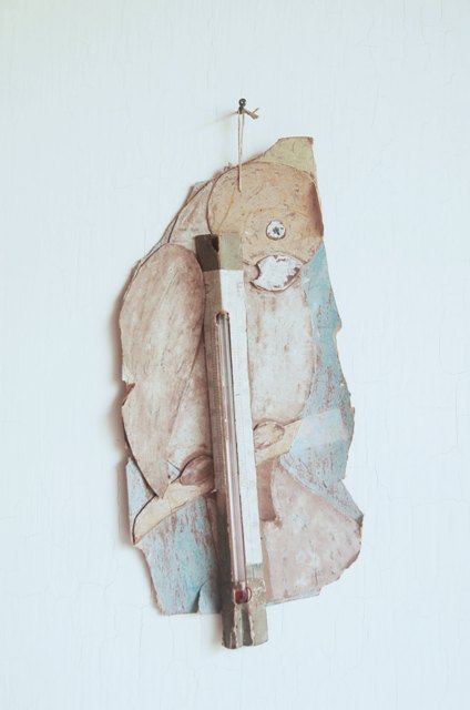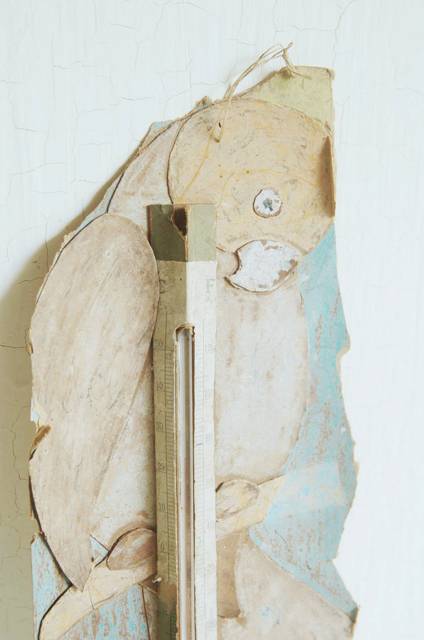 紙で出来た鳥のモチーフの温度計。温度計は使えます。画像でもご確認できますように手作り品です。色鉛筆で色が塗られ、紙は日焼けしていますがなんとも言えない魅力を感じます。個性的な空間演出にどうぞ。手入れなどはほとんどしていないそのままの状態です。