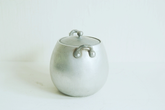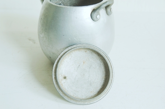 柔らかな印象のモダンなデザインで古さを感じさせないアルミの急須。作行きの良さは画像からも感じられるとおもいます。内部は叩いて成形された跡が残り、見えない部分もきっちりとつくられ丁寧な仕事ぶりが伺えます。本体と蓋の質感に違いはございますが後家(他のものを後から合わせたもの)ではなくオリジナルです。色の違いがあるものの違和感は感じません。内部の茶漉し部分が注ぎ口の部分で留めており、その部分から水を入れた際に長年の使用の為か微量にじわっとにじみますが使用可能な範囲内と判断しています(拡大画像最後から2枚目)。かなり使い込まれたようである程度掃除をしておりますが外側には擦れなどの細かな傷、へこみ、底は火にかけた際の煤の後、内部には取れきれない汚れなどがございます。また持ち手がありませんのでご購入者様のほうでご用意下さい。陶器の急須用の替え持ち手(籐製)が良いかと思います。