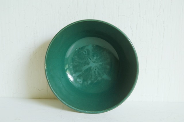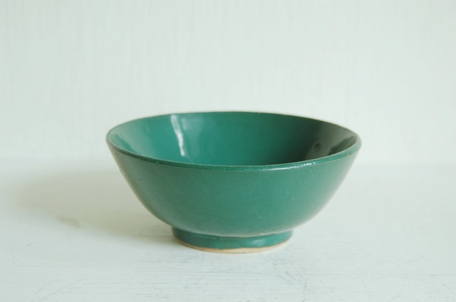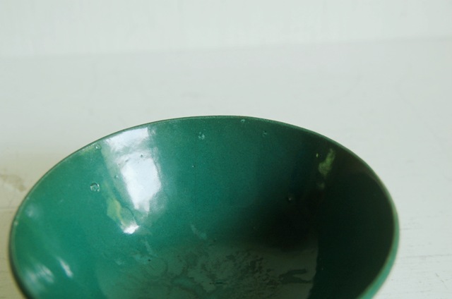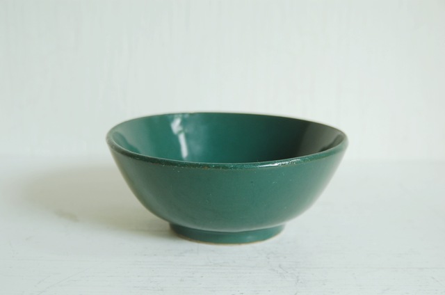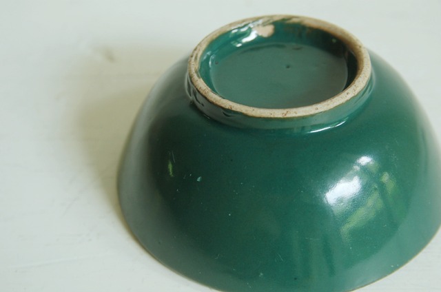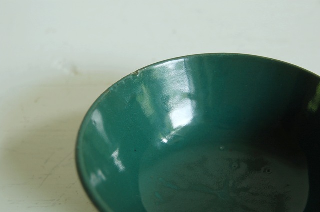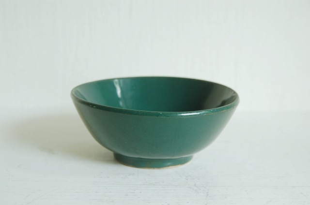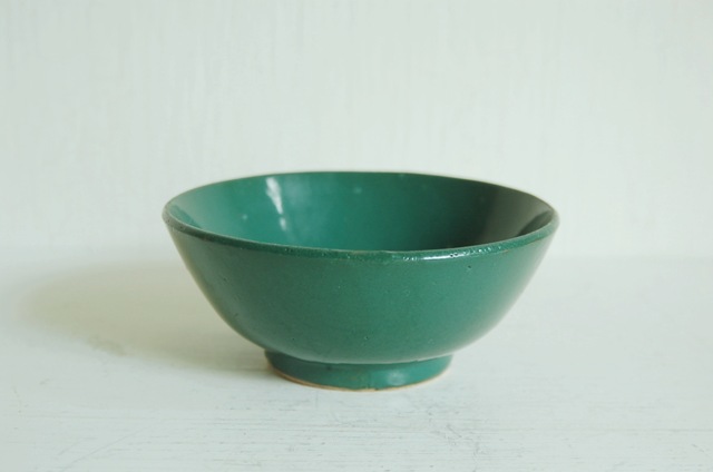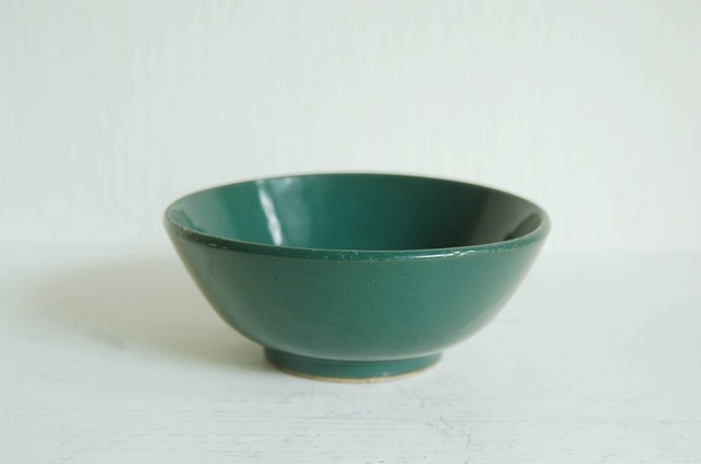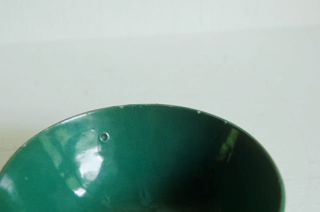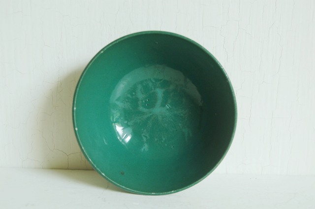 目を引く色でありながらも落ち着いた印象の緑のお鉢(茶碗)。伊賀近郊で焼かれたもの。日本人の感覚にはないような釉薬の色合い、形は至ってシンプル、和洋を問わずどんな料理にもお使いいただけそうです。モダンな文化が庶民の生活に浸透していったころのものです。実際に使われていたようで、細かな傷、擦れなどがあります。特に見込み(内部)には擦れなどがあります。1番はありませんが2番にはヘアークラックがあります(内側外側に確認できます)。また、窯傷なども多少はございます。古いもので実際に使用されていたものですので時代相応の経年による変化がございますので充分ご確認の上ご注文下さい。1番1,500円、2番1,000円(ニュウ有)。