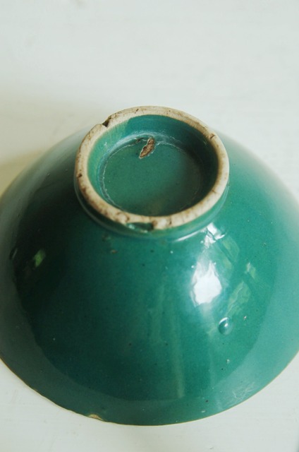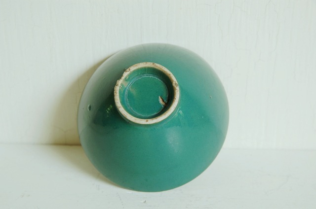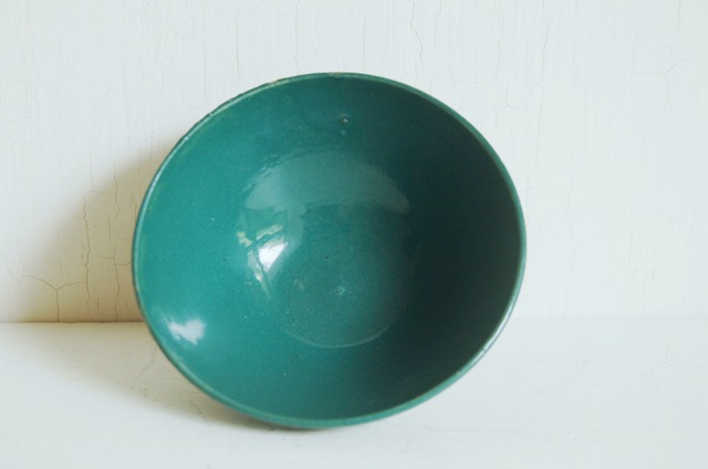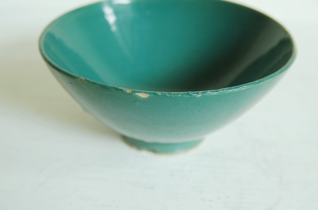 綺麗な緑色が印象的な茶碗。大正期頃、伊賀近郊で焼かれたもの。シンプルで和とも洋とも受け取れる感じが今の食卓にもすんなりと溶け込みそうです。古く実際に使用されてきたものですので時代相応の経年に窯変化がございます。また、縁周りに一箇所ハマグリ状の小さなソゲ、底に釉薬の剥げなどの窯傷もございますので充分画像でご確認の上ご注文下さい。