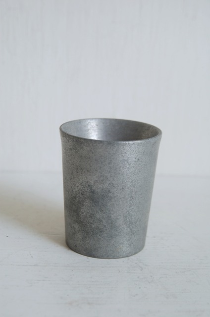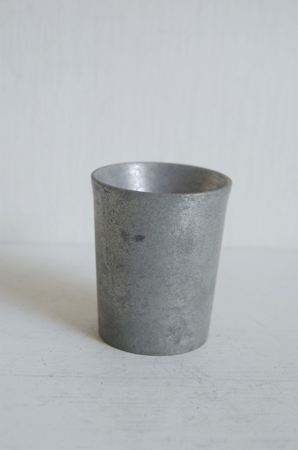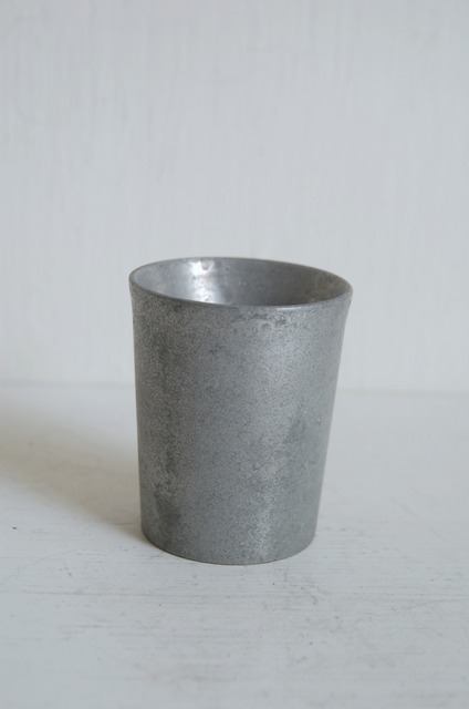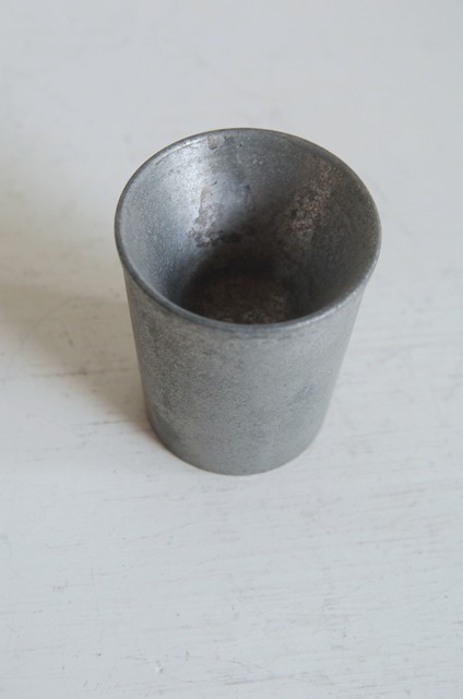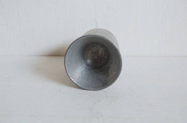 鋳造アルミの厚底のカップ。約半分の厚みは底になっています。経年の味わいはまるで錫の肌のような独特の表情ですが、軽やかな印象でもあります。手に持つとずっしりときます。カップのようですが、おそらく花を活ける際のオトシの類だと思います。シンプルなフォルムが魅力。