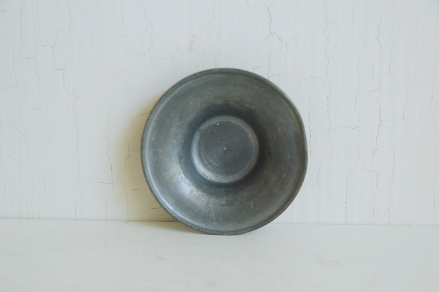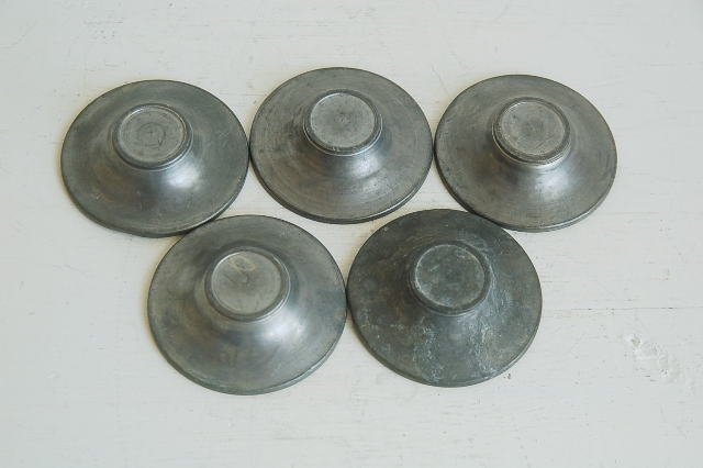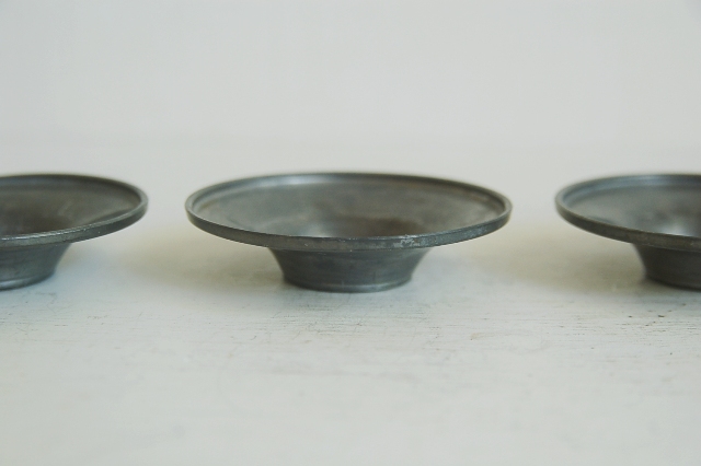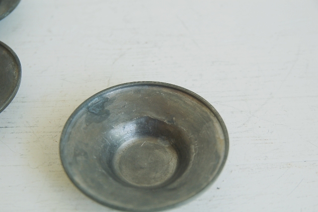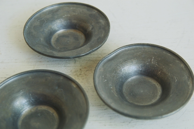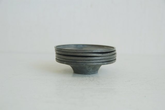 小ぶりの錫の茶托5枚。シンプルなもので刻印などもありません。一般的なサイズより小さいので野点などで持ち運び用のものだったかもしれません。中央部分が小さめなので高台があり、その高台の直径が小さいものでないとバランスは合わない感じですが、錫独特の経年変化の表情は魅力的です。急須、湯冷まし、茶碗そして茶托など気にってものを集めて楽しんでみるのもなかなかのものです。識者のように茶箱などに揃えてみても良いですね。