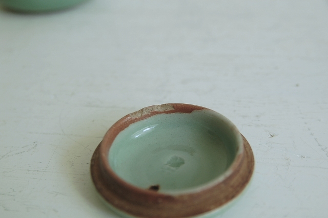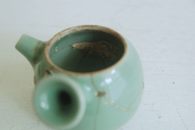 初代真清水蔵六の青磁の急須。ですが、画像でもご確認できますように大きく割れたものを鎹で継いだもの。まるでブラックジャックのようでここまでやるのかと思うほどの直しっぷりが魅力。以前の所有者がよほど気に入って使っていたことがわかります。水漏れは現状ありませんので急須としてお使いいただける状態です。あえて、茶渋などは洗っていない当時のままのじょうたいですのであらかじめご了承下さい。このような雰囲気の急須とであるのは滅多に出会えません。
