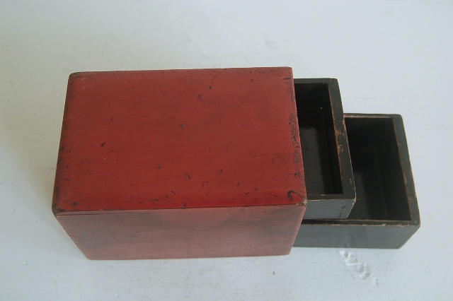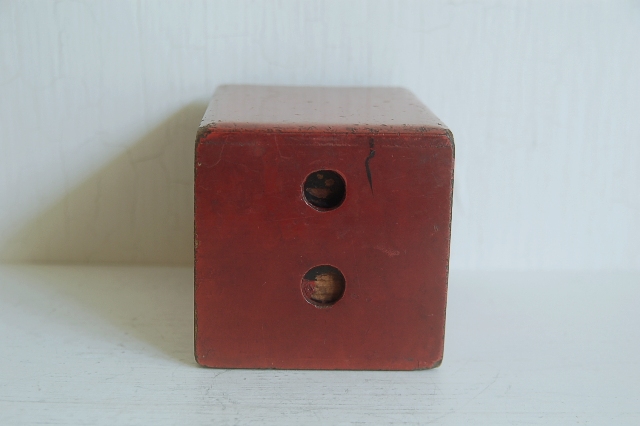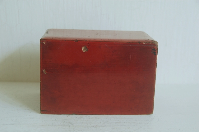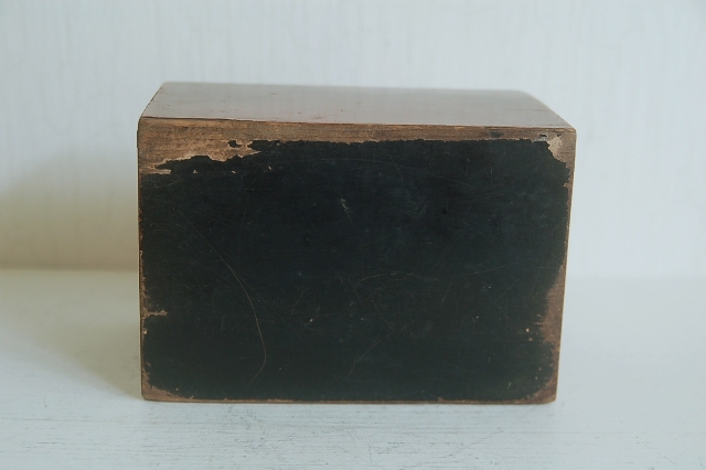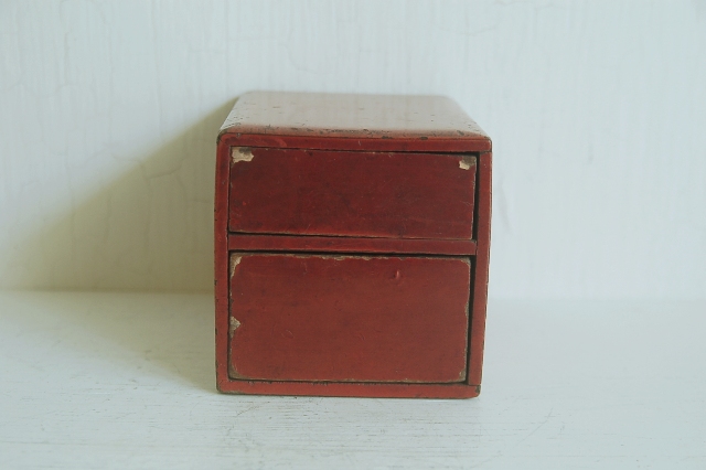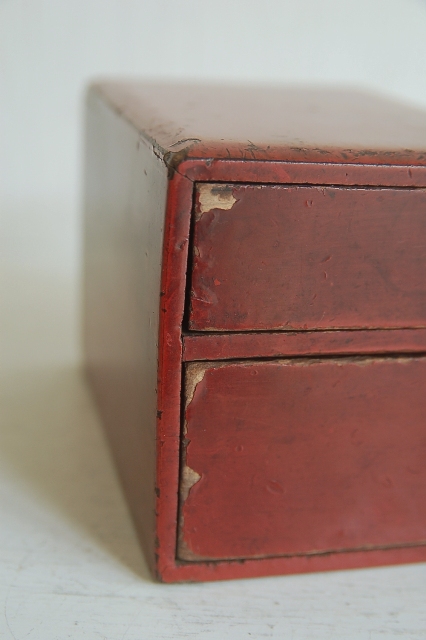 使い込まれた朱塗抽斗。本来はこの抽斗単体ではなく持ち運びなどの同様の塗りの化粧道具入などの箱にに入っていたもののだと思います。塗りは所々剥がれ、素地が見えている箇所もポツポツとございますが、塗りの落ち着いたくすんだ表情、自然な擦れは100年以上使われ経過しないとでない表情です。小物入れやお気に入りのコレクション、またはモノを飾る台としてもお使いいただけます。シンプルなだけに朱色一色の味わいが際立っています。