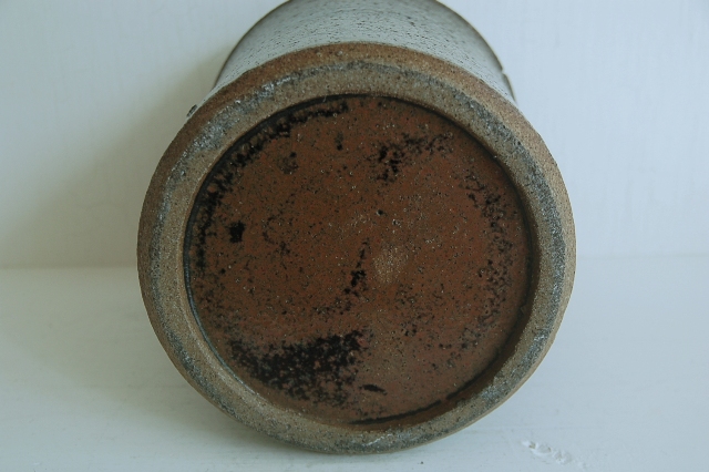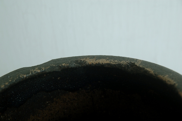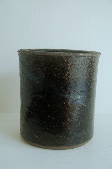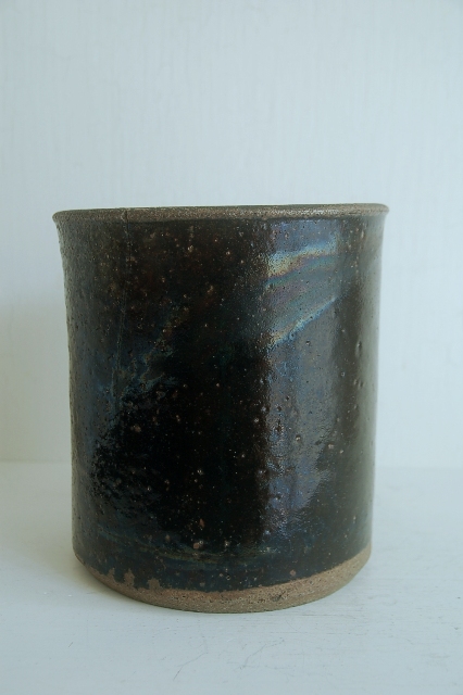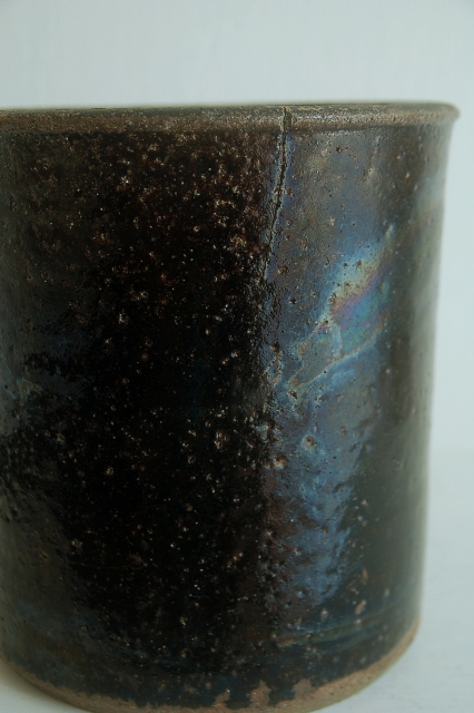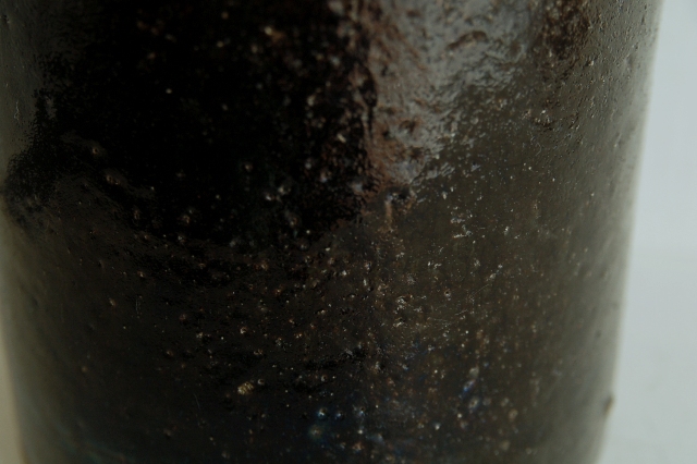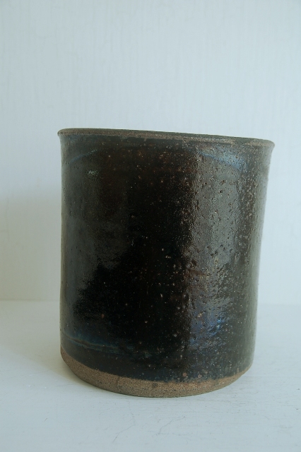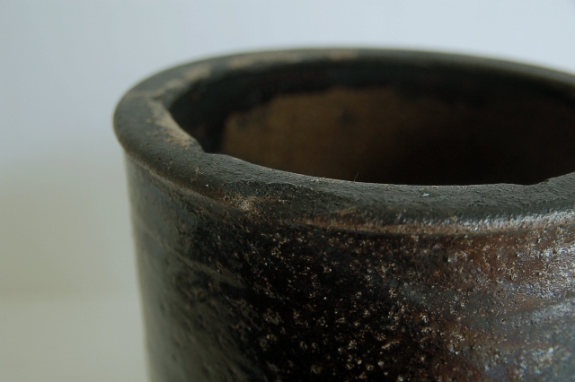 筒型の鰊鉢。本郷の鰊鉢と言えば長方形の飴釉薬が有名ですがこのようなシンプルなものも多く使われていました。こちらは実際に鰊の山椒漬けが漬けられていたもので乾燥すると長年しみこんだ塩分が釉薬の小さな穴から浮き出てきて表情を変化させます(現状は空気が乾燥すると塩が表面に現れ、湿っぽい時は消えます)。空気は乾燥した際の表情の変化はなかなかのもの、ニュウが白く浮き上がって見えます。黒い釉薬は野趣溢れ東北の力強さを感じます。ちょっと経筒を思い出せるような雰囲気も好感がもてます(肉厚でこちらの方が荒らしいですが)。この手のタイプは昭和〜明治にかけての物が多いのですがこちらは江戸の比較的古手のものです。