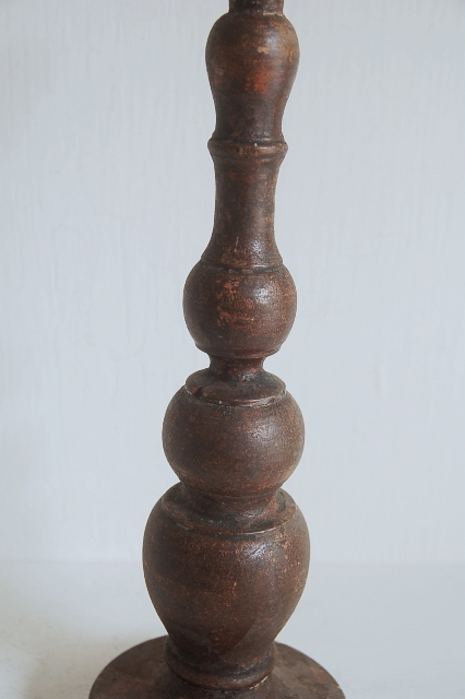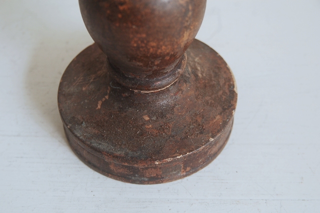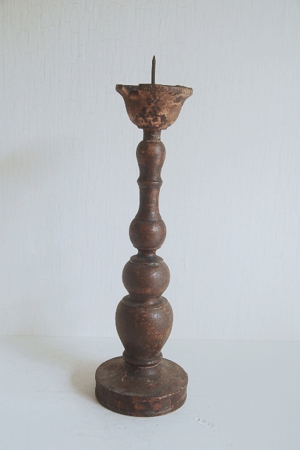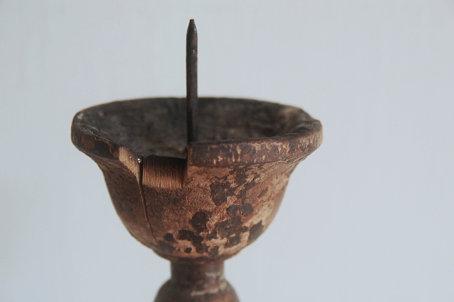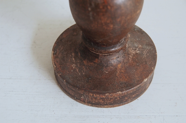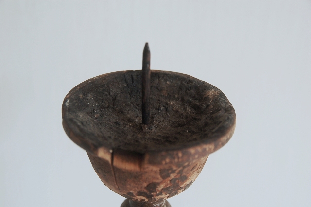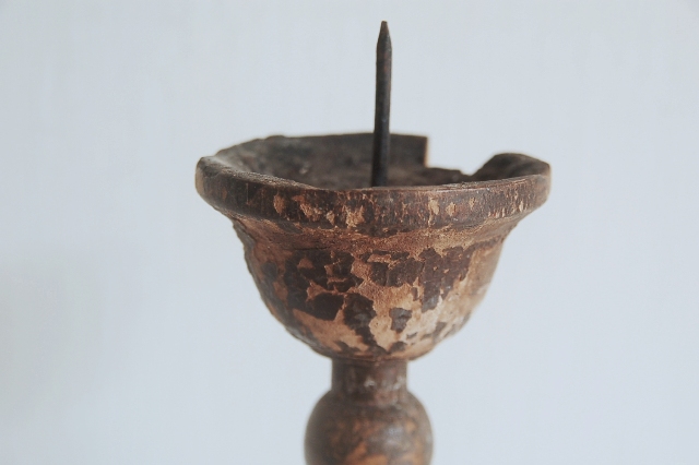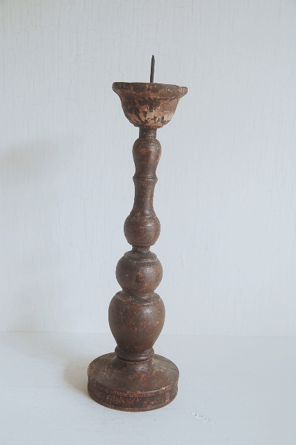 轆轤で挽かれ形成された木製の蜀台。長年の使用の為、塗りは剥がれ、乾燥し欠けている部分もありますが独特の存在感を放っています。材は硬木おそらく欅だと思います、質感も良くパッと見た感じ海外のもののように感じますが日本、東北のものこの手は寺院やある程度裕福な家で使われていたもの。関東から北にはしばしば見る事ができるものです。掃除や磨きなどは一切行っていないウブな状態です。和洋問わずどんな空間にもしっくりとくるはずです。