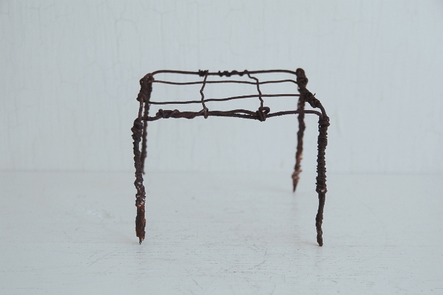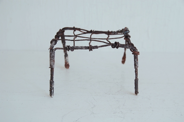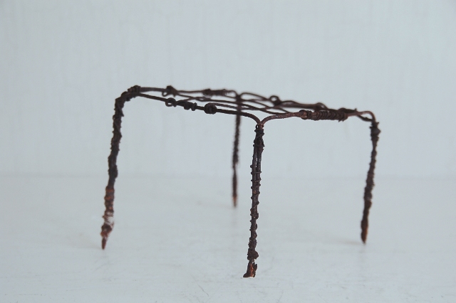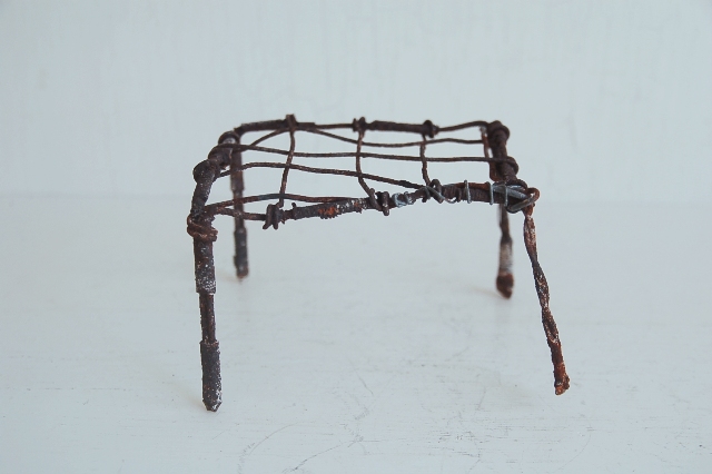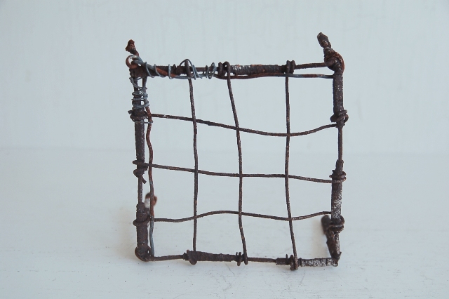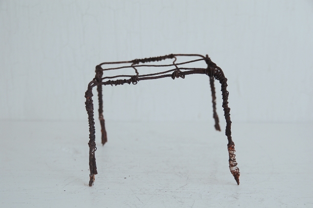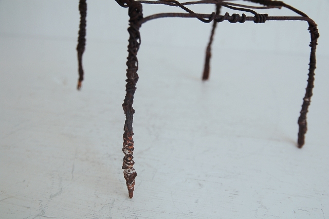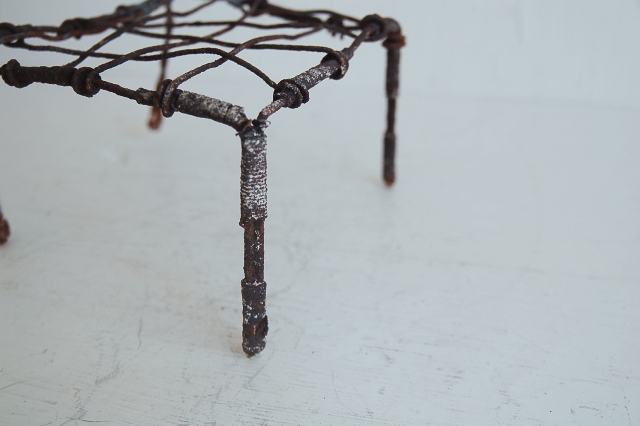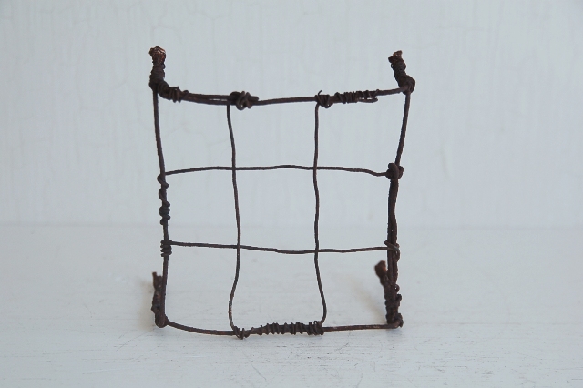 針金で作られた簡素な餅網(餅などを焼くためのもの、もしくは五徳)。職人が作ったものではなく素人作り。時間が経ち錆が現われ使い込まれてクタクタになり何ともいえない雰囲気を醸し出しています。錆がボロボロし、何とも頼りないその華奢さに惹かれます。ここまで素っ気ないと言うか、やる気のないと言うか脱力系の道具はなかなかないでしょう。使い方、飾り方によってはかなりおもしろいと思います。
