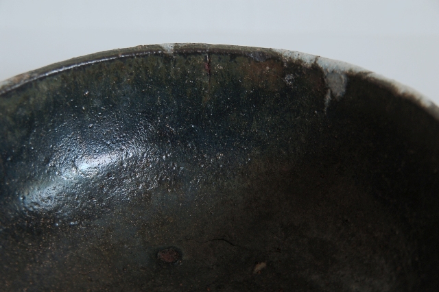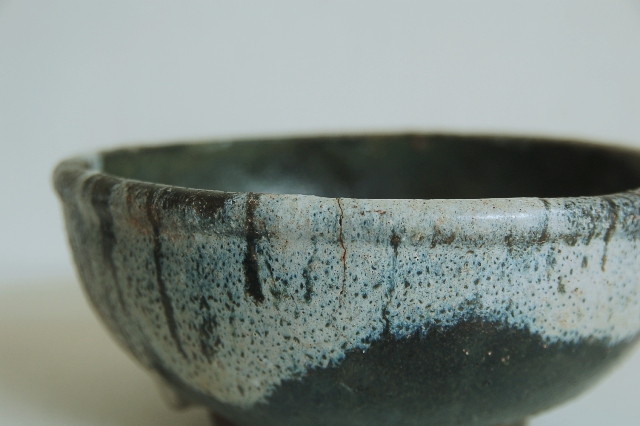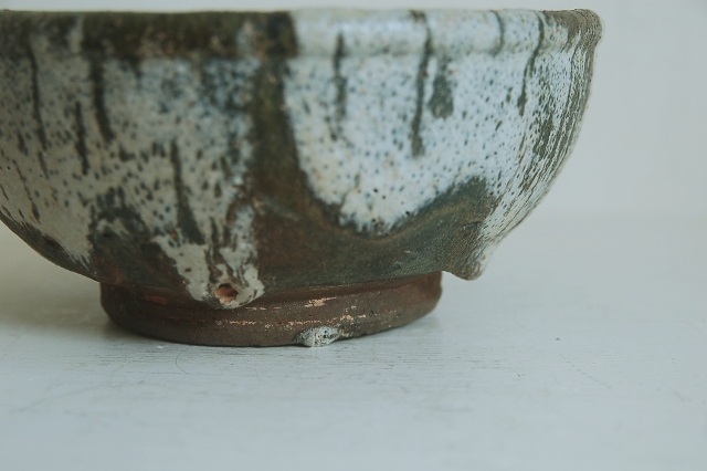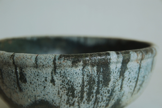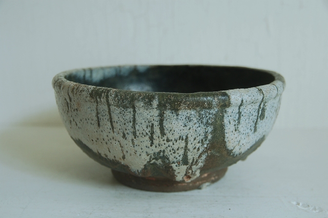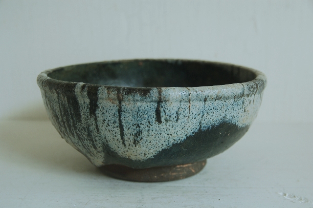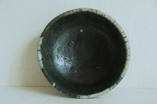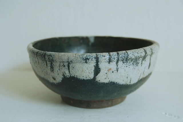 掛け流しの海鼠釉が印象的な堤焼の鉢。宮城県の仙台にある東北を代表する窯のひとつ。黒白の艶のある感じのものが多いですが、こちらはマッドな艶のおさえ目な感じ。釉薬はこれでもか!と言うほどたっぷり掛けられています。サイズも食卓で使える小ぶりなもの。大ぶりな水甕が有名ですがこちらは実用的。