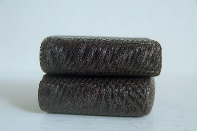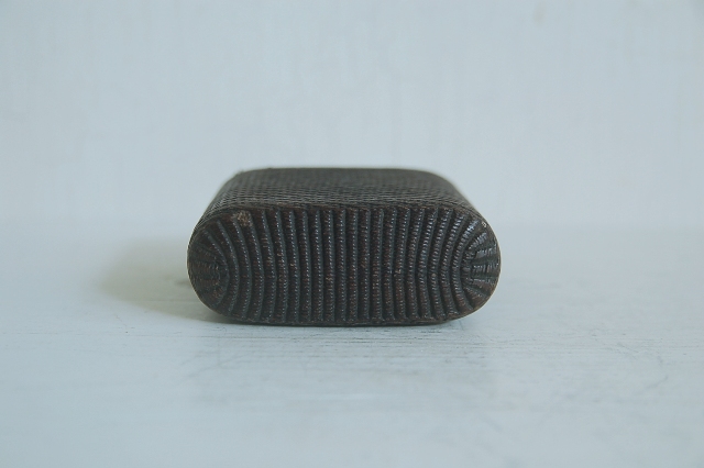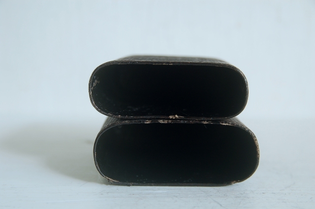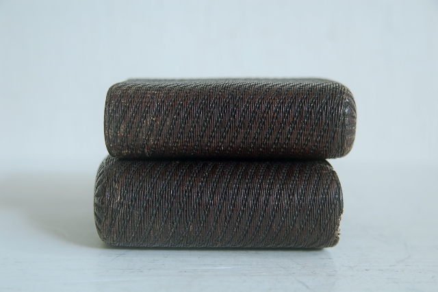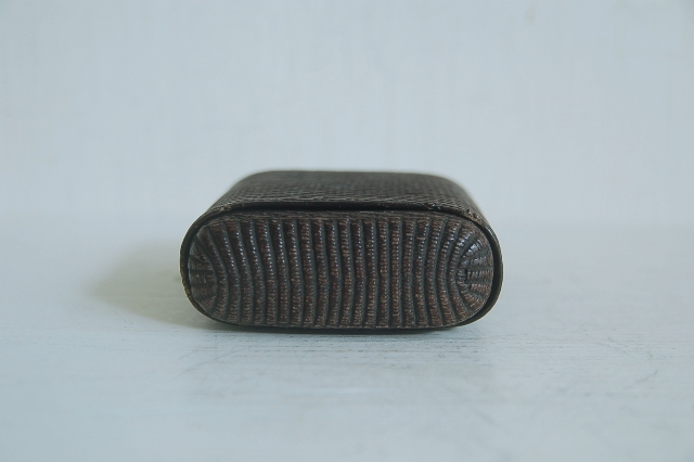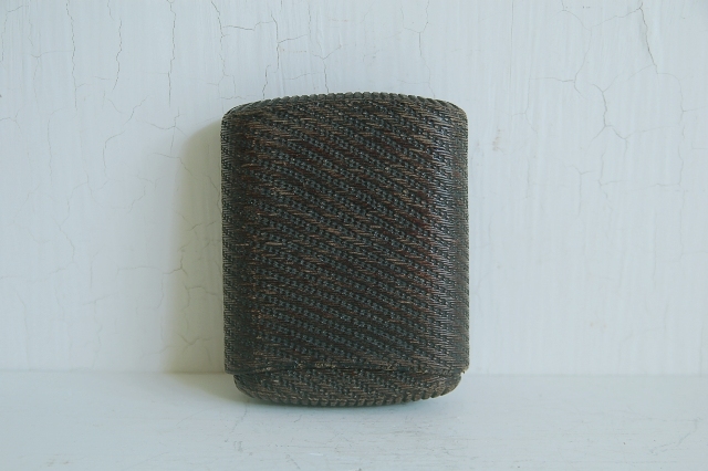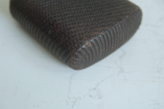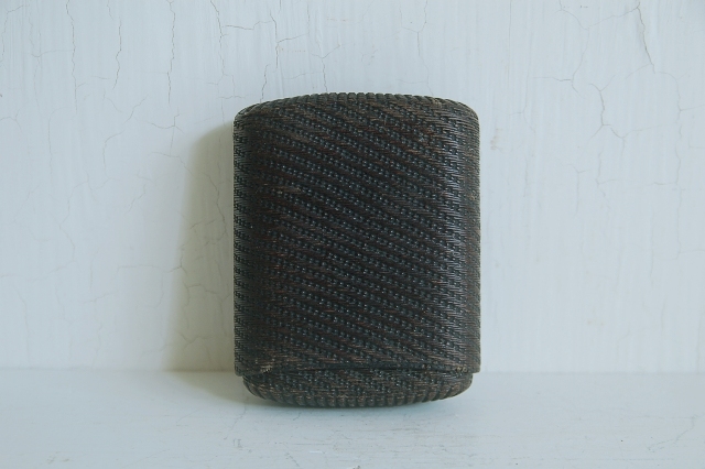 紙縒りに漆を施した煙草入れ。津軽の紙縒り細工かもしれません。もともと生活に苦しかった津軽藩の下級武士が内職で始めたのがきっかけの工芸品。書き損じた半紙を再利用したもので、紙縒りといえば李朝のものが頭に浮かぶかもしれませんが日本でも硝煙入、提げ物の類など結構多くあります。こちらのものは紙巻煙草が販売されるようになってからのものですので昭和の初め頃のものかと思います。スモーカーなら煙草入(ソフトパック)として、小物入れや小銭入れ、カード入れとなどにしても良いかと思います。まだまだ使えます。