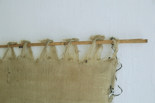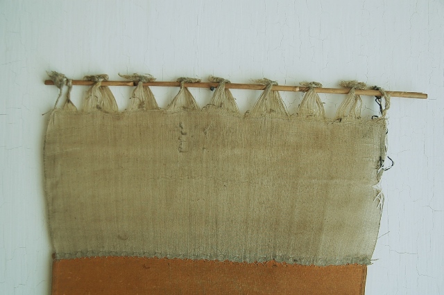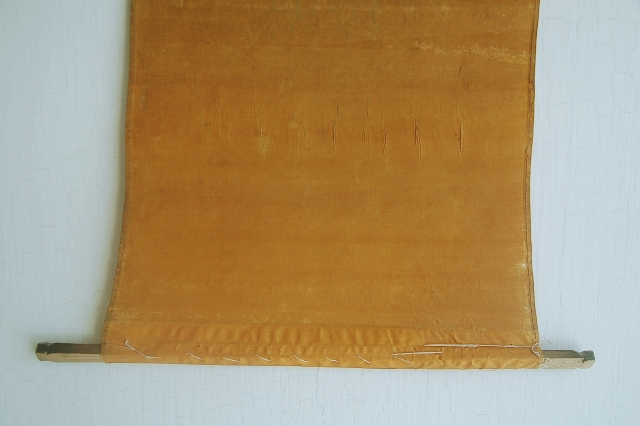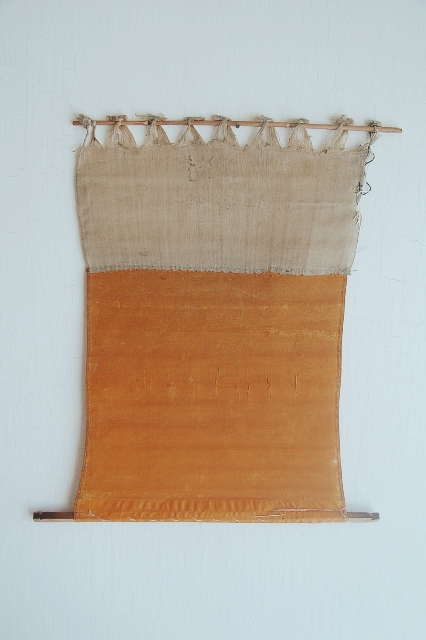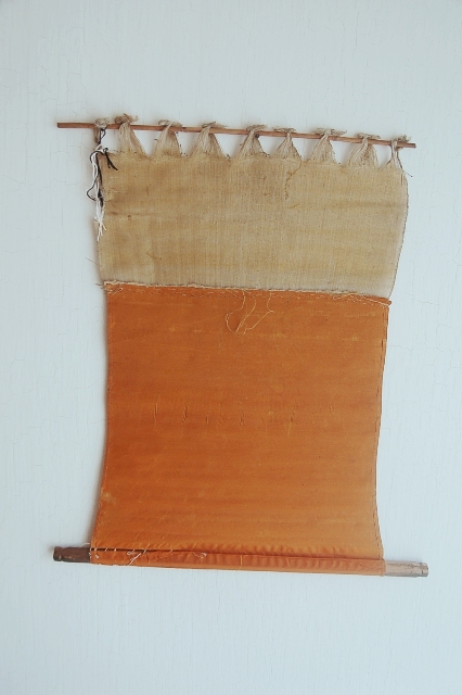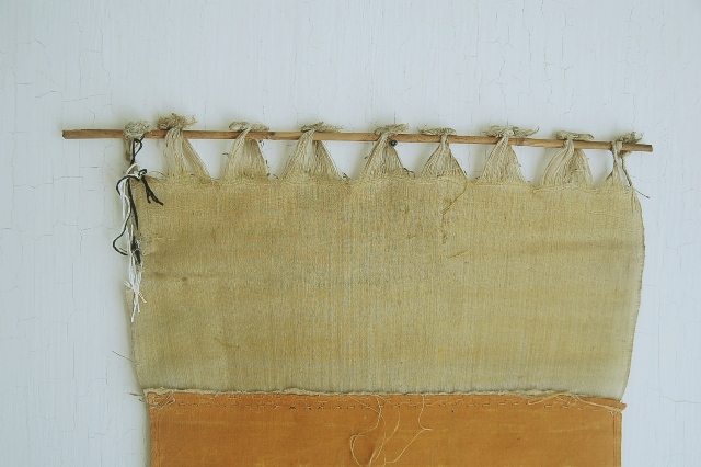 何の布だろうと考えてしまう品。海外のどこかの民族のものか?それとも仏教関係?と思われるかもしれませんが、機織に使われていた部品の一部なのです。壁に掛けるも良し、敷布としても良し。淡い山吹色が日本人の色彩感覚を刺激します。程好く経年変化した具合も魅力。