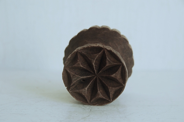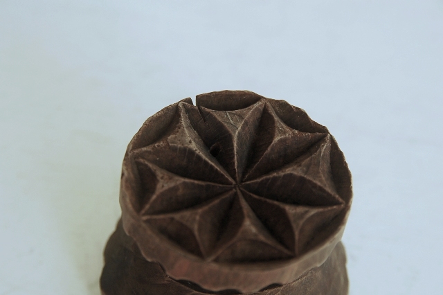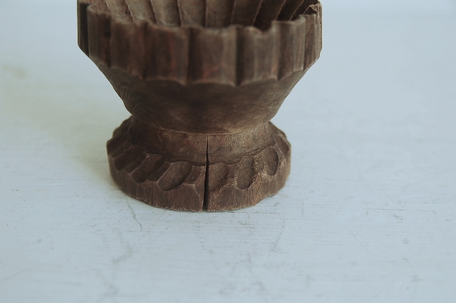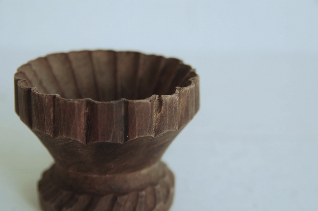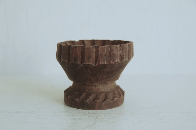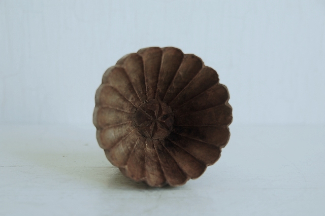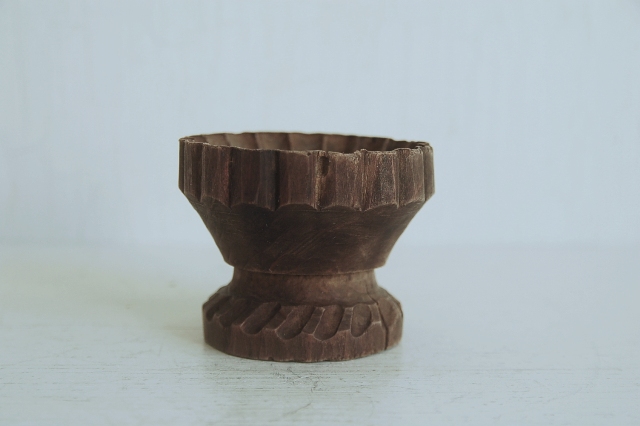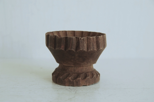 李朝の餅型。材は松。皆さんが思い浮かべるのは陶磁器のものだと思いますが木製のものも多くございます。上部が平面で高杯のような形が多いのですがこちらは本当に杯のような珍しい形です。内部もなかなかの彫具合、豪快で勢いを感じます。無論、底部分にも彫がございます。使うには少々勇気が要りますがぐいのみにも使えそうな小ぶりなサイズ。