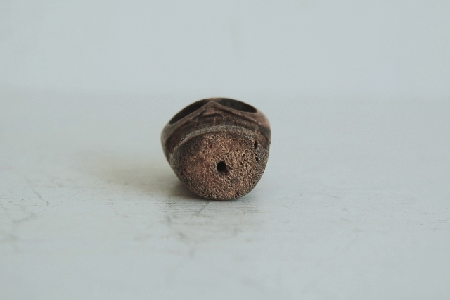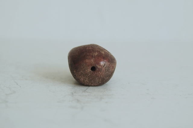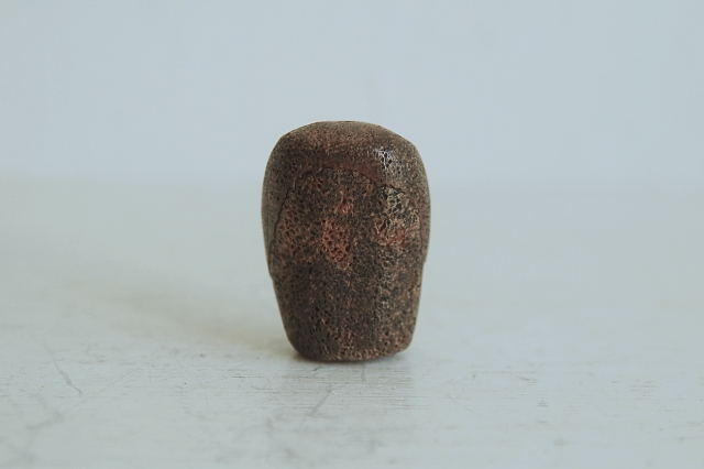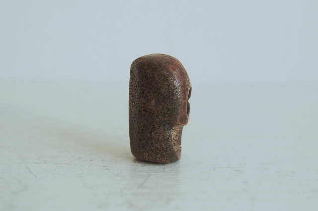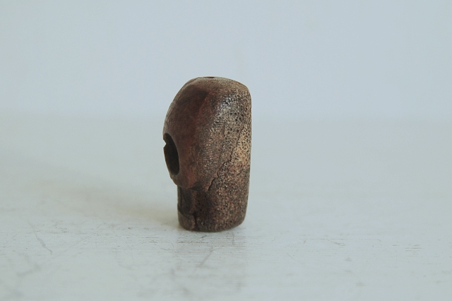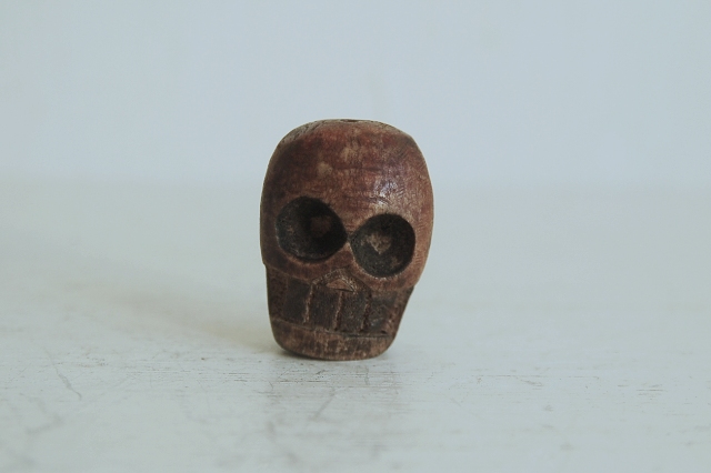 彫は大雑把ですが何とも愛くるしい髑髏(どくろ)です。鹿角の根元部分もしくは何かの骨が使われています。穴は上から下に空いていますので根付ではなく首飾り、数珠、装飾品に使われていたものと思います。山伏などが付けていたのでしょうか。時代は判別できませんが、近年造られたものではないものと判断しております。少なくとも明治くらいはあるかな?と思います。髑髏といってもおどろおどろしくなく、かわいく漫画ちっくで好感が持てる表情をしています。